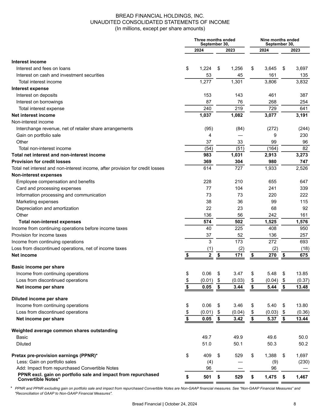 Bread Financial | October 24, 2024 8 Three months ended September 30, Nine months ended September 30, 2024 2023 2024 2023 Interest income Interest and fees on loans $ 1,224 $ 1,256 $ 3,645 $ 3,697 Interest on cash and investment securities 53 45 161 135 Total interest income 1,277 1,301 3,806 3,832 Interest expense Interest on deposits 153 143 461 387 Interest on borrowings 87 76 268 254 Total interest expense 240 219 729 641 Net interest income 1,037 1,082 3,077 3,191 Non-interest income Interchange revenue, net of retailer share arrangements (95) (84) (272) (244) Gain on portfolio sale 4 — 9 230 Other 37 33 99 96 Total non-interest income (54) (51) (164) 82 Total net interest and non-interest income 983 1,031 2,913 3,273 Provision for credit losses 369 304 980 747 Total net interest and non-interest income, after provision for credit losses 614 727 1,933 2,526 Non-interest expenses Employee compensation and benefits 228 210 655 647 Card and processing expenses 77 104 241 339 Information processing and communication 73 73 220 222 Marketing expenses 38 36 99 115 Depreciation and amortization 22 23 68 92 Other 136 56 242 161 Total non-interest expenses 574 502 1,525 1,576 Income from continuing operations before income taxes 40 225 408 950 Provision for income taxes 37 52 136 257 Income from continuing operations 3 173 272 693 Loss from discontinued operations, net of income taxes (1) (2) (2) (18) Net income $ 2 $ 171 $ 270 $ 675 Basic income per share Income from continuing operations $ 0.06 $ 3.47 $ 5.48 $ 13.85 Loss from discontinued operations $ (0.01) $ (0.03) $ (0.04) $ (0.37) Net income per share $ 0.05 $ 3.44 $ 5.44 $ 13.48 Diluted income per share Income from continuing operations $ 0.06 $ 3.46 $ 5.40 $ 13.80 Loss from discontinued operations $ (0.01) $ (0.04) $ (0.03) $ (0.36) Net income per share $ 0.05 $ 3.42 $ 5.37 $ 13.44 Weighted average common shares outstanding Basic 49.7 49.9 49.6 50.0 Diluted 51.0 50.1 50.3 50.2 Pretax pre-provision earnings (PPNR)* $ 409 $ 529 $ 1,388 $ 1,697 Less: Gain on portfolio sales (4) — (9) (230) Add: Impact from repurchased Convertible Notes 96 — 96 — PPNR excl. gain on portfolio sale and impact from repurchased Convertible Notes* $ 501 $ 529 $ 1,475 $ 1,467 BREAD FINANCIAL HOLDINGS, INC. UNAUDITED CONSOLIDATED STATEMENTS OF INCOME (In millions, except per share amounts) * PPNR and PPNR excluding gain on portfolio sale and impact from repurchased Convertible Notes are Non-GAAP financial measures. See “Non-GAAP Financial Measures” and "Reconciliation of GAAP to Non-GAAP Financial Measures".