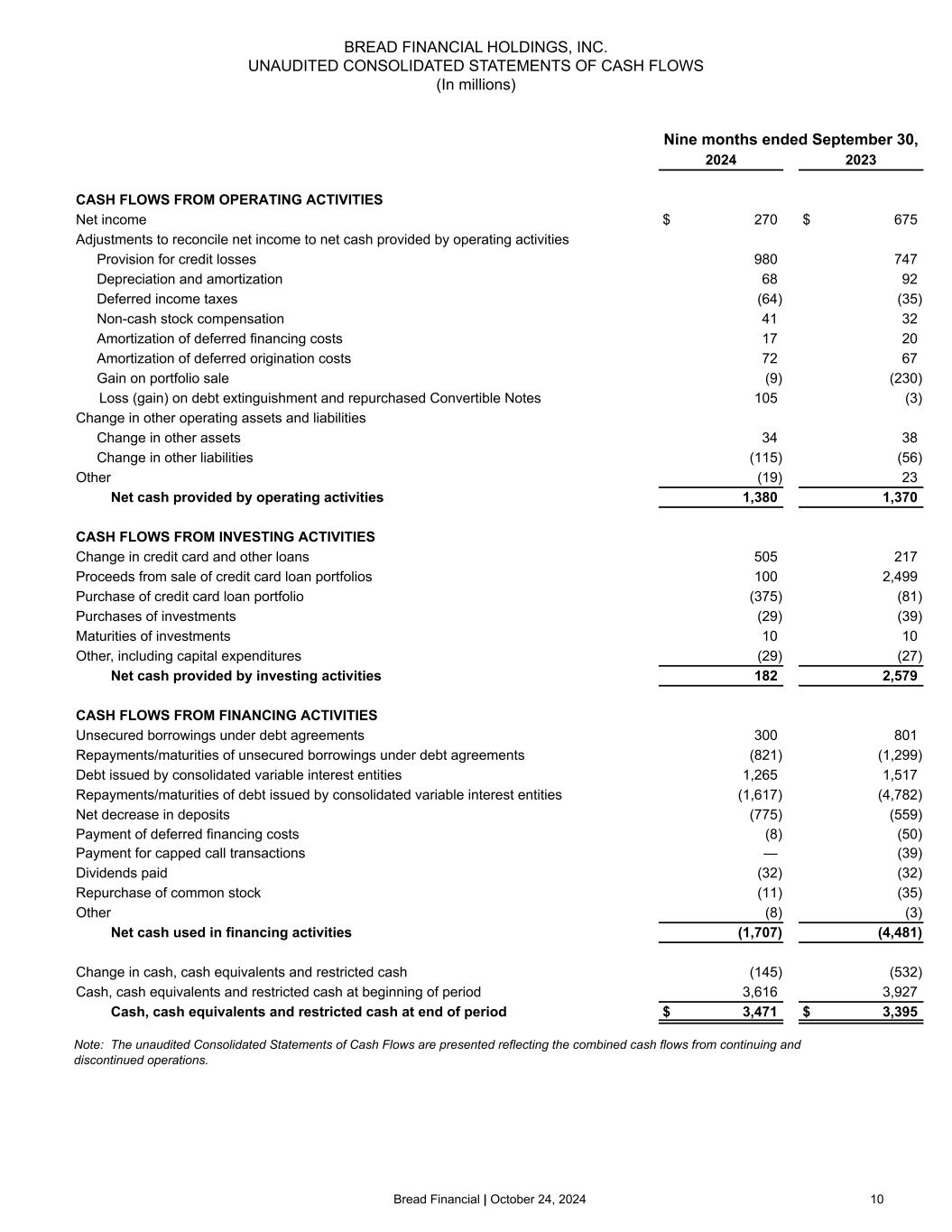 Bread Financial | October 24, 2024 9 BREAD FINANCIAL HOLDINGS, INC. UNAUDITED CONSOLIDATED BALANCE SHEETS (In millions) September 30, 2024 December 31, 2023 ASSETS Cash and cash equivalents $ 3,451 $ 3,590 Credit card and other loans Total credit card and other loans 17,933 19,333 Allowance for credit losses (2,190) (2,328) Credit card and other loans, net 15,743 17,005 Investments 277 253 Property and equipment, net 148 167 Goodwill and intangible assets, net 754 762 Other assets 1,363 1,364 Total assets $ 21,736 $ 23,141 LIABILITIES AND STOCKHOLDERS' EQUITY Deposits Direct-to-consumer (retail) $ 7,483 $ 6,454 Wholesale and other 5,364 7,166 Total deposits 12,847 13,620 Debt issued by consolidated variable interest entities 3,543 3,898 Long-term and other debt 1,041 1,394 Other liabilities 1,193 1,311 Total liabilities 18,624 20,223 Total stockholders’ equity 3,112 2,918 Total liabilities and stockholders’ equity $ 21,736 $ 23,141 Shares of common stock outstanding 49.7 49.3