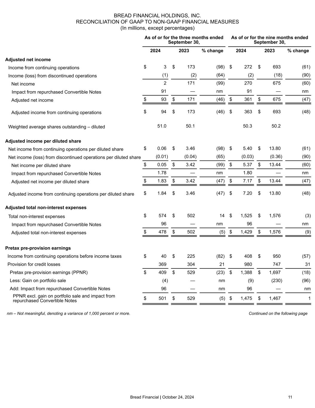 Bread Financial | October 24, 2024 11 BREAD FINANCIAL HOLDINGS, INC. RECONCILIATION OF GAAP TO NON-GAAP FINANCIAL MEASURES (In millions, except percentages) As of or for the three months ended September 30, As of or for the nine months ended September 30, 2024 2023 % change 2024 2023 % change Adjusted net income Income from continuing operations $ 3 $ 173 (98) $ 272 $ 693 (61) Income (loss) from discontinued operations (1) (2) (64) (2) (18) (90) Net income 2 171 (99) 270 675 (60) Impact from repurchased Convertible Notes 91 — nm 91 — nm Adjusted net income $ 93 $ 171 (46) $ 361 $ 675 (47) Adjusted income from continuing operations $ 94 $ 173 (46) $ 363 $ 693 (48) Weighted average shares outstanding – diluted 51.0 50.1 50.3 50.2 Adjusted income per diluted share Net income from continuing operations per diluted share $ 0.06 $ 3.46 (98) $ 5.40 $ 13.80 (61) Net income (loss) from discontinued operations per diluted share (0.01) (0.04) (65) (0.03) (0.36) (90) Net income per diluted share $ 0.05 $ 3.42 (99) $ 5.37 $ 13.44 (60) Impact from repurchased Convertible Notes 1.78 — nm 1.80 — nm Adjusted net income per diluted share $ 1.83 $ 3.42 (47) $ 7.17 $ 13.44 (47) Adjusted income from continuing operations per diluted share $ 1.84 $ 3.46 (47) $ 7.20 $ 13.80 (48) Adjusted total non-interest expenses Total non-interest expenses $ 574 $ 502 14 $ 1,525 $ 1,576 (3) Impact from repurchased Convertible Notes 96 — nm 96 — nm Adjusted total non-interest expenses $ 478 $ 502 (5) $ 1,429 $ 1,576 (9) Pretax pre-provision earnings Income from continuing operations before income taxes $ 40 $ 225 (82) $ 408 $ 950 (57) Provision for credit losses 369 304 21 980 747 31 Pretax pre-provision earnings (PPNR) $ 409 $ 529 (23) $ 1,388 $ 1,697 (18) Less: Gain on portfolio sale (4) — nm (9) (230) (96) Add: Impact from repurchased Convertible Notes 96 — nm 96 — nm PPNR excl. gain on portfolio sale and impact from repurchased Convertible Notes $ 501 $ 529 (5) $ 1,475 $ 1,467 1 nm – Not meaningful, denoting a variance of 1,000 percent or more. Continued on the following page Continued on the following page