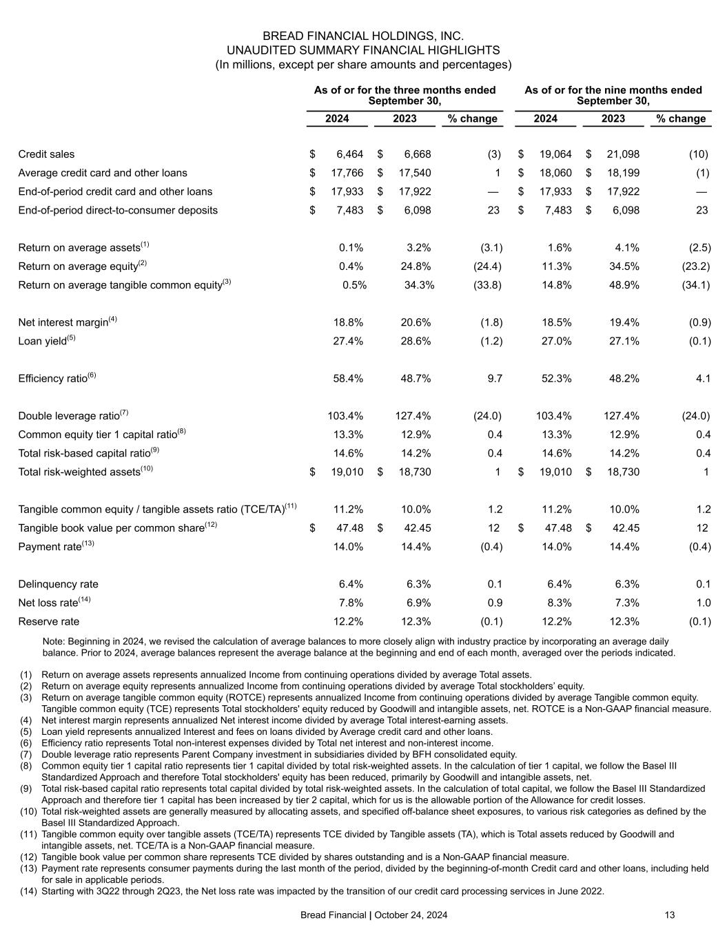 Bread Financial | October 24, 2024 12 BREAD FINANCIAL HOLDINGS, INC. RECONCILIATION OF GAAP TO NON-GAAP FINANCIAL MEASURES (In millions, except percentages) As of or for the three months ended September 30, As of or for the nine months ended September 30, 2024 2023 % change 2024 2023 % change Average Tangible common equity Average Total stockholders’ equity 3,314 2,795 19 3,213 2,674 20 Less: average Goodwill and intangible assets, net (748) (775) (4) (753) (785) (4) Average Tangible common equity $ 2,566 $ 2,020 27 $ 2,460 $ 1,889 30 Tangible common equity (TCE) Total stockholders’ equity 3,112 2,864 9 3,112 2,864 9 Less: Goodwill and intangible assets, net (754) (771) (2) (754) (771) (2) Tangible common equity (TCE) $ 2,358 $ 2,093 13 $ 2,358 $ 2,093 13 Tangible assets (TA) Total assets 21,736 21,608 1 21,736 21,608 1 Less: Goodwill and intangible assets, net (754) (771) (2) (754) (771) (2) Tangible assets (TA) $ 20,982 $ 20,837 1 $ 20,982 $ 20,837 1 Continued on the following page