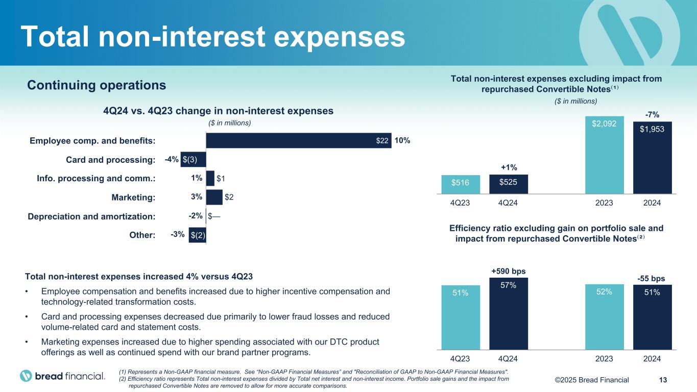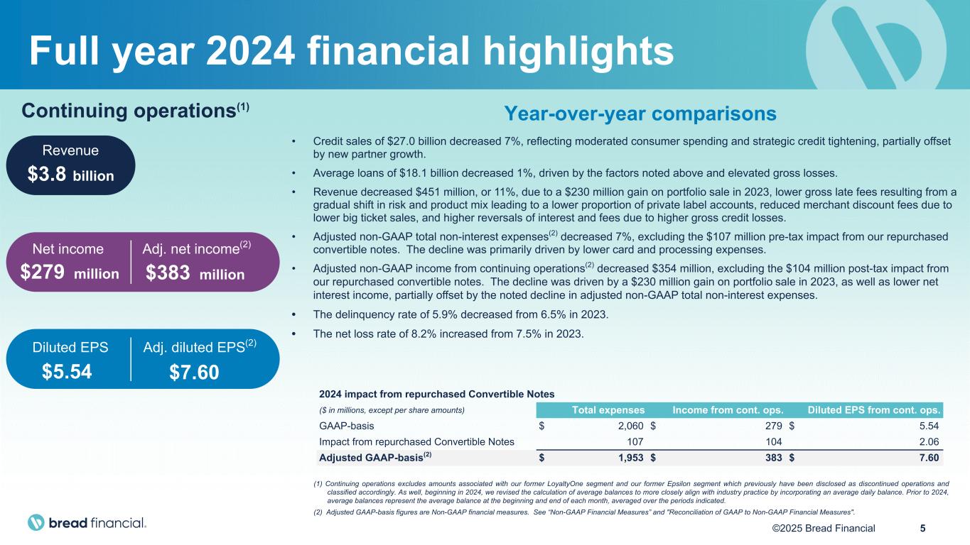 6©2025 Bread Financial $0.9 billion (1) Continuing operations excludes amounts associated with our former LoyaltyOne segment and our former Epsilon segment which previously have been disclosed as discontinued operations and classified accordingly. As well, beginning in 2024, we revised the calculation of average balances to more closely align with industry practice by incorporating an average daily balance. Prior to 2024, average balances represent the average balance at the beginning and end of each month, averaged over the periods indicated. (2) Adjusted GAAP-basis figures are Non-GAAP financial measures. See “Non-GAAP Financial Measures” and "Reconciliation of GAAP to Non-GAAP Financial Measures". Continuing operations(1) Revenue 4Q24 impact from repurchased Convertible Notes ($ in millions, except per share amounts) Total expenses Income from cont. ops. Diluted EPS from cont. ops. GAAP-basis $ 536 $ 8 $ 0.15 Impact from repurchased Convertible Notes 11 13 0.26 Adjusted GAAP-basis(2) $ 525 $ 21 $ 0.41 Year-over-year comparisons • Credit sales of $7.9 billion increased 1%, primarily reflecting new partner growth and stronger holiday sales. • Average loans of $18.2 billion decreased 1%, primarily driven by lower full year credit sales and elevated gross losses. • Revenue decreased $91 million, or 9%, primarily due to lower finance charges and late fees resulting from a lower average prime rate and our gradual shift in risk and product mix leading to a lower proportion of private label accounts as well as reduced merchant discount fees due to lower big ticket credit sales. • Total non-interest expenses increased $20 million, or 4%, primarily driven by an increase in employee compensation and benefits costs of $22 million and an $11 million pre-tax impact from our repurchased convertible notes. Excluding the impact from our repurchased convertible notes, adjusted non-GAAP total non-interest expenses(2) increased 1%. • Income from continuing operations decreased $37 million, or 83%, primarily due to lower net interest income and higher total non-interest expenses and a $13 million post-tax impact from our repurchased convertible notes, partially offset by a lower provision for credit losses. • The delinquency rate of 5.9% decreased from 6.5% in the fourth quarter of 2023. • The net loss rate of 8.0% remained flat to the fourth quarter of 2023.Diluted EPS Adj. diluted EPS(2) Net income Adj. net income(2) $8 million $21 million $0.41$0.15 Fourth quarter 2024 financial highlights
