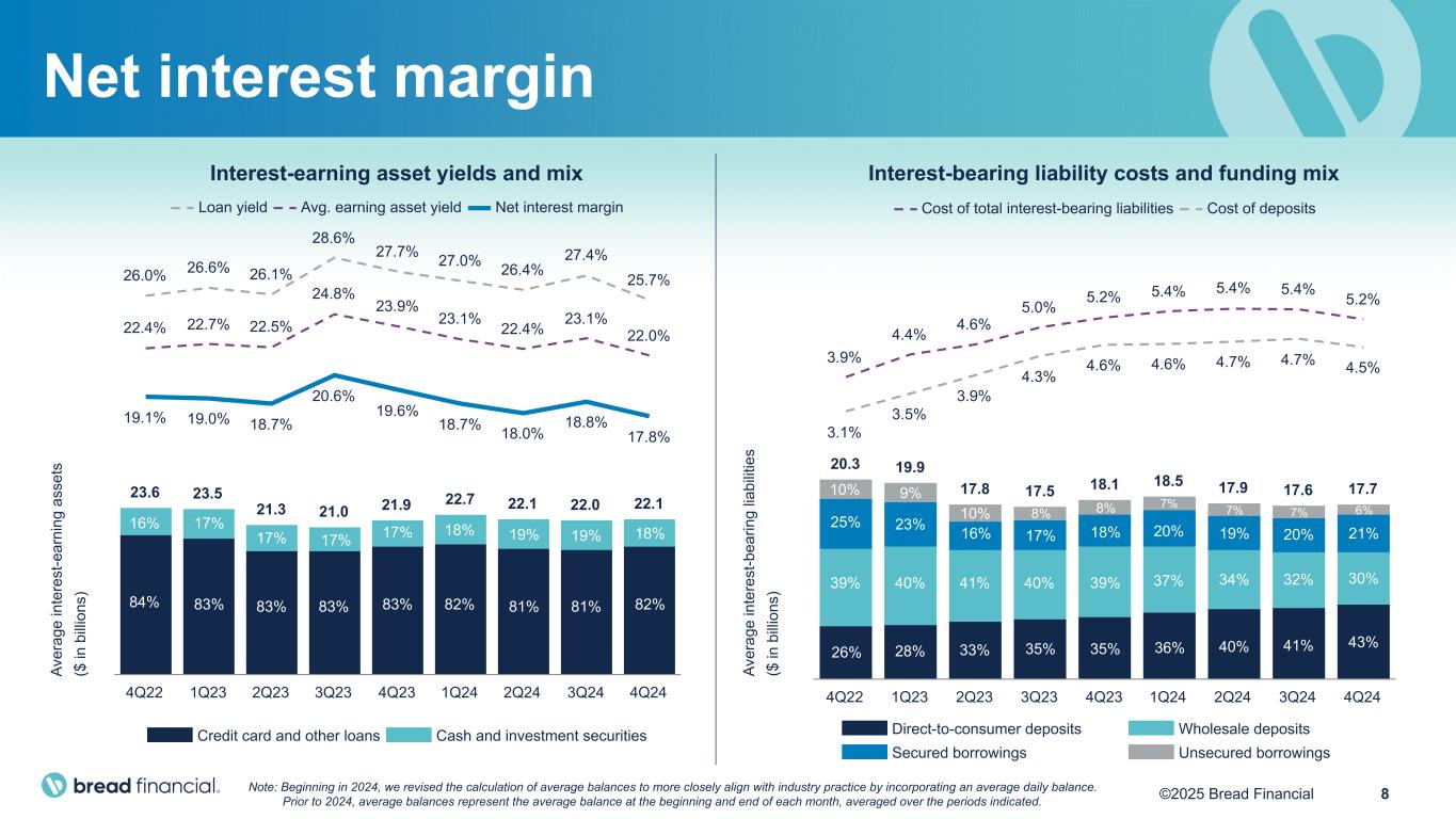8©2025 Bread Financial 20.3 19.9 17.8 17.5 18.1 18.5 17.9 17.6 17.7 Direct-to-consumer deposits Wholesale deposits Secured borrowings Unsecured borrowings 4Q22 1Q23 2Q23 3Q23 4Q23 1Q24 2Q24 3Q24 4Q24 23.6 23.5 21.3 21.0 21.9 22.7 22.1 22.0 22.1 Credit card and other loans Cash and investment securities 4Q22 1Q23 2Q23 3Q23 4Q23 1Q24 2Q24 3Q24 4Q24 Av er ag e in te re st -b ea rin g lia bi lit ie s ($ in b ill io ns ) Av er ag e in te re st -e ar ni ng a ss et s ($ in b ill io ns ) Interest-earning asset yields and mix 26.0% 26.6% 26.1% 28.6% 27.7% 27.0% 26.4% 27.4% 25.7% 22.4% 22.7% 22.5% 24.8% 23.9% 23.1% 22.4% 23.1% 22.0% 19.1% 19.0% 18.7% 20.6% 19.6% 18.7% 18.0% 18.8% 17.8% Loan yield Avg. earning asset yield Net interest margin Interest-bearing liability costs and funding mix 3.9% 4.4% 4.6% 5.0% 5.2% 5.4% 5.4% 5.4% 5.2% 3.1% 3.5% 3.9% 4.3% 4.6% 4.6% 4.7% 4.7% 4.5% Cost of total interest-bearing liabilities Cost of deposits Net interest margin 84% 83% 83% 83% 83% 82% 81% 81% 82% 16% 17% 17% 17% 17% 18% 19% 19% 18% 25% 23% 16% 17% 18% 20% 19% 20% 21% 10% 9% 10% 8% 8% 7% 7% 7% 6% 26% 28% 33% 35% 35% 36% 40% 41% 43% 39% 40% 41% 40% 39% 37% 34% 32% 30% Note: Beginning in 2024, we revised the calculation of average balances to more closely align with industry practice by incorporating an average daily balance. Prior to 2024, average balances represent the average balance at the beginning and end of each month, averaged over the periods indicated.