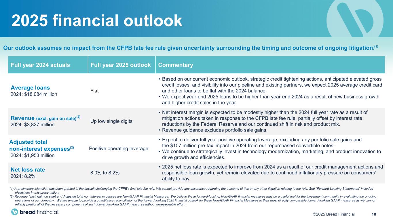 23©2025 Bread Financial Forward-looking statements This release contains forward-looking statements within the meaning of Section 27A of the Securities Act of 1933 and Section 21E of the Securities Exchange Act of 1934. Forward-looking statements give our expectations or forecasts of future events and can generally be identified by the use of words such as “believe,” “expect,” “anticipate,” “estimate,” “intend,” “project,” “plan,” “likely,” “may,” “should” or other words or phrases of similar import. Similarly, statements that describe our business strategy, outlook, objectives, plans, intentions or goals also are forward-looking statements. Examples of forward-looking statements include, but are not limited to, statements we make regarding, and the guidance we give with respect to, our anticipated operating or financial results, future financial performance and outlook, future dividend declarations, and future economic conditions. We believe that our expectations are based on reasonable assumptions. Forward-looking statements, however, are subject to a number of risks and uncertainties that are difficult to predict and, in many cases, beyond our control. Accordingly, our actual results could differ materially from the projections, anticipated results or other expectations expressed in this release, and no assurances can be given that our expectations will prove to have been correct. Factors that could cause the outcomes to differ materially include, but are not limited to, the following: macroeconomic conditions, including market conditions, inflation, interest rates, labor market conditions, recessionary pressures or concerns over a prolonged economic slowdown, and the related impact on consumer spending behavior, payments, debt levels, savings rates and other behaviors; global political and public health events and conditions, including ongoing wars and military conflicts and natural disasters; future credit performance, including the level of future delinquency and write-off rates; the loss of, or reduction in demand from, significant brand partners or customers in the highly competitive markets in which we compete; the concentration of our business in U.S. consumer credit; inaccuracies in the models and estimates on which we rely, including the amount of our Allowance for credit losses and our credit risk management models; the inability to realize the intended benefits of acquisitions, dispositions and other strategic initiatives; our level of indebtedness and ability to access financial or capital markets; pending and future federal and state legislation, regulation, supervisory guidance, and regulatory and legal actions, including, but not limited to, those related to financial regulatory reform and consumer financial services practices, as well as any such actions with respect to late fees, interchange fees or other charges; impacts arising from or relating to the transition of our credit card processing services to third party service providers that we completed in 2022; failures or breaches in our operational or security systems, including as a result of cyberattacks, unanticipated impacts from technology modernization projects or otherwise; and any tax or other liability or adverse impacts arising out of or related to the spinoff of our former LoyaltyOne segment or the bankruptcy filings of Loyalty Ventures Inc. (LVI) and certain of its subsidiaries and subsequent litigation or other disputes. In addition, the Consumer Financial Protection Bureau (CFPB) has issued a final rule that, absent a successful legal challenge, will place significant limits on credit card late fees, which would have a significant impact on our business and results of operations for at least the short term and, depending on the effectiveness of the mitigating actions that we have taken or may in the future take in anticipation of, or in response to, the final rule, may potentially adversely impact us over the long term; we cannot provide any assurance as to the effective date of the rule, the result of any pending or future challenges or other litigation relating to the rule, or our ability to mitigate or offset the impact of the rule on our business and results of operations. The foregoing factors, along with other risks and uncertainties that could cause actual results to differ materially from those expressed or implied in forward-looking statements, are described in greater detail under the headings “Risk Factors” and “Management’s Discussion and Analysis of Financial Condition and Results of Operations” in our Annual Report on Form 10-K for the most recently ended fiscal year, which may be updated in Item 1A of, or elsewhere in, our Quarterly Reports on Form 10-Q filed for periods subsequent to such Form 10-K. Our forward-looking statements speak only as of the date made, and we undertake no obligation, other than as required by applicable law, to update or revise any forward-looking statements, whether as a result of new information, subsequent events, anticipated or unanticipated circumstances or otherwise.