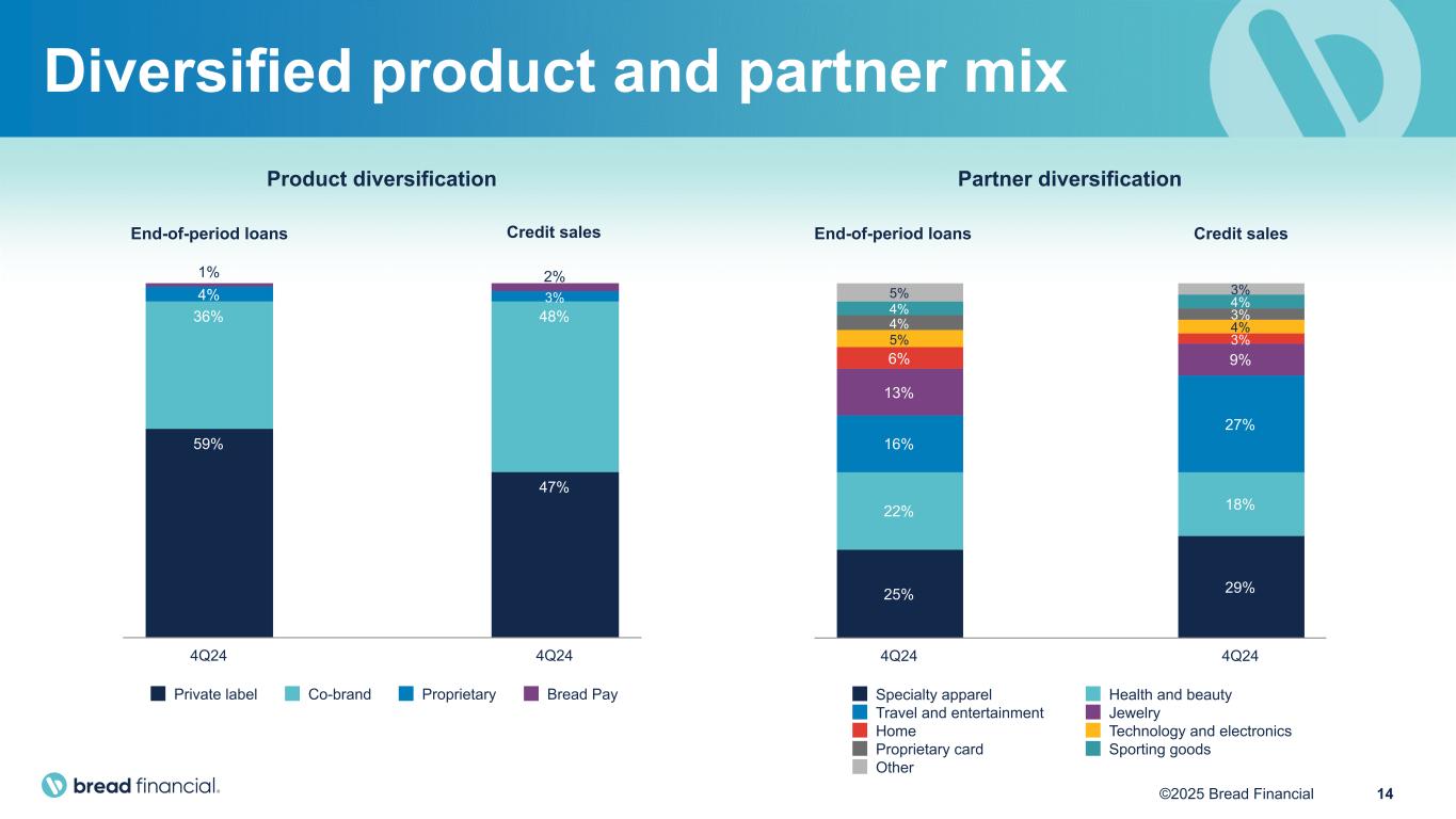 23©2025 Bread Financial Forward-looking statements This release contains forward-looking statements within the meaning of Section 27A of the Securities Act of 1933 and Section 21E of the Securities Exchange Act of 1934. Forward-looking statements give our expectations or forecasts of future events and can generally be identified by the use of words such as “believe,” “expect,” “anticipate,” “estimate,” “intend,” “project,” “plan,” “likely,” “may,” “should” or other words or phrases of similar import. Similarly, statements that describe our business strategy, outlook, objectives, plans, intentions or goals also are forward-looking statements. Examples of forward-looking statements include, but are not limited to, statements we make regarding, and the guidance we give with respect to, our anticipated operating or financial results, future financial performance and outlook, future dividend declarations, and future economic conditions. We believe that our expectations are based on reasonable assumptions. Forward-looking statements, however, are subject to a number of risks and uncertainties that are difficult to predict and, in many cases, beyond our control. Accordingly, our actual results could differ materially from the projections, anticipated results or other expectations expressed in this release, and no assurances can be given that our expectations will prove to have been correct. Factors that could cause the outcomes to differ materially include, but are not limited to, the following: macroeconomic conditions, including market conditions, inflation, interest rates, labor market conditions, recessionary pressures or concerns over a prolonged economic slowdown, and the related impact on consumer spending behavior, payments, debt levels, savings rates and other behaviors; global political and public health events and conditions, including ongoing wars and military conflicts and natural disasters; future credit performance, including the level of future delinquency and write-off rates; the loss of, or reduction in demand from, significant brand partners or customers in the highly competitive markets in which we compete; the concentration of our business in U.S. consumer credit; inaccuracies in the models and estimates on which we rely, including the amount of our Allowance for credit losses and our credit risk management models; the inability to realize the intended benefits of acquisitions, dispositions and other strategic initiatives; our level of indebtedness and ability to access financial or capital markets; pending and future federal and state legislation, regulation, supervisory guidance, and regulatory and legal actions, including, but not limited to, those related to financial regulatory reform and consumer financial services practices, as well as any such actions with respect to late fees, interchange fees or other charges; impacts arising from or relating to the transition of our credit card processing services to third party service providers that we completed in 2022; failures or breaches in our operational or security systems, including as a result of cyberattacks, unanticipated impacts from technology modernization projects or otherwise; and any tax or other liability or adverse impacts arising out of or related to the spinoff of our former LoyaltyOne segment or the bankruptcy filings of Loyalty Ventures Inc. (LVI) and certain of its subsidiaries and subsequent litigation or other disputes. In addition, the Consumer Financial Protection Bureau (CFPB) has issued a final rule that, absent a successful legal challenge, will place significant limits on credit card late fees, which would have a significant impact on our business and results of operations for at least the short term and, depending on the effectiveness of the mitigating actions that we have taken or may in the future take in anticipation of, or in response to, the final rule, may potentially adversely impact us over the long term; we cannot provide any assurance as to the effective date of the rule, the result of any pending or future challenges or other litigation relating to the rule, or our ability to mitigate or offset the impact of the rule on our business and results of operations. The foregoing factors, along with other risks and uncertainties that could cause actual results to differ materially from those expressed or implied in forward-looking statements, are described in greater detail under the headings “Risk Factors” and “Management’s Discussion and Analysis of Financial Condition and Results of Operations” in our Annual Report on Form 10-K for the most recently ended fiscal year, which may be updated in Item 1A of, or elsewhere in, our Quarterly Reports on Form 10-Q filed for periods subsequent to such Form 10-K. Our forward-looking statements speak only as of the date made, and we undertake no obligation, other than as required by applicable law, to update or revise any forward-looking statements, whether as a result of new information, subsequent events, anticipated or unanticipated circumstances or otherwise.