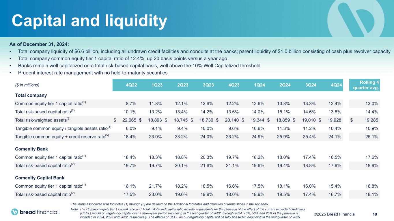 19©2025 Bread Financial ($ in millions) 4Q22 1Q23 2Q23 3Q23 4Q23 1Q24 2Q24 3Q24 4Q24 Rolling 4 quarter avg. Total company Common equity tier 1 capital ratio(1) 8.7% 11.8% 12.1% 12.9% 12.2% 12.6% 13.8% 13.3% 12.4% 13.0% Total risk-based capital ratio(2) 10.1% 13.2% 13.4% 14.2% 13.6% 14.0% 15.1% 14.6% 13.8% 14.4% Total risk-weighted assets(3) $ 22,065 $ 18,893 $ 18,745 $ 18,730 $ 20,140 $ 19,344 $ 18,859 $ 19,010 $ 19,928 $ 19,285 Tangible common equity / tangible assets ratio(4) 6.0% 9.1% 9.4% 10.0% 9.6% 10.6% 11.3% 11.2% 10.4% 10.9% Tangible common equity + credit reserve rate(5) 18.4% 23.0% 23.2% 24.0% 23.2% 24.9% 25.9% 25.4% 24.1% 25.1% Comenity Bank Common equity tier 1 capital ratio(1) 18.4% 18.3% 18.8% 20.3% 19.7% 18.2% 18.0% 17.4% 16.5% 17.6% Total risk-based capital ratio(2) 19.7% 19.7% 20.1% 21.6% 21.1% 19.6% 19.4% 18.8% 17.9% 18.9% Comenity Capital Bank Common equity tier 1 capital ratio(1) 16.1% 21.7% 18.2% 18.5% 16.6% 17.5% 18.1% 16.0% 15.4% 16.8% Total risk-based capital ratio(2) 17.5% 23.0% 19.6% 19.9% 18.0% 18.9% 19.5% 17.4% 16.7% 18.1% As of December 31, 2024: • Total company liquidity of $6.6 billion, including all undrawn credit facilities and conduits at the banks; parent liquidity of $1.0 billion consisting of cash plus revolver capacity • Total company common equity tier 1 capital ratio of 12.4%, up 20 basis points versus a year ago • Banks remain well capitalized on a total risk-based capital basis, well above the 10% Well Capitalized threshold • Prudent interest rate management with no held-to-maturity securities Capital and liquidity The terms associated with footnotes (1) through (5) are defined on the Additional footnotes and definition of terms slides in the Appendix. Note: The Common equity tier 1 capital ratio and Total risk-based capital ratio include adjustments for the phase-in of the effect of the current expected credit loss (CECL) model on regulatory capital over a three-year period beginning in the first quarter of 2022, through 2024. 75%, 50% and 25% of the phase-in is included in 2024, 2023 and 2022, respectively. The effects of CECL on our regulatory capital will be fully phased-in beginning in the first quarter of 2025.