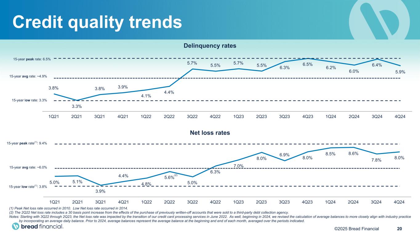 23©2025 Bread Financial Forward-looking statements This release contains forward-looking statements within the meaning of Section 27A of the Securities Act of 1933 and Section 21E of the Securities Exchange Act of 1934. Forward-looking statements give our expectations or forecasts of future events and can generally be identified by the use of words such as “believe,” “expect,” “anticipate,” “estimate,” “intend,” “project,” “plan,” “likely,” “may,” “should” or other words or phrases of similar import. Similarly, statements that describe our business strategy, outlook, objectives, plans, intentions or goals also are forward-looking statements. Examples of forward-looking statements include, but are not limited to, statements we make regarding, and the guidance we give with respect to, our anticipated operating or financial results, future financial performance and outlook, future dividend declarations, and future economic conditions. We believe that our expectations are based on reasonable assumptions. Forward-looking statements, however, are subject to a number of risks and uncertainties that are difficult to predict and, in many cases, beyond our control. Accordingly, our actual results could differ materially from the projections, anticipated results or other expectations expressed in this release, and no assurances can be given that our expectations will prove to have been correct. Factors that could cause the outcomes to differ materially include, but are not limited to, the following: macroeconomic conditions, including market conditions, inflation, interest rates, labor market conditions, recessionary pressures or concerns over a prolonged economic slowdown, and the related impact on consumer spending behavior, payments, debt levels, savings rates and other behaviors; global political and public health events and conditions, including ongoing wars and military conflicts and natural disasters; future credit performance, including the level of future delinquency and write-off rates; the loss of, or reduction in demand from, significant brand partners or customers in the highly competitive markets in which we compete; the concentration of our business in U.S. consumer credit; inaccuracies in the models and estimates on which we rely, including the amount of our Allowance for credit losses and our credit risk management models; the inability to realize the intended benefits of acquisitions, dispositions and other strategic initiatives; our level of indebtedness and ability to access financial or capital markets; pending and future federal and state legislation, regulation, supervisory guidance, and regulatory and legal actions, including, but not limited to, those related to financial regulatory reform and consumer financial services practices, as well as any such actions with respect to late fees, interchange fees or other charges; impacts arising from or relating to the transition of our credit card processing services to third party service providers that we completed in 2022; failures or breaches in our operational or security systems, including as a result of cyberattacks, unanticipated impacts from technology modernization projects or otherwise; and any tax or other liability or adverse impacts arising out of or related to the spinoff of our former LoyaltyOne segment or the bankruptcy filings of Loyalty Ventures Inc. (LVI) and certain of its subsidiaries and subsequent litigation or other disputes. In addition, the Consumer Financial Protection Bureau (CFPB) has issued a final rule that, absent a successful legal challenge, will place significant limits on credit card late fees, which would have a significant impact on our business and results of operations for at least the short term and, depending on the effectiveness of the mitigating actions that we have taken or may in the future take in anticipation of, or in response to, the final rule, may potentially adversely impact us over the long term; we cannot provide any assurance as to the effective date of the rule, the result of any pending or future challenges or other litigation relating to the rule, or our ability to mitigate or offset the impact of the rule on our business and results of operations. The foregoing factors, along with other risks and uncertainties that could cause actual results to differ materially from those expressed or implied in forward-looking statements, are described in greater detail under the headings “Risk Factors” and “Management’s Discussion and Analysis of Financial Condition and Results of Operations” in our Annual Report on Form 10-K for the most recently ended fiscal year, which may be updated in Item 1A of, or elsewhere in, our Quarterly Reports on Form 10-Q filed for periods subsequent to such Form 10-K. Our forward-looking statements speak only as of the date made, and we undertake no obligation, other than as required by applicable law, to update or revise any forward-looking statements, whether as a result of new information, subsequent events, anticipated or unanticipated circumstances or otherwise.