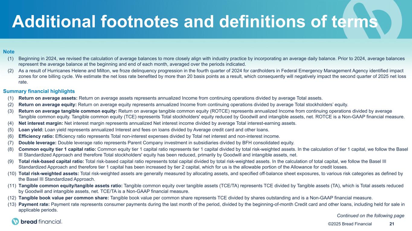 24©2025 Bread Financial We prepare our audited Consolidated Financial Statements in accordance with accounting principles generally accepted in the United States of America (GAAP). However, certain information included herein constitutes Non-GAAP Financial Measures. Our calculations of Non-GAAP Financial Measures may differ from the calculations of similarly titled measures by other companies. In particular: • In August 2024 we entered into separate, privately-negotiated repurchase agreements with a limited number of Convertible Note holders to repurchase a portion of our outstanding $316 million aggregate principal amount of 4.25% Convertible Senior Notes due 2028 (the Convertible Notes). Subsequently, in September and November of 2024, certain holders of Convertible Notes separately approached us to repurchase Convertible Notes, and we entered into additional separate, privately-negotiated repurchase agreements with such holders of Convertible Notes. From a GAAP perspective, we paid a premium to induce these repurchases which resulted in an impact to Total non-interest expenses, with a corresponding favorable tax impact, also reflected in Net income and consequently our Earnings per diluted share. We have shown adjustments to these three financial statement line items, for total Company as well as for continuing operations, to exclude the impact from our repurchased Convertible Notes. We use Adjusted total non-interest expenses, Adjusted net income, and Adjusted earnings per diluted share to evaluate the ongoing operations of the Company excluding the volatility that can occur from the impact of our repurchased Convertible Notes. • Pretax pre-provision earnings (PPNR) represents Income from continuing operations before income taxes and the Provision for credit losses. PPNR excluding gain on portfolio sale and impact from repurchased Convertible Notes then excludes from PPNR the gain on any portfolio sale in the period, as well as the inducement expense from our repurchased Convertible Notes in the period. We use PPNR and PPNR excluding gain on portfolio sale and impact from repurchased Convertible Notes as metrics to evaluate our results of operations before income taxes, excluding the volatility that can occur within Provision for credit losses and the one-time nature of a gain on the sale of a portfolio and/or the impact from repurchased Convertible Notes. • Return on average tangible common equity (ROTCE) represents annualized Income from continuing operations divided by average Tangible common equity. Tangible common equity (TCE) represents Total stockholders' equity reduced by Goodwill and intangible assets, net. We use ROTCE as a metric to evaluate the Company's performance. • Tangible common equity over Tangible assets (TCE/TA) represents TCE divided by Tangible assets (TA), which is Total assets reduced by Goodwill and intangible assets, net. We use TCE/TA as a metric to evaluate the Company’s capital adequacy and estimate its ability to absorb losses. • Tangible book value per common share represents TCE divided by shares outstanding. We use Tangible book value per common share, a metric used across the industry, to estimate liquidation value. We believe the use of these Non-GAAP financial measures provide additional clarity in understanding our results of operations and trends. For a reconciliation of these Non-GAAP financial measures to the most directly comparable GAAP measures, please see the “Reconciliation of GAAP to Non-GAAP Financial Measures”. Non-GAAP financial measures