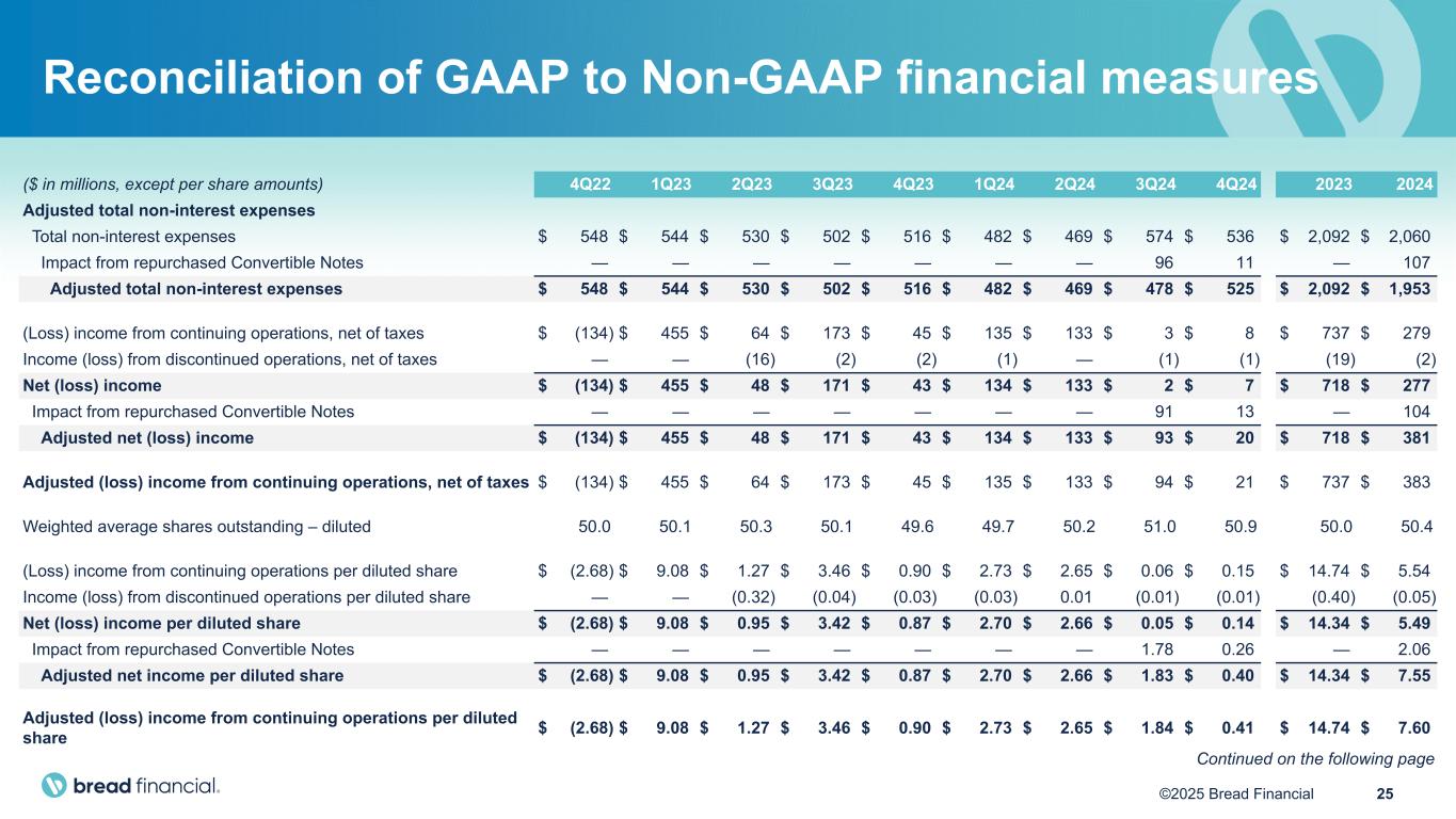 25©2025 Bread Financial Reconciliation of GAAP to Non-GAAP financial measures ($ in millions, except per share amounts) 4Q22 1Q23 2Q23 3Q23 4Q23 1Q24 2Q24 3Q24 4Q24 2023 2024 Adjusted total non-interest expenses Total non-interest expenses $ 548 $ 544 $ 530 $ 502 $ 516 $ 482 $ 469 $ 574 $ 536 $ 2,092 $ 2,060 Impact from repurchased Convertible Notes — — — — — — — 96 11 — 107 Adjusted total non-interest expenses $ 548 $ 544 $ 530 $ 502 $ 516 $ 482 $ 469 $ 478 $ 525 $ 2,092 $ 1,953 (Loss) income from continuing operations, net of taxes $ (134) $ 455 $ 64 $ 173 $ 45 $ 135 $ 133 $ 3 $ 8 $ 737 $ 279 Income (loss) from discontinued operations, net of taxes — — (16) (2) (2) (1) — (1) (1) (19) (2) Net (loss) income $ (134) $ 455 $ 48 $ 171 $ 43 $ 134 $ 133 $ 2 $ 7 $ 718 $ 277 Impact from repurchased Convertible Notes — — — — — — — 91 13 — 104 Adjusted net (loss) income $ (134) $ 455 $ 48 $ 171 $ 43 $ 134 $ 133 $ 93 $ 20 $ 718 $ 381 Adjusted (loss) income from continuing operations, net of taxes $ (134) $ 455 $ 64 $ 173 $ 45 $ 135 $ 133 $ 94 $ 21 $ 737 $ 383 Weighted average shares outstanding – diluted 50.0 50.1 50.3 50.1 49.6 49.7 50.2 51.0 50.9 50.0 50.4 (Loss) income from continuing operations per diluted share $ (2.68) $ 9.08 $ 1.27 $ 3.46 $ 0.90 $ 2.73 $ 2.65 $ 0.06 $ 0.15 $ 14.74 $ 5.54 Income (loss) from discontinued operations per diluted share — — (0.32) (0.04) (0.03) (0.03) 0.01 (0.01) (0.01) (0.40) (0.05) Net (loss) income per diluted share $ (2.68) $ 9.08 $ 0.95 $ 3.42 $ 0.87 $ 2.70 $ 2.66 $ 0.05 $ 0.14 $ 14.34 $ 5.49 Impact from repurchased Convertible Notes — — — — — — — 1.78 0.26 — 2.06 Adjusted net income per diluted share $ (2.68) $ 9.08 $ 0.95 $ 3.42 $ 0.87 $ 2.70 $ 2.66 $ 1.83 $ 0.40 $ 14.34 $ 7.55 Adjusted (loss) income from continuing operations per diluted share $ (2.68) $ 9.08 $ 1.27 $ 3.46 $ 0.90 $ 2.73 $ 2.65 $ 1.84 $ 0.41 $ 14.74 $ 7.60 Continued on the following page