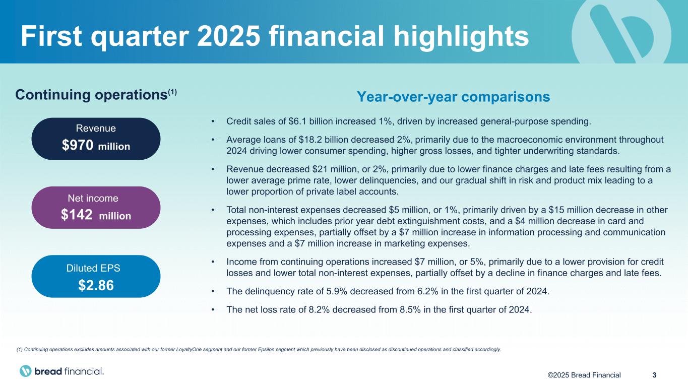 2©2025 Bread Financial Key highlights First quarter 2025 Demonstrated financial resilience and opportunistic capital allocation • Enhanced financial resilience through responsible growth, proactive risk management, prudent capital allocation to strengthen our balance sheet, and ongoing operational excellence initiatives. • Net income of $138 million and earnings per diluted share of $2.78. • Tangible book value per common share(1) of $48.92 increased 6% year-over-year. • Direct-to-consumer deposits of $7.9 billion increased 13% year-over-year, and now represent 43% of our average total funding. • Completed offering of $400 million subordinated notes due 2035, increasing our Total risk-based capital ratio as tier 2 capital. • Repurchased $102 million, or 2.1 million shares in the first quarter. Subsequently, in April we repurchased an additional 1.1 million shares for a total of 3.2 million shares, completing the board-authorized share repurchase program of $150 million. Proactive risk management given ongoing macroeconomic uncertainty • Closely monitoring the impact of the new administration's policies including tariffs, trade, immigration, tax and deregulation, and the impacts they have on consumers and our business. • While consumer financial health was relatively steady in the first quarter, we will remain disciplined with our credit risk management given ongoing macroeconomic uncertainty. (1) Represents a Non-GAAP financial measure. See “Non-GAAP Financial Measures” and "Reconciliation of GAAP to Non-GAAP Financial Measures".