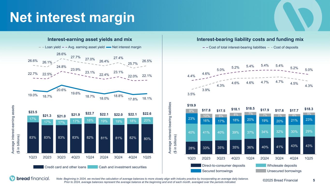 16©2025 Bread Financial 1Q25 ($ in millions) Average balance Interest income / expense Average yield / rate Cash and investment securities $ 4,423 $ 46 4.2% Credit card and other loans 18,164 1,185 26.5% Total interest-earning assets 22,587 1,231 22.1% Direct-to-consumer (Retail) 7,798 87 4.5% Wholesale deposits 5,224 51 4.0% Interest-bearing deposits 13,022 138 4.3% Secured borrowings 4,194 61 5.9% Unsecured borrowings 1,080 26 9.8% Interest-bearing borrowings 5,274 87 6.7% Total interest-bearing liabilities $ 18,296 $ 225 5.0% Net interest income $ 1,006 Net interest margin(1) 18.1% (1) See Additional footnotes and definitions of terms in the Appendix. Net interest margin