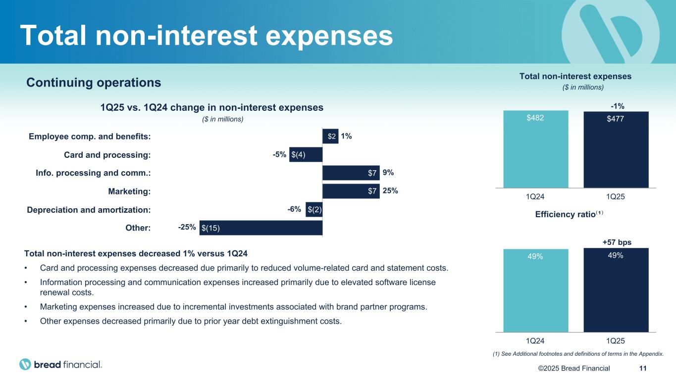 3©2025 Bread Financial $970 million (1) Continuing operations excludes amounts associated with our former LoyaltyOne segment and our former Epsilon segment which previously have been disclosed as discontinued operations and classified accordingly. Continuing operations(1) Revenue Year-over-year comparisons • Credit sales of $6.1 billion increased 1%, driven by increased general-purpose spending. • Average loans of $18.2 billion decreased 2%, primarily due to the macroeconomic environment throughout 2024 driving lower consumer spending, higher gross losses, and tighter underwriting standards. • Revenue decreased $21 million, or 2%, primarily due to lower finance charges and late fees resulting from a lower average prime rate, lower delinquencies, and our gradual shift in risk and product mix leading to a lower proportion of private label accounts. • Total non-interest expenses decreased $5 million, or 1%, primarily driven by a $15 million decrease in other expenses, which includes prior year debt extinguishment costs, and a $4 million decrease in card and processing expenses, partially offset by a $7 million increase in information processing and communication expenses and a $7 million increase in marketing expenses. • Income from continuing operations increased $7 million, or 5%, primarily due to a lower provision for credit losses and lower total non-interest expenses, partially offset by a decline in finance charges and late fees. • The delinquency rate of 5.9% decreased from 6.2% in the first quarter of 2024. • The net loss rate of 8.2% decreased from 8.5% in the first quarter of 2024. Diluted EPS Net income $142 million $2.86 First quarter 2025 financial highlights