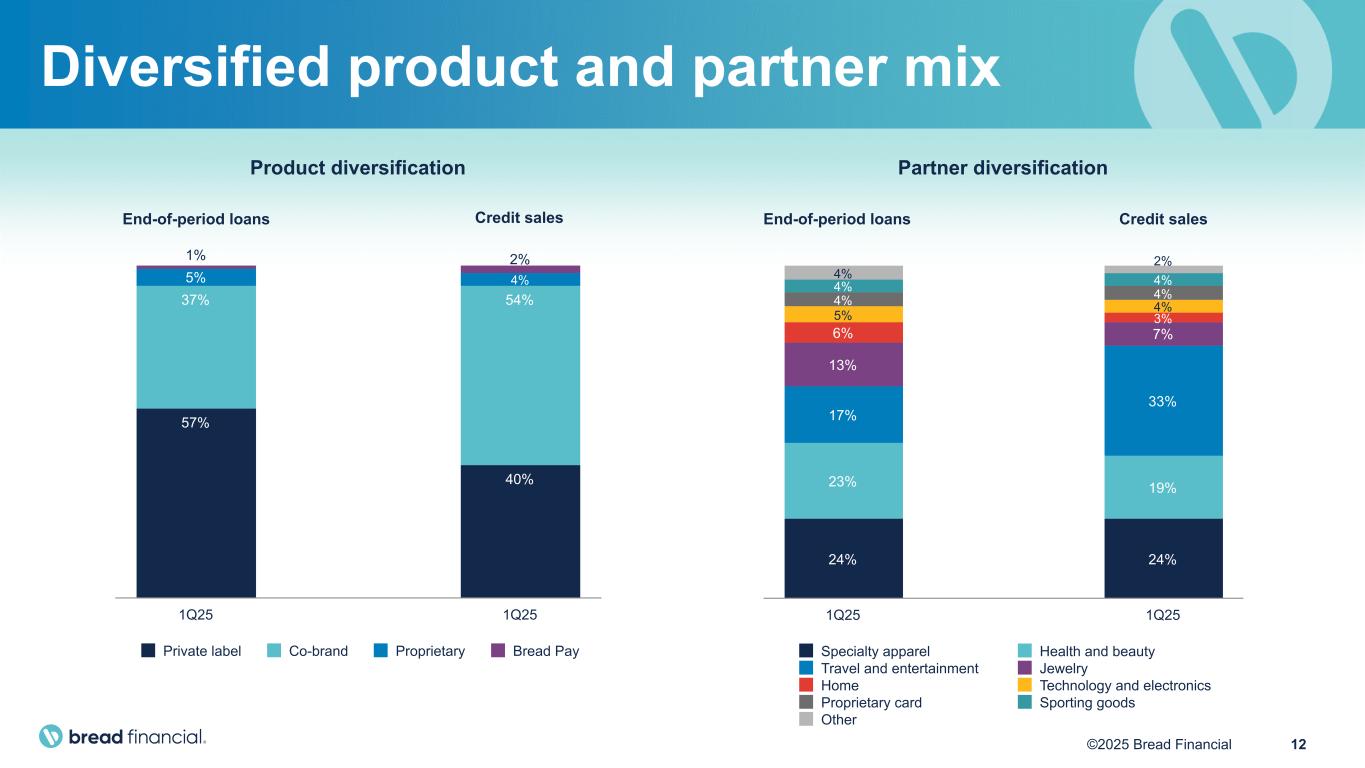 12©2025 Bread Financial Diversified product and partner mix Product diversification 57% 40% 37% 54% 5% 4% 1% 2% Private label Co-brand Proprietary Bread Pay 1Q25 1Q25 Credit salesEnd-of-period loans Partner diversification 24% 24% 23% 19% 17% 33% 13% 7%6% 3%5% 4%4% 4%4% 4%4% 2% Specialty apparel Health and beauty Travel and entertainment Jewelry Home Technology and electronics Proprietary card Sporting goods Other 1Q25 1Q25 Credit salesEnd-of-period loans