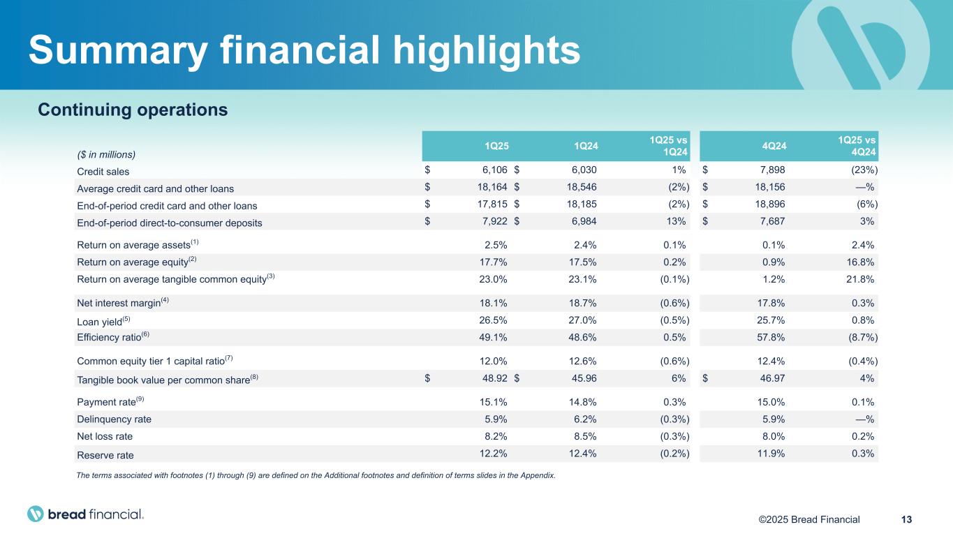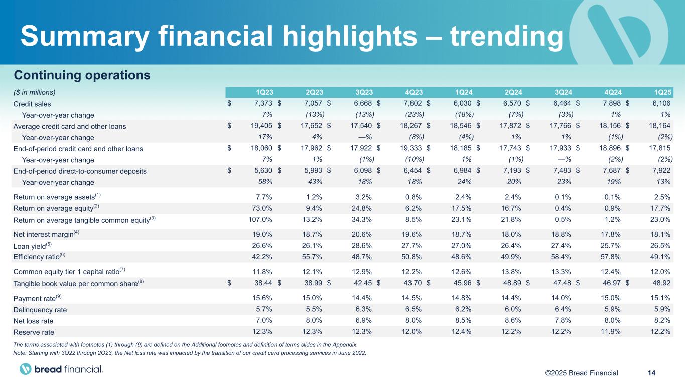 13©2025 Bread Financial Continuing operations ($ in millions) 1Q25 1Q24 1Q25 vs 1Q24 4Q24 1Q25 vs 4Q24 Credit sales $ 6,106 $ 6,030 1% $ 7,898 (23%) Average credit card and other loans $ 18,164 $ 18,546 (2%) $ 18,156 —% End-of-period credit card and other loans $ 17,815 $ 18,185 (2%) $ 18,896 (6%) End-of-period direct-to-consumer deposits $ 7,922 $ 6,984 13% $ 7,687 3% Return on average assets(1) 2.5% 2.4% 0.1% 0.1% 2.4% Return on average equity(2) 17.7% 17.5% 0.2% 0.9% 16.8% Return on average tangible common equity(3) 23.0% 23.1% (0.1%) 1.2% 21.8% Net interest margin(4) 18.1% 18.7% (0.6%) 17.8% 0.3% Loan yield(5) 26.5% 27.0% (0.5%) 25.7% 0.8% Efficiency ratio(6) 49.1% 48.6% 0.5% 57.8% (8.7%) Common equity tier 1 capital ratio(7) 12.0% 12.6% (0.6%) 12.4% (0.4%) Tangible book value per common share(8) $ 48.92 $ 45.96 6% $ 46.97 4% Payment rate(9) 15.1% 14.8% 0.3% 15.0% 0.1% Delinquency rate 5.9% 6.2% (0.3%) 5.9% —% Net loss rate 8.2% 8.5% (0.3%) 8.0% 0.2% Reserve rate 12.2% 12.4% (0.2%) 11.9% 0.3% The terms associated with footnotes (1) through (9) are defined on the Additional footnotes and definition of terms slides in the Appendix. Summary financial highlights