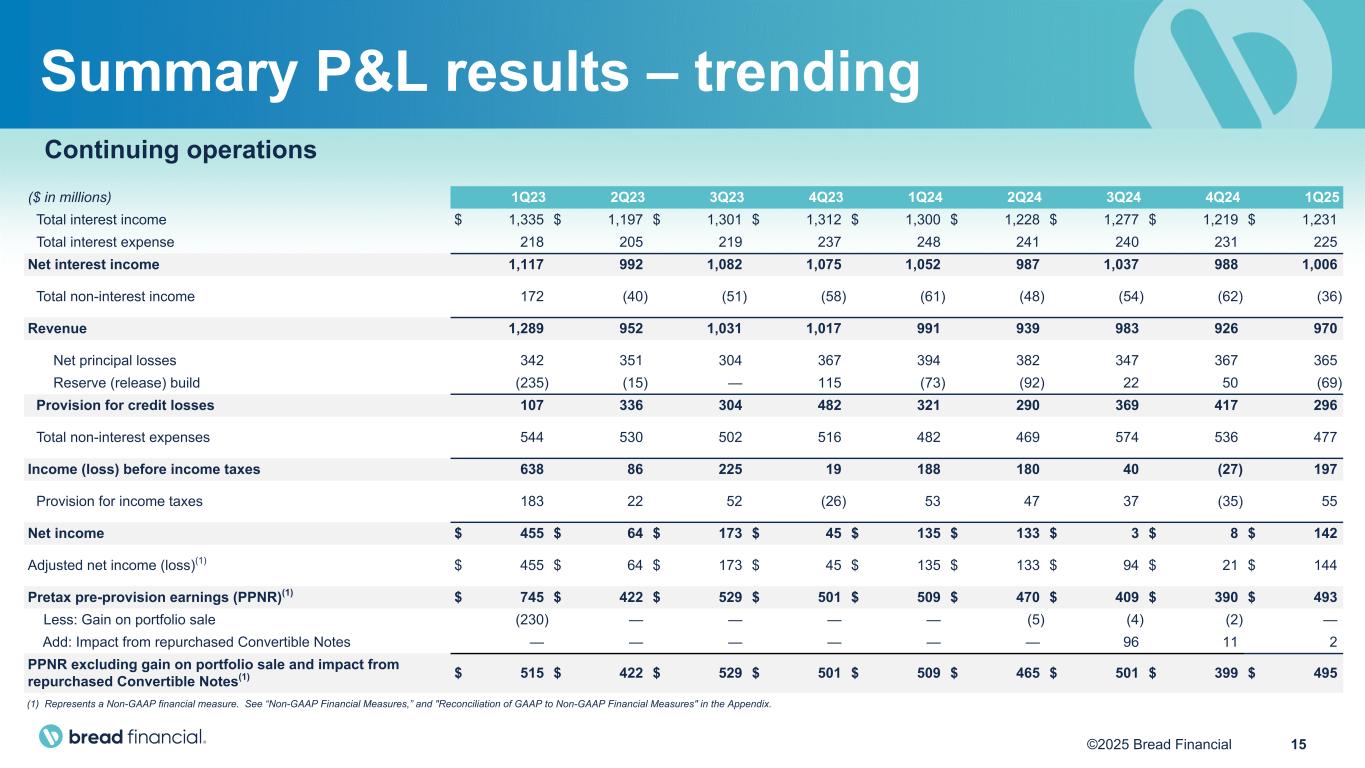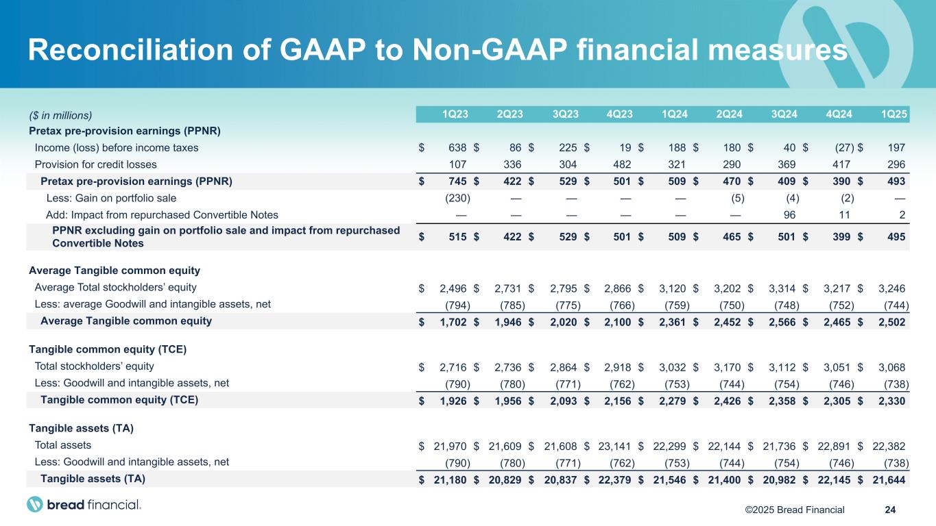 24©2025 Bread Financial ($ in millions) 1Q23 2Q23 3Q23 4Q23 1Q24 2Q24 3Q24 4Q24 1Q25 Pretax pre-provision earnings (PPNR) Income (loss) before income taxes $ 638 $ 86 $ 225 $ 19 $ 188 $ 180 $ 40 $ (27) $ 197 Provision for credit losses 107 336 304 482 321 290 369 417 296 Pretax pre-provision earnings (PPNR) $ 745 $ 422 $ 529 $ 501 $ 509 $ 470 $ 409 $ 390 $ 493 Less: Gain on portfolio sale (230) — — — — (5) (4) (2) — Add: Impact from repurchased Convertible Notes — — — — — — 96 11 2 PPNR excluding gain on portfolio sale and impact from repurchased Convertible Notes $ 515 $ 422 $ 529 $ 501 $ 509 $ 465 $ 501 $ 399 $ 495 Average Tangible common equity Average Total stockholders’ equity $ 2,496 $ 2,731 $ 2,795 $ 2,866 $ 3,120 $ 3,202 $ 3,314 $ 3,217 $ 3,246 Less: average Goodwill and intangible assets, net (794) (785) (775) (766) (759) (750) (748) (752) (744) Average Tangible common equity $ 1,702 $ 1,946 $ 2,020 $ 2,100 $ 2,361 $ 2,452 $ 2,566 $ 2,465 $ 2,502 Tangible common equity (TCE) Total stockholders’ equity $ 2,716 $ 2,736 $ 2,864 $ 2,918 $ 3,032 $ 3,170 $ 3,112 $ 3,051 $ 3,068 Less: Goodwill and intangible assets, net (790) (780) (771) (762) (753) (744) (754) (746) (738) Tangible common equity (TCE) $ 1,926 $ 1,956 $ 2,093 $ 2,156 $ 2,279 $ 2,426 $ 2,358 $ 2,305 $ 2,330 Tangible assets (TA) Total assets $ 21,970 $ 21,609 $ 21,608 $ 23,141 $ 22,299 $ 22,144 $ 21,736 $ 22,891 $ 22,382 Less: Goodwill and intangible assets, net (790) (780) (771) (762) (753) (744) (754) (746) (738) Tangible assets (TA) $ 21,180 $ 20,829 $ 20,837 $ 22,379 $ 21,546 $ 21,400 $ 20,982 $ 22,145 $ 21,644 Reconciliation of GAAP to Non-GAAP financial measures