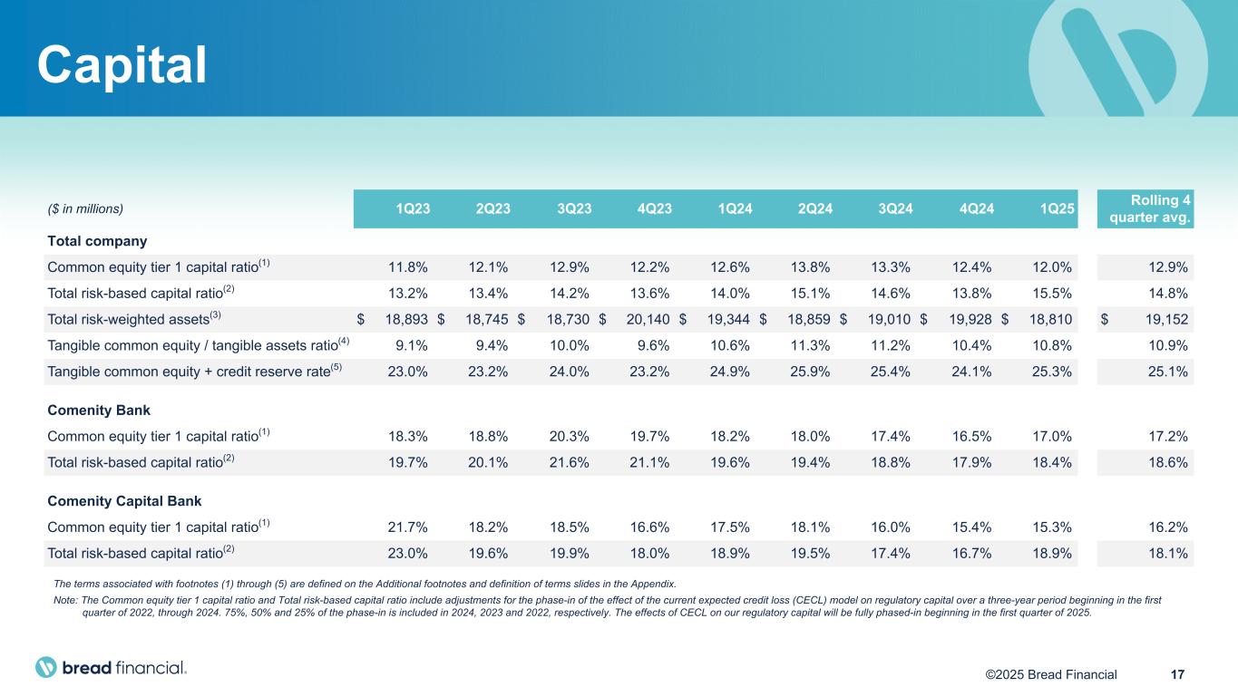 17©2025 Bread Financial ($ in millions) 1Q23 2Q23 3Q23 4Q23 1Q24 2Q24 3Q24 4Q24 1Q25 Rolling 4 quarter avg. Total company Common equity tier 1 capital ratio(1) 11.8% 12.1% 12.9% 12.2% 12.6% 13.8% 13.3% 12.4% 12.0% 12.9% Total risk-based capital ratio(2) 13.2% 13.4% 14.2% 13.6% 14.0% 15.1% 14.6% 13.8% 15.5% 14.8% Total risk-weighted assets(3) $ 18,893 $ 18,745 $ 18,730 $ 20,140 $ 19,344 $ 18,859 $ 19,010 $ 19,928 $ 18,810 $ 19,152 Tangible common equity / tangible assets ratio(4) 9.1% 9.4% 10.0% 9.6% 10.6% 11.3% 11.2% 10.4% 10.8% 10.9% Tangible common equity + credit reserve rate(5) 23.0% 23.2% 24.0% 23.2% 24.9% 25.9% 25.4% 24.1% 25.3% 25.1% Comenity Bank Common equity tier 1 capital ratio(1) 18.3% 18.8% 20.3% 19.7% 18.2% 18.0% 17.4% 16.5% 17.0% 17.2% Total risk-based capital ratio(2) 19.7% 20.1% 21.6% 21.1% 19.6% 19.4% 18.8% 17.9% 18.4% 18.6% Comenity Capital Bank Common equity tier 1 capital ratio(1) 21.7% 18.2% 18.5% 16.6% 17.5% 18.1% 16.0% 15.4% 15.3% 16.2% Total risk-based capital ratio(2) 23.0% 19.6% 19.9% 18.0% 18.9% 19.5% 17.4% 16.7% 18.9% 18.1% Capital The terms associated with footnotes (1) through (5) are defined on the Additional footnotes and definition of terms slides in the Appendix. Note: The Common equity tier 1 capital ratio and Total risk-based capital ratio include adjustments for the phase-in of the effect of the current expected credit loss (CECL) model on regulatory capital over a three-year period beginning in the first quarter of 2022, through 2024. 75%, 50% and 25% of the phase-in is included in 2024, 2023 and 2022, respectively. The effects of CECL on our regulatory capital will be fully phased-in beginning in the first quarter of 2025.
