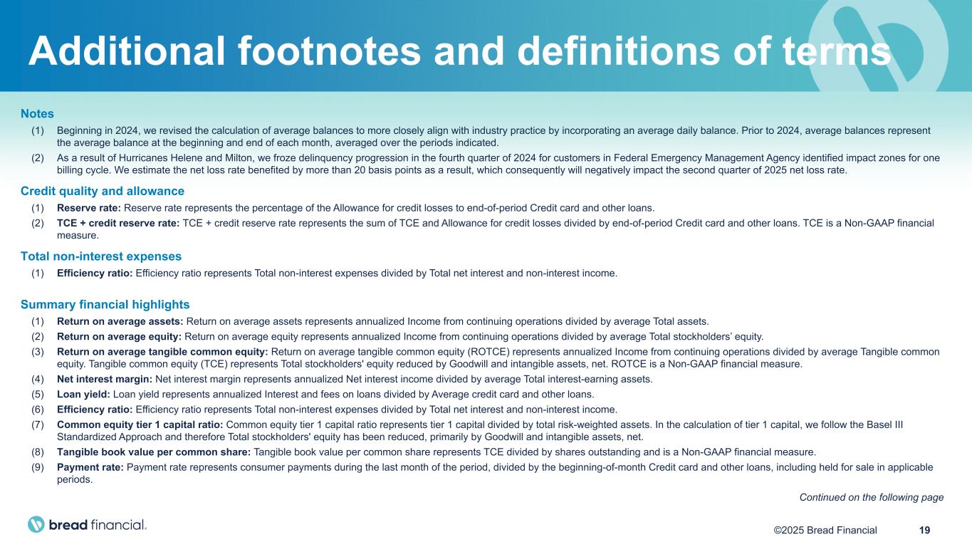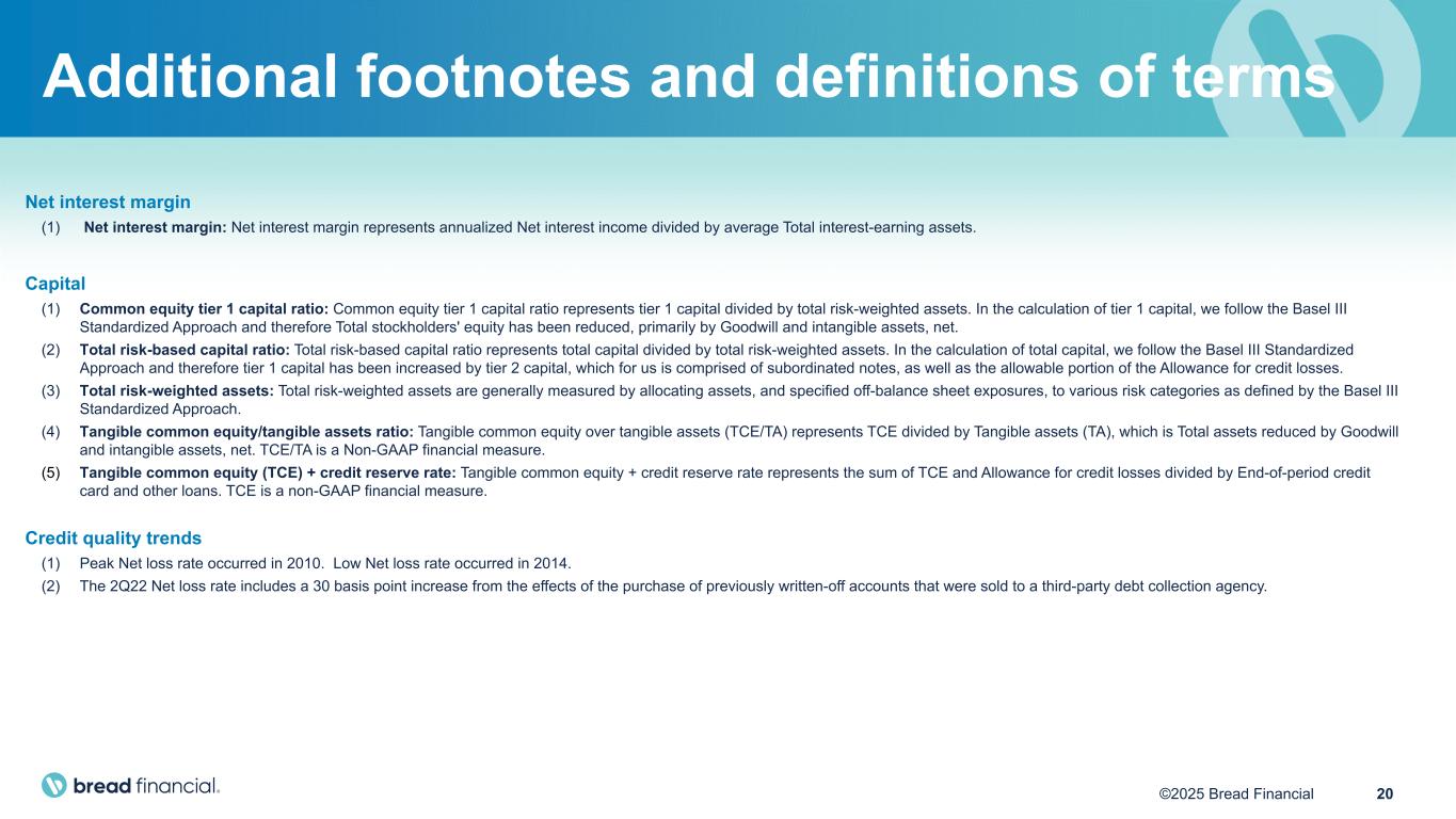 19©2025 Bread Financial Additional footnotes and definitions of terms Notes (1) Beginning in 2024, we revised the calculation of average balances to more closely align with industry practice by incorporating an average daily balance. Prior to 2024, average balances represent the average balance at the beginning and end of each month, averaged over the periods indicated. (2) As a result of Hurricanes Helene and Milton, we froze delinquency progression in the fourth quarter of 2024 for customers in Federal Emergency Management Agency identified impact zones for one billing cycle. We estimate the net loss rate benefited by more than 20 basis points as a result, which consequently will negatively impact the second quarter of 2025 net loss rate. Credit quality and allowance (1) Reserve rate: Reserve rate represents the percentage of the Allowance for credit losses to end-of-period Credit card and other loans. (2) TCE + credit reserve rate: TCE + credit reserve rate represents the sum of TCE and Allowance for credit losses divided by end-of-period Credit card and other loans. TCE is a Non-GAAP financial measure. Total non-interest expenses (1) Efficiency ratio: Efficiency ratio represents Total non-interest expenses divided by Total net interest and non-interest income. Summary financial highlights (1) Return on average assets: Return on average assets represents annualized Income from continuing operations divided by average Total assets. (2) Return on average equity: Return on average equity represents annualized Income from continuing operations divided by average Total stockholders’ equity. (3) Return on average tangible common equity: Return on average tangible common equity (ROTCE) represents annualized Income from continuing operations divided by average Tangible common equity. Tangible common equity (TCE) represents Total stockholders' equity reduced by Goodwill and intangible assets, net. ROTCE is a Non-GAAP financial measure. (4) Net interest margin: Net interest margin represents annualized Net interest income divided by average Total interest-earning assets. (5) Loan yield: Loan yield represents annualized Interest and fees on loans divided by Average credit card and other loans. (6) Efficiency ratio: Efficiency ratio represents Total non-interest expenses divided by Total net interest and non-interest income. (7) Common equity tier 1 capital ratio: Common equity tier 1 capital ratio represents tier 1 capital divided by total risk-weighted assets. In the calculation of tier 1 capital, we follow the Basel III Standardized Approach and therefore Total stockholders' equity has been reduced, primarily by Goodwill and intangible assets, net. (8) Tangible book value per common share: Tangible book value per common share represents TCE divided by shares outstanding and is a Non-GAAP financial measure. (9) Payment rate: Payment rate represents consumer payments during the last month of the period, divided by the beginning-of-month Credit card and other loans, including held for sale in applicable periods. Continued on the following page