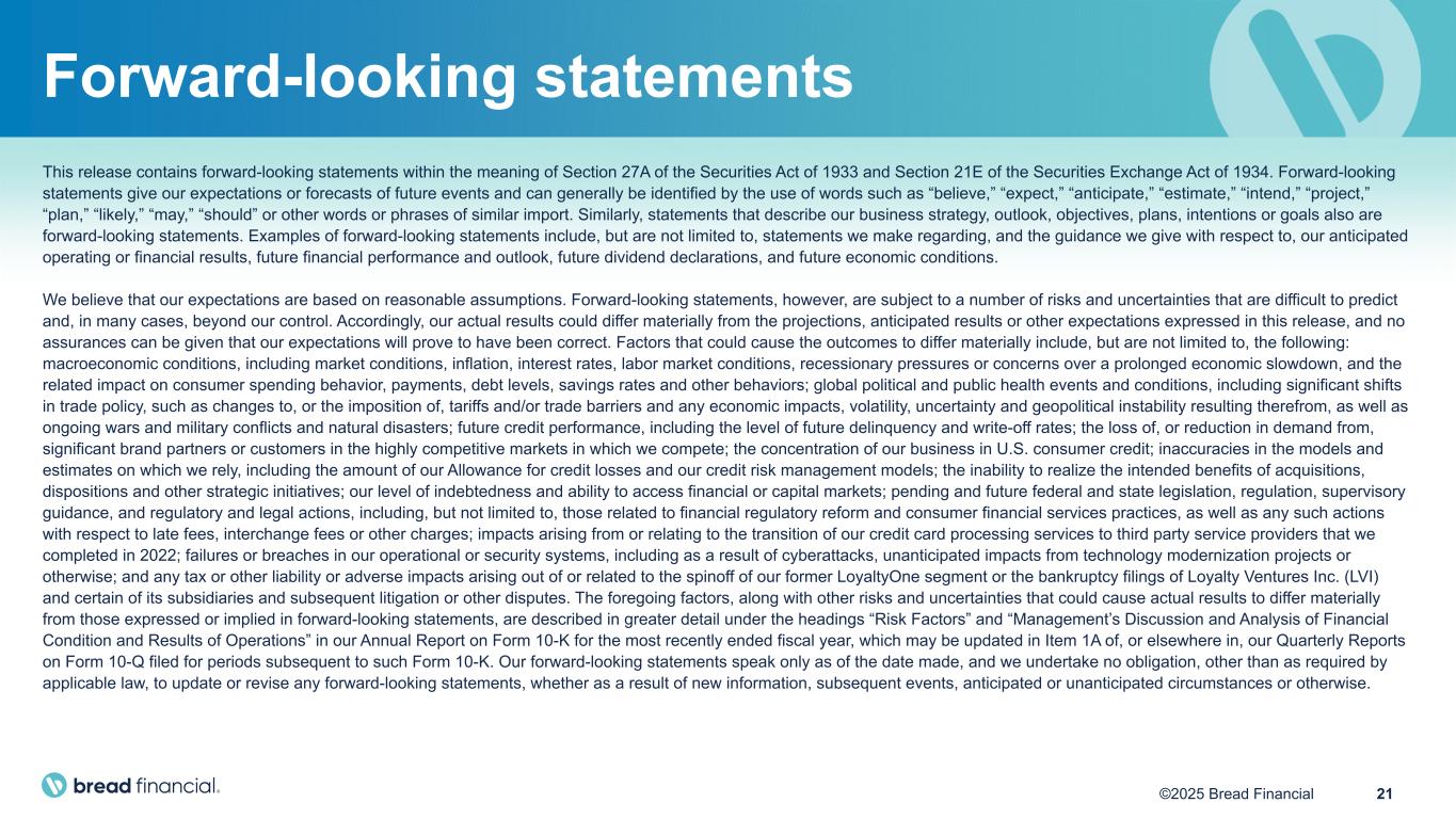 21©2025 Bread Financial Forward-looking statements This release contains forward-looking statements within the meaning of Section 27A of the Securities Act of 1933 and Section 21E of the Securities Exchange Act of 1934. Forward-looking statements give our expectations or forecasts of future events and can generally be identified by the use of words such as “believe,” “expect,” “anticipate,” “estimate,” “intend,” “project,” “plan,” “likely,” “may,” “should” or other words or phrases of similar import. Similarly, statements that describe our business strategy, outlook, objectives, plans, intentions or goals also are forward-looking statements. Examples of forward-looking statements include, but are not limited to, statements we make regarding, and the guidance we give with respect to, our anticipated operating or financial results, future financial performance and outlook, future dividend declarations, and future economic conditions. We believe that our expectations are based on reasonable assumptions. Forward-looking statements, however, are subject to a number of risks and uncertainties that are difficult to predict and, in many cases, beyond our control. Accordingly, our actual results could differ materially from the projections, anticipated results or other expectations expressed in this release, and no assurances can be given that our expectations will prove to have been correct. Factors that could cause the outcomes to differ materially include, but are not limited to, the following: macroeconomic conditions, including market conditions, inflation, interest rates, labor market conditions, recessionary pressures or concerns over a prolonged economic slowdown, and the related impact on consumer spending behavior, payments, debt levels, savings rates and other behaviors; global political and public health events and conditions, including significant shifts in trade policy, such as changes to, or the imposition of, tariffs and/or trade barriers and any economic impacts, volatility, uncertainty and geopolitical instability resulting therefrom, as well as ongoing wars and military conflicts and natural disasters; future credit performance, including the level of future delinquency and write-off rates; the loss of, or reduction in demand from, significant brand partners or customers in the highly competitive markets in which we compete; the concentration of our business in U.S. consumer credit; inaccuracies in the models and estimates on which we rely, including the amount of our Allowance for credit losses and our credit risk management models; the inability to realize the intended benefits of acquisitions, dispositions and other strategic initiatives; our level of indebtedness and ability to access financial or capital markets; pending and future federal and state legislation, regulation, supervisory guidance, and regulatory and legal actions, including, but not limited to, those related to financial regulatory reform and consumer financial services practices, as well as any such actions with respect to late fees, interchange fees or other charges; impacts arising from or relating to the transition of our credit card processing services to third party service providers that we completed in 2022; failures or breaches in our operational or security systems, including as a result of cyberattacks, unanticipated impacts from technology modernization projects or otherwise; and any tax or other liability or adverse impacts arising out of or related to the spinoff of our former LoyaltyOne segment or the bankruptcy filings of Loyalty Ventures Inc. (LVI) and certain of its subsidiaries and subsequent litigation or other disputes. The foregoing factors, along with other risks and uncertainties that could cause actual results to differ materially from those expressed or implied in forward-looking statements, are described in greater detail under the headings “Risk Factors” and “Management’s Discussion and Analysis of Financial Condition and Results of Operations” in our Annual Report on Form 10-K for the most recently ended fiscal year, which may be updated in Item 1A of, or elsewhere in, our Quarterly Reports on Form 10-Q filed for periods subsequent to such Form 10-K. Our forward-looking statements speak only as of the date made, and we undertake no obligation, other than as required by applicable law, to update or revise any forward-looking statements, whether as a result of new information, subsequent events, anticipated or unanticipated circumstances or otherwise.