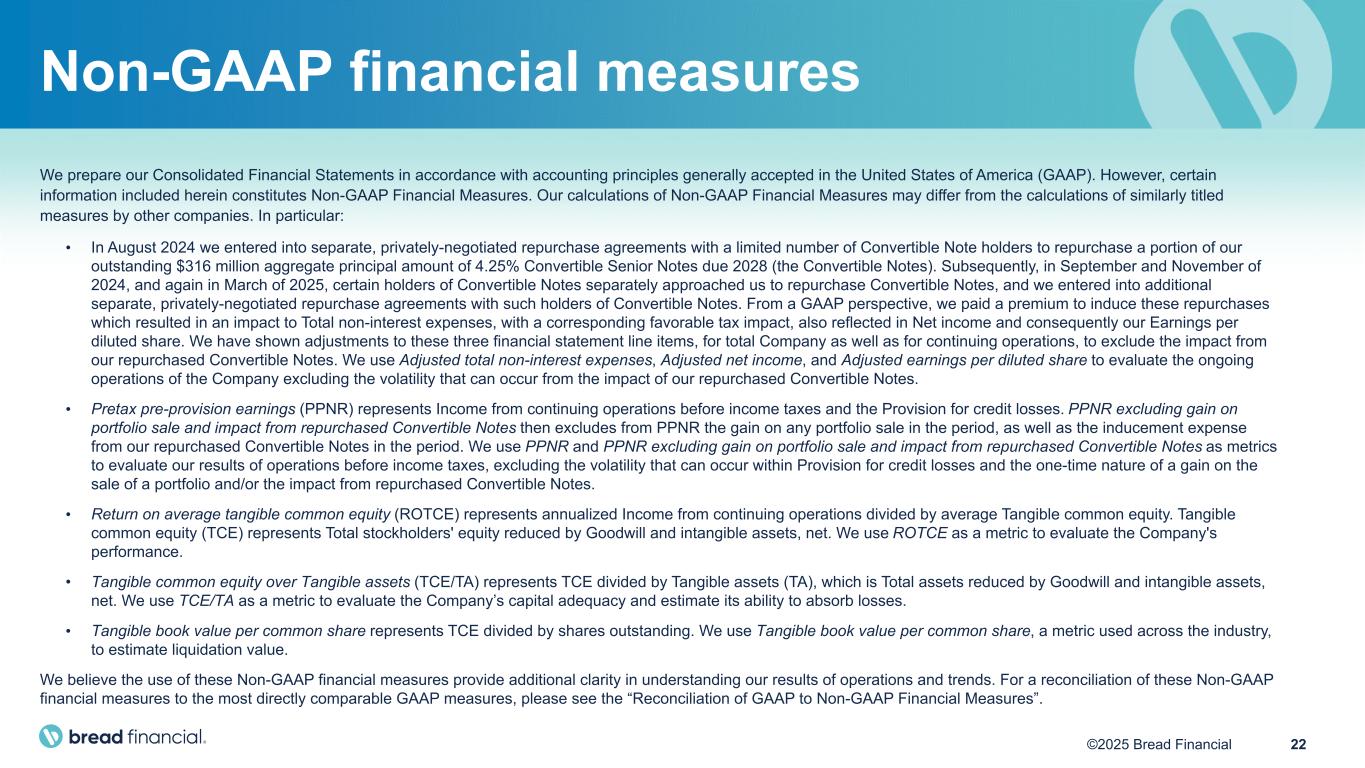 22©2025 Bread Financial We prepare our Consolidated Financial Statements in accordance with accounting principles generally accepted in the United States of America (GAAP). However, certain information included herein constitutes Non-GAAP Financial Measures. Our calculations of Non-GAAP Financial Measures may differ from the calculations of similarly titled measures by other companies. In particular: • In August 2024 we entered into separate, privately-negotiated repurchase agreements with a limited number of Convertible Note holders to repurchase a portion of our outstanding $316 million aggregate principal amount of 4.25% Convertible Senior Notes due 2028 (the Convertible Notes). Subsequently, in September and November of 2024, and again in March of 2025, certain holders of Convertible Notes separately approached us to repurchase Convertible Notes, and we entered into additional separate, privately-negotiated repurchase agreements with such holders of Convertible Notes. From a GAAP perspective, we paid a premium to induce these repurchases which resulted in an impact to Total non-interest expenses, with a corresponding favorable tax impact, also reflected in Net income and consequently our Earnings per diluted share. We have shown adjustments to these three financial statement line items, for total Company as well as for continuing operations, to exclude the impact from our repurchased Convertible Notes. We use Adjusted total non-interest expenses, Adjusted net income, and Adjusted earnings per diluted share to evaluate the ongoing operations of the Company excluding the volatility that can occur from the impact of our repurchased Convertible Notes. • Pretax pre-provision earnings (PPNR) represents Income from continuing operations before income taxes and the Provision for credit losses. PPNR excluding gain on portfolio sale and impact from repurchased Convertible Notes then excludes from PPNR the gain on any portfolio sale in the period, as well as the inducement expense from our repurchased Convertible Notes in the period. We use PPNR and PPNR excluding gain on portfolio sale and impact from repurchased Convertible Notes as metrics to evaluate our results of operations before income taxes, excluding the volatility that can occur within Provision for credit losses and the one-time nature of a gain on the sale of a portfolio and/or the impact from repurchased Convertible Notes. • Return on average tangible common equity (ROTCE) represents annualized Income from continuing operations divided by average Tangible common equity. Tangible common equity (TCE) represents Total stockholders' equity reduced by Goodwill and intangible assets, net. We use ROTCE as a metric to evaluate the Company's performance. • Tangible common equity over Tangible assets (TCE/TA) represents TCE divided by Tangible assets (TA), which is Total assets reduced by Goodwill and intangible assets, net. We use TCE/TA as a metric to evaluate the Company’s capital adequacy and estimate its ability to absorb losses. • Tangible book value per common share represents TCE divided by shares outstanding. We use Tangible book value per common share, a metric used across the industry, to estimate liquidation value. We believe the use of these Non-GAAP financial measures provide additional clarity in understanding our results of operations and trends. For a reconciliation of these Non-GAAP financial measures to the most directly comparable GAAP measures, please see the “Reconciliation of GAAP to Non-GAAP Financial Measures”. Non-GAAP financial measures