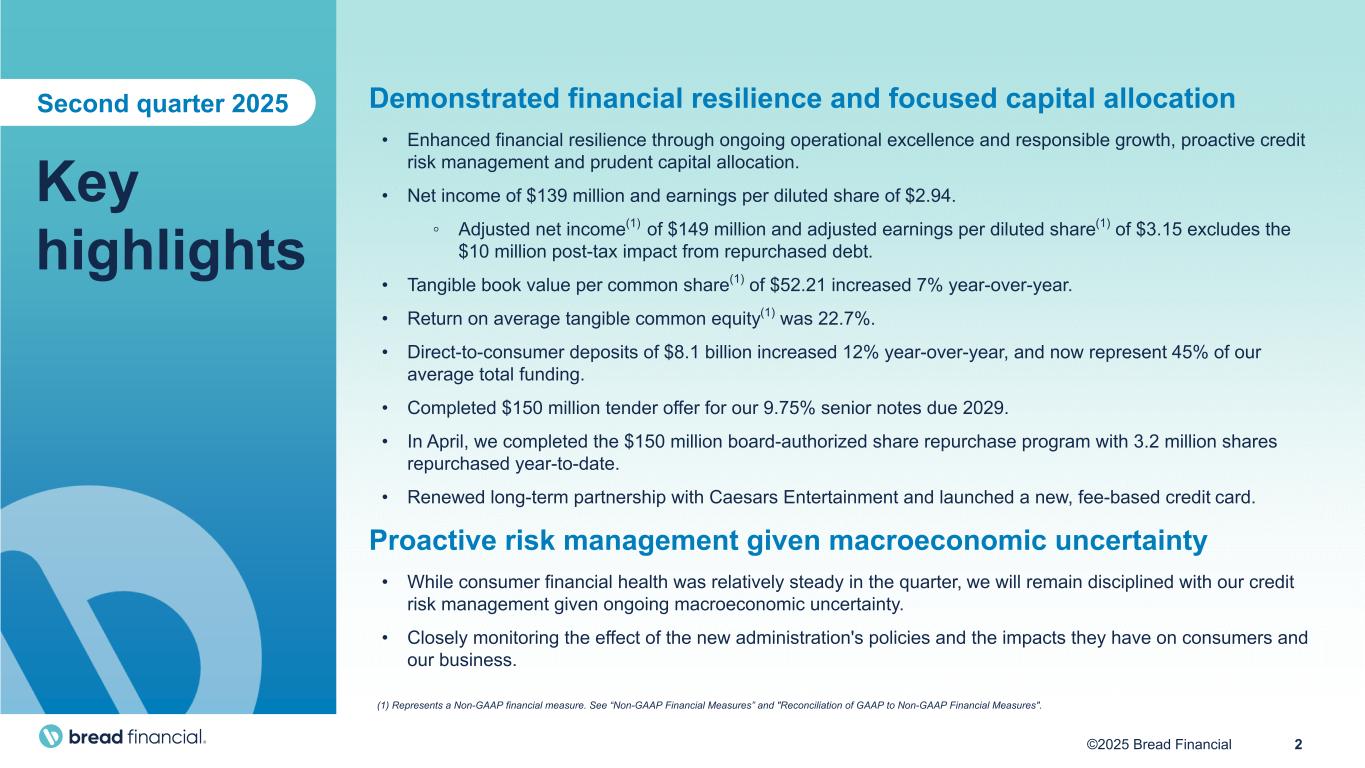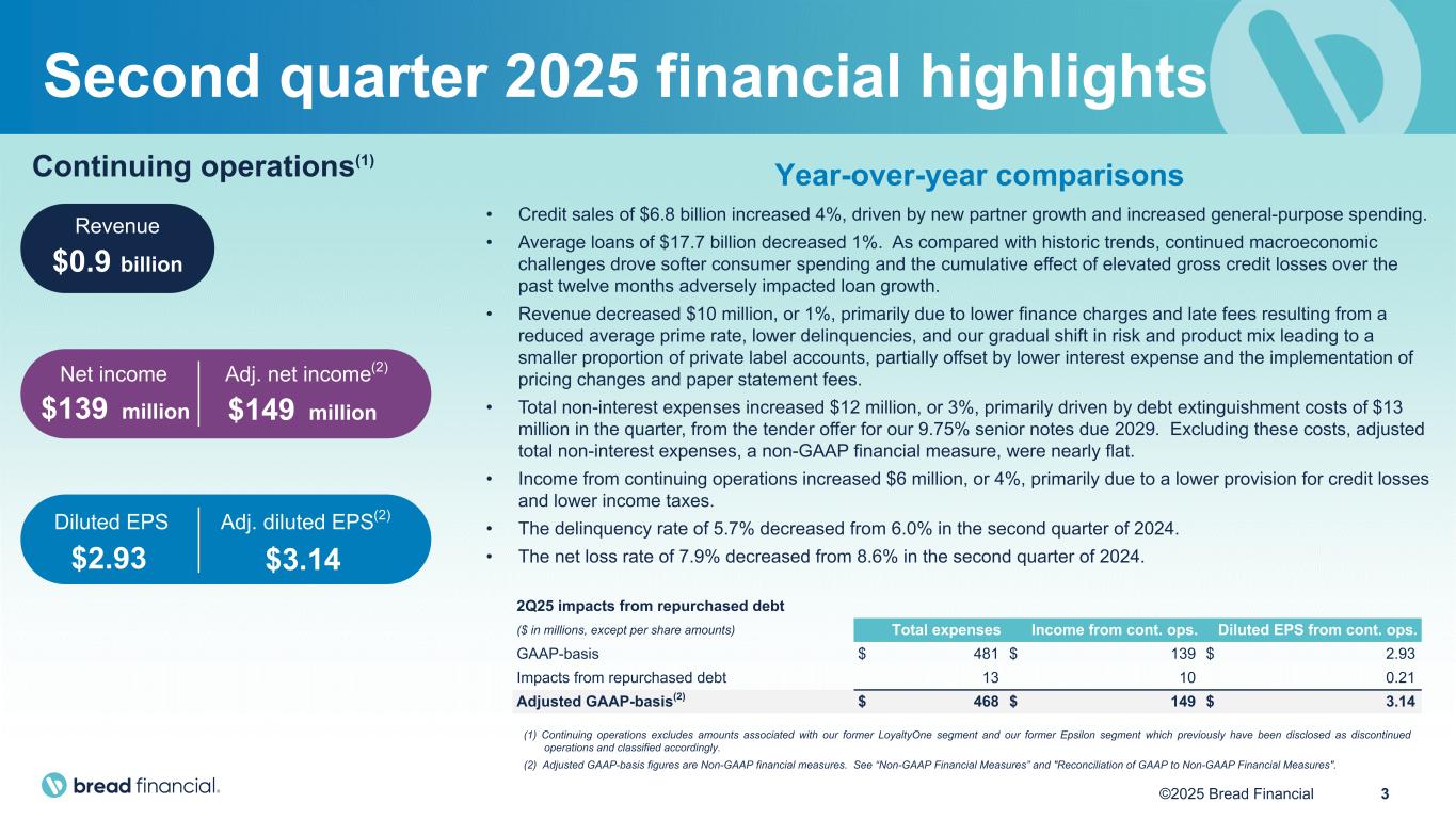 2©2025 Bread Financial Key highlights Second quarter 2025 Demonstrated financial resilience and focused capital allocation • Enhanced financial resilience through ongoing operational excellence and responsible growth, proactive credit risk management and prudent capital allocation. • Net income of $139 million and earnings per diluted share of $2.94. ◦ Adjusted net income(1) of $149 million and adjusted earnings per diluted share(1) of $3.15 excludes the $10 million post-tax impact from repurchased debt. • Tangible book value per common share(1) of $52.21 increased 7% year-over-year. • Return on average tangible common equity(1) was 22.7%. • Direct-to-consumer deposits of $8.1 billion increased 12% year-over-year, and now represent 45% of our average total funding. • Completed $150 million tender offer for our 9.75% senior notes due 2029. • In April, we completed the $150 million board-authorized share repurchase program with 3.2 million shares repurchased year-to-date. • Renewed long-term partnership with Caesars Entertainment and launched a new, fee-based credit card. Proactive risk management given macroeconomic uncertainty • While consumer financial health was relatively steady in the quarter, we will remain disciplined with our credit risk management given ongoing macroeconomic uncertainty. • Closely monitoring the effect of the new administration's policies and the impacts they have on consumers and our business. (1) Represents a Non-GAAP financial measure. See “Non-GAAP Financial Measures” and "Reconciliation of GAAP to Non-GAAP Financial Measures".