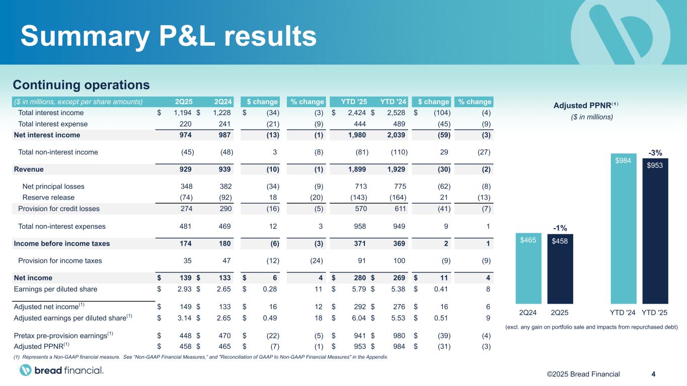 3©2025 Bread Financial $0.9 billion (1) Continuing operations excludes amounts associated with our former LoyaltyOne segment and our former Epsilon segment which previously have been disclosed as discontinued operations and classified accordingly. (2) Adjusted GAAP-basis figures are Non-GAAP financial measures. See “Non-GAAP Financial Measures” and "Reconciliation of GAAP to Non-GAAP Financial Measures". Continuing operations(1) Revenue 2Q25 impacts from repurchased debt ($ in millions, except per share amounts) Total expenses Income from cont. ops. Diluted EPS from cont. ops. GAAP-basis $ 481 $ 139 $ 2.93 Impacts from repurchased debt 13 10 0.21 Adjusted GAAP-basis(2) $ 468 $ 149 $ 3.14 Year-over-year comparisons • Credit sales of $6.8 billion increased 4%, driven by new partner growth and increased general-purpose spending. • Average loans of $17.7 billion decreased 1%. As compared with historic trends, continued macroeconomic challenges drove softer consumer spending and the cumulative effect of elevated gross credit losses over the past twelve months adversely impacted loan growth. • Revenue decreased $10 million, or 1%, primarily due to lower finance charges and late fees resulting from a reduced average prime rate, lower delinquencies, and our gradual shift in risk and product mix leading to a smaller proportion of private label accounts, partially offset by lower interest expense and the implementation of pricing changes and paper statement fees. • Total non-interest expenses increased $12 million, or 3%, primarily driven by debt extinguishment costs of $13 million in the quarter, from the tender offer for our 9.75% senior notes due 2029. Excluding these costs, adjusted total non-interest expenses, a non-GAAP financial measure, were nearly flat. • Income from continuing operations increased $6 million, or 4%, primarily due to a lower provision for credit losses and lower income taxes. • The delinquency rate of 5.7% decreased from 6.0% in the second quarter of 2024. • The net loss rate of 7.9% decreased from 8.6% in the second quarter of 2024. Diluted EPS Adj. diluted EPS(2) Net income Adj. net income(2) $139 million $149 million $3.14$2.93 Second quarter 2025 financial highlights