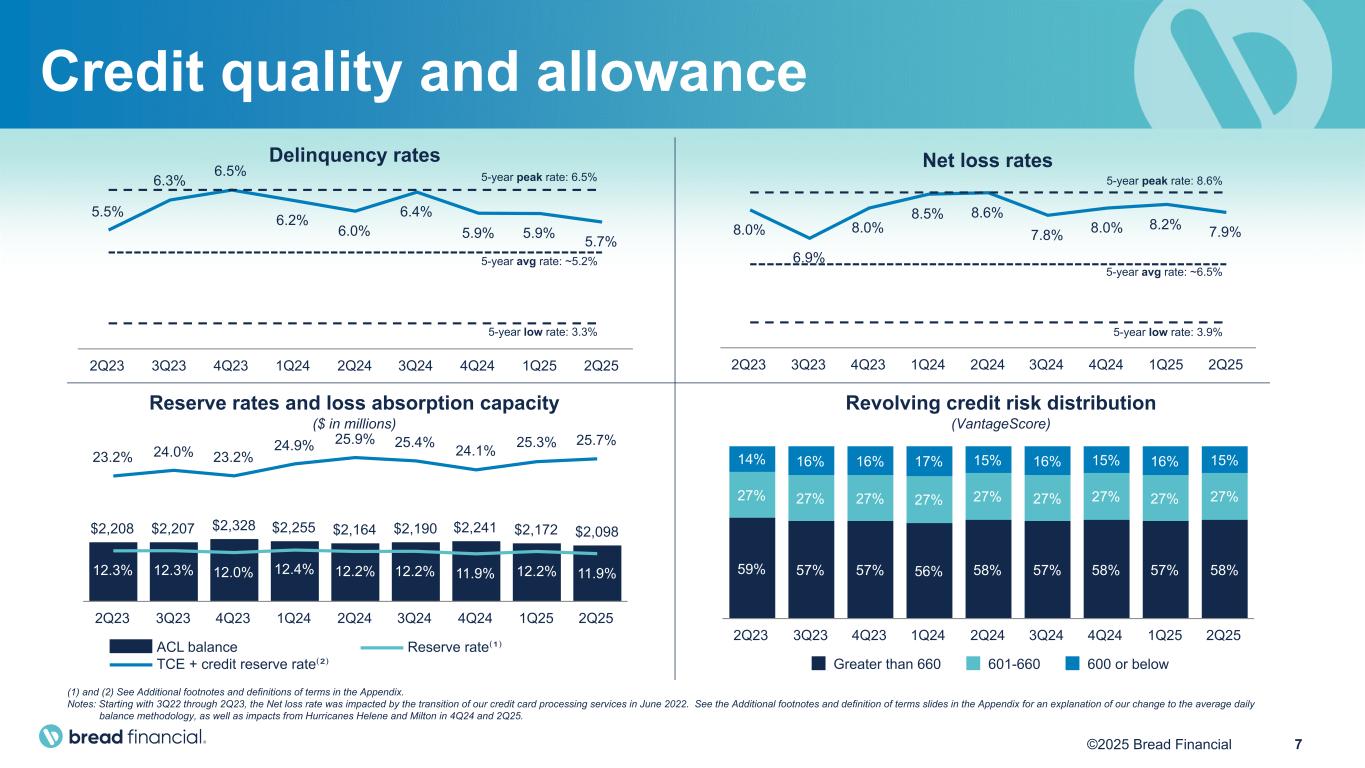 6©2025 Bread Financial Funding, capital and liquidity $17.9 $17.9 $13.1 $13.2 $3.5 $3.4 $1.3 $1.3 2Q24 2Q25 % of funding 7% 19% 74% CET1 TRBC 2Q24 13.8 % 15.1 % Net earnings 2.2 % 2.2 % Risk-weighted asset changes 0.1 % 0.1 % Common dividends (0.2) % (0.2) % Share repurchases (1.1) % (1.0) % CECL transition provisions (0.7) % (0.7) % Repurchased debt (1.1) % (1.1) % Subordinated notes N/A 2.1 % 2Q25 13.0 % 16.5 % CET1 capital ratio 13.8% 13.0% 2Q24 2Q25 Tier 1 capital ratio 13.8% 13.0% 2Q24 2Q25 TCE + credit reserve rate⁽¹⁾ 25.9% 25.7% 2Q24 2Q25 Total risk-based capital ratio 15.1% 16.5% 2Q24 2Q25 CET1 and total risk-based capital (TRBC) ratios walk Capital ratios Average funding sources Liquid assets 4.0 3.8 Undrawn credit facilities 3.7 3.9 Total 7.8 7.7 % of liquid resources to total assets 35.0% 35.1% (1) Represents a Non-GAAP financial measure. See “Non-GAAP Financial Measures” and "Reconciliation of GAAP to Non-GAAP Financial Measures". ($ in billions) Unsecured borrowings Secured borrowings Deposits End-of-period liquid resources
