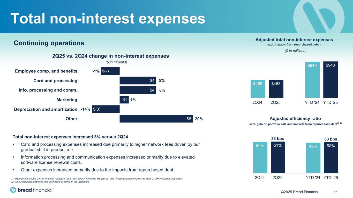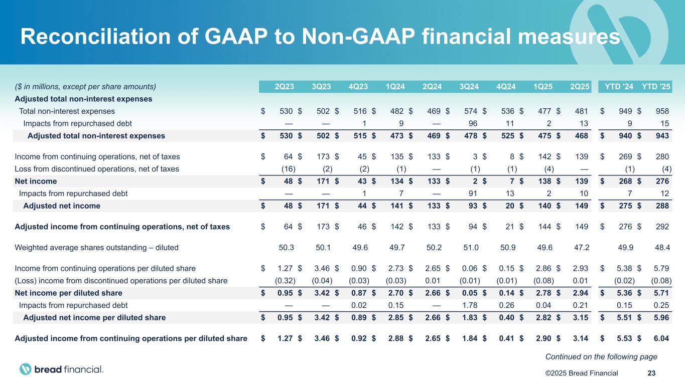 23©2025 Bread Financial Reconciliation of GAAP to Non-GAAP financial measures ($ in millions, except per share amounts) 2Q23 3Q23 4Q23 1Q24 2Q24 3Q24 4Q24 1Q25 2Q25 YTD '24 YTD '25 Adjusted total non-interest expenses Total non-interest expenses $ 530 $ 502 $ 516 $ 482 $ 469 $ 574 $ 536 $ 477 $ 481 $ 949 $ 958 Impacts from repurchased debt — — 1 9 — 96 11 2 13 9 15 Adjusted total non-interest expenses $ 530 $ 502 $ 515 $ 473 $ 469 $ 478 $ 525 $ 475 $ 468 $ 940 $ 943 Income from continuing operations, net of taxes $ 64 $ 173 $ 45 $ 135 $ 133 $ 3 $ 8 $ 142 $ 139 $ 269 $ 280 Loss from discontinued operations, net of taxes (16) (2) (2) (1) — (1) (1) (4) — (1) (4) Net income $ 48 $ 171 $ 43 $ 134 $ 133 $ 2 $ 7 $ 138 $ 139 $ 268 $ 276 Impacts from repurchased debt — — 1 7 — 91 13 2 10 7 12 Adjusted net income $ 48 $ 171 $ 44 $ 141 $ 133 $ 93 $ 20 $ 140 $ 149 $ 275 $ 288 Adjusted income from continuing operations, net of taxes $ 64 $ 173 $ 46 $ 142 $ 133 $ 94 $ 21 $ 144 $ 149 $ 276 $ 292 Weighted average shares outstanding – diluted 50.3 50.1 49.6 49.7 50.2 51.0 50.9 49.6 47.2 49.9 48.4 Income from continuing operations per diluted share $ 1.27 $ 3.46 $ 0.90 $ 2.73 $ 2.65 $ 0.06 $ 0.15 $ 2.86 $ 2.93 $ 5.38 $ 5.79 (Loss) income from discontinued operations per diluted share (0.32) (0.04) (0.03) (0.03) 0.01 (0.01) (0.01) (0.08) 0.01 (0.02) (0.08) Net income per diluted share $ 0.95 $ 3.42 $ 0.87 $ 2.70 $ 2.66 $ 0.05 $ 0.14 $ 2.78 $ 2.94 $ 5.36 $ 5.71 Impacts from repurchased debt — — 0.02 0.15 — 1.78 0.26 0.04 0.21 0.15 0.25 Adjusted net income per diluted share $ 0.95 $ 3.42 $ 0.89 $ 2.85 $ 2.66 $ 1.83 $ 0.40 $ 2.82 $ 3.15 $ 5.51 $ 5.96 Adjusted income from continuing operations per diluted share $ 1.27 $ 3.46 $ 0.92 $ 2.88 $ 2.65 $ 1.84 $ 0.41 $ 2.90 $ 3.14 $ 5.53 $ 6.04 Continued on the following page