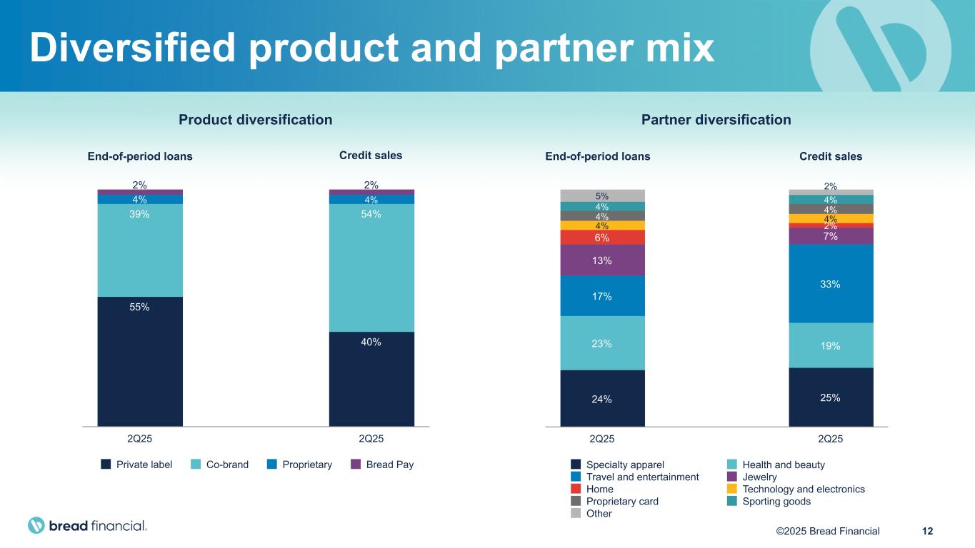 12©2025 Bread Financial Diversified product and partner mix Product diversification 55% 40% 39% 54% 4% 4% 2% 2% Private label Co-brand Proprietary Bread Pay 2Q25 2Q25 Credit salesEnd-of-period loans Partner diversification 24% 25% 23% 19% 17% 33% 13% 7%6% 2%4% 4%4% 4%4% 4%5% 2% Specialty apparel Health and beauty Travel and entertainment Jewelry Home Technology and electronics Proprietary card Sporting goods Other 2Q25 2Q25 Credit salesEnd-of-period loans