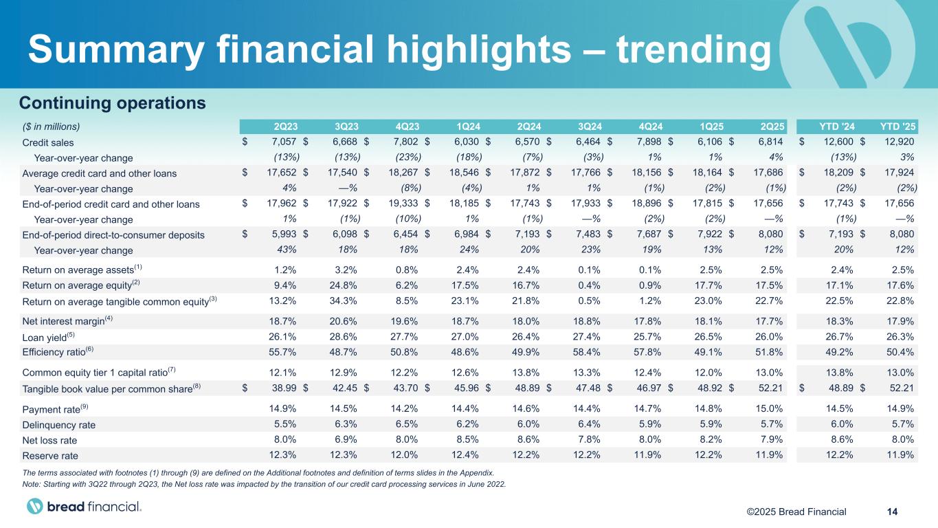 13©2025 Bread Financial Continuing operations ($ in millions) 2Q25 2Q24 2Q25 vs 2Q24 1Q25 2Q25 vs 1Q25 YTD '25 YTD '24 YTD '25 vs YTD '24 Credit sales $ 6,814 $ 6,570 4% $ 6,106 12% $ 12,920 $ 12,600 3% Average credit card and other loans $ 17,686 $ 17,872 (1%) $ 18,164 (3%) $ 17,924 $ 18,209 (2%) End-of-period credit card and other loans $ 17,656 $ 17,743 —% $ 17,815 (1%) $ 17,656 $ 17,743 —% End-of-period direct-to-consumer deposits $ 8,080 $ 7,193 12% $ 7,922 2% $ 8,080 $ 7,193 12% Return on average assets(1) 2.5% 2.4% 0.1% 2.5% —% 2.5% 2.4% 0.1% Return on average equity(2) 17.5% 16.7% 0.8% 17.7% (0.2%) 17.6% 17.1% 0.5% Return on average tangible common equity(3) 22.7% 21.8% 0.9% 23.0% (0.3%) 22.8% 22.5% 0.3% Net interest margin(4) 17.7% 18.0% (0.3%) 18.1% (0.4%) 17.9% 18.3% (0.4%) Loan yield(5) 26.0% 26.4% (0.4%) 26.5% (0.5%) 26.3% 26.7% (0.4%) Efficiency ratio(6) 51.8% 49.9% 1.9% 49.1% 2.7% 50.4% 49.2% 1.2% Common equity tier 1 capital ratio(7) 13.0% 13.8% (0.8%) 12.0% 1.0% 13.0% 13.8% (0.8%) Tangible book value per common share(8) $ 52.21 $ 48.89 7% $ 48.92 7% $ 52.21 $ 48.89 7% Payment rate(9) 15.0% 14.6% 0.4% 14.8% 0.2% 14.9% 14.5% 0.4% Delinquency rate 5.7% 6.0% (0.3%) 5.9% (0.2%) 5.7% 6.0% (0.3%) Net loss rate 7.9% 8.6% (0.7%) 8.2% (0.3%) 8.0% 8.6% (0.6%) Reserve rate 11.9% 12.2% (0.3%) 12.2% (0.3%) 11.9% 12.2% (0.3%) The terms associated with footnotes (1) through (9) are defined on the Additional footnotes and definition of terms slides in the Appendix. Summary financial highlights