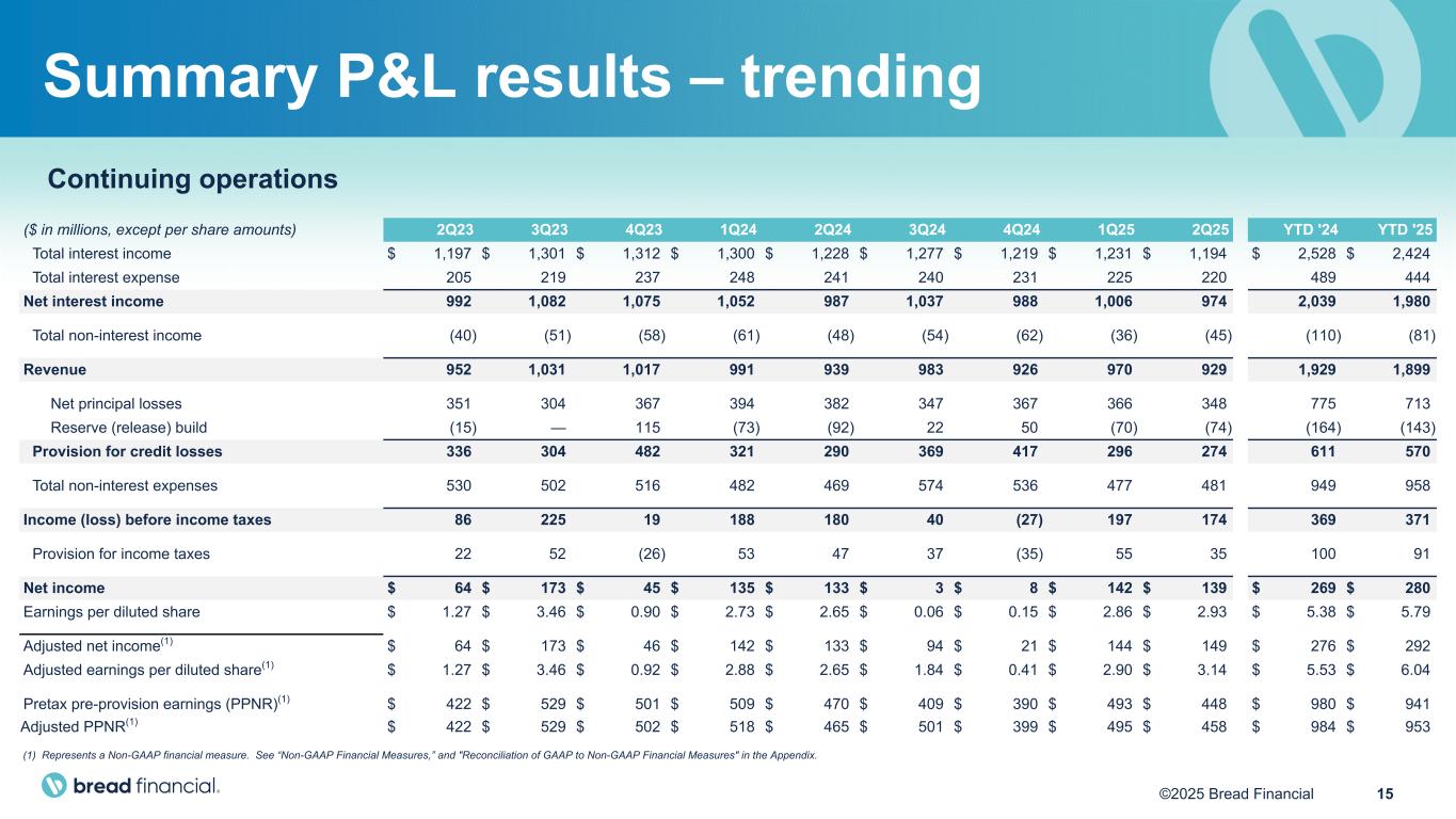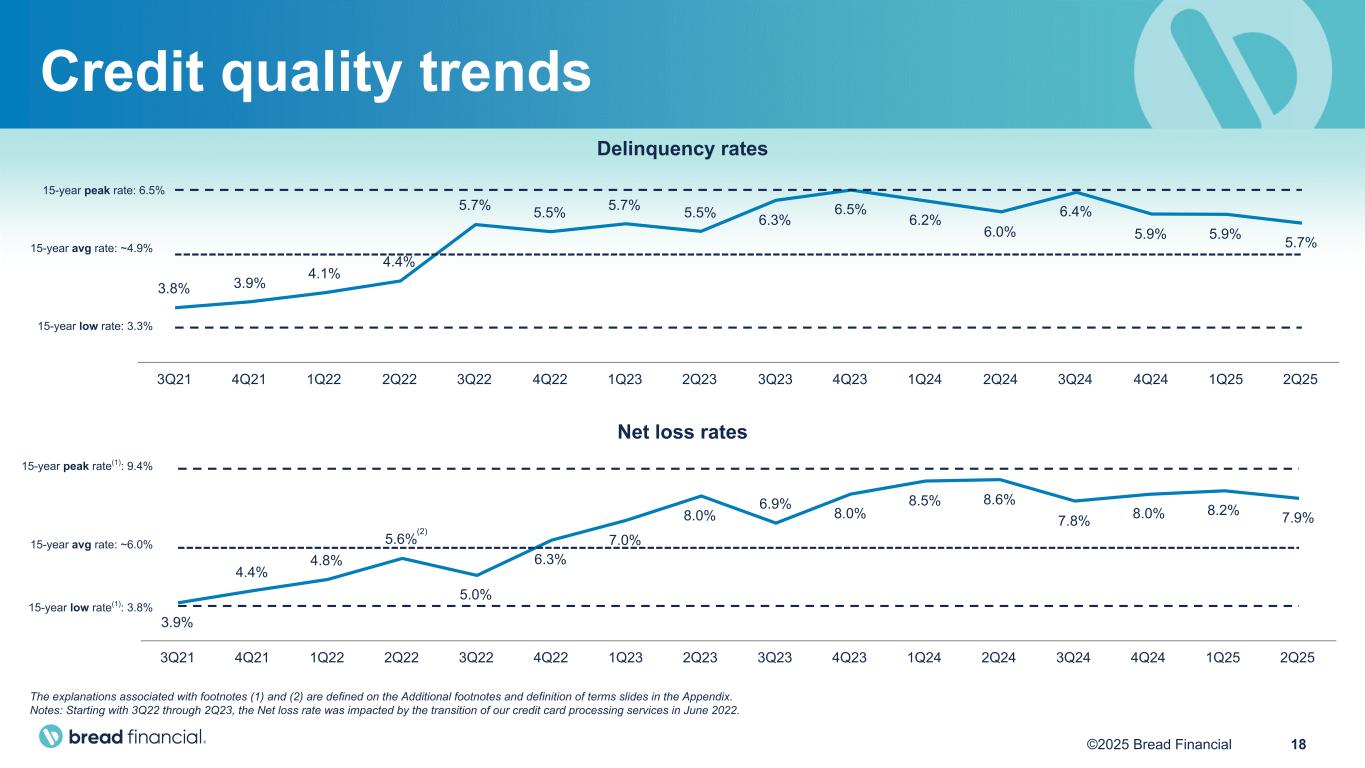14©2025 Bread Financial Continuing operations ($ in millions) 2Q23 3Q23 4Q23 1Q24 2Q24 3Q24 4Q24 1Q25 2Q25 YTD '24 YTD '25 Credit sales $ 7,057 $ 6,668 $ 7,802 $ 6,030 $ 6,570 $ 6,464 $ 7,898 $ 6,106 $ 6,814 $ 12,600 $ 12,920 Year-over-year change (13%) (13%) (23%) (18%) (7%) (3%) 1% 1% 4% (13%) 3% Average credit card and other loans $ 17,652 $ 17,540 $ 18,267 $ 18,546 $ 17,872 $ 17,766 $ 18,156 $ 18,164 $ 17,686 $ 18,209 $ 17,924 Year-over-year change 4% —% (8%) (4%) 1% 1% (1%) (2%) (1%) (2%) (2%) End-of-period credit card and other loans $ 17,962 $ 17,922 $ 19,333 $ 18,185 $ 17,743 $ 17,933 $ 18,896 $ 17,815 $ 17,656 $ 17,743 $ 17,656 Year-over-year change 1% (1%) (10%) 1% (1%) —% (2%) (2%) —% (1%) —% End-of-period direct-to-consumer deposits $ 5,993 $ 6,098 $ 6,454 $ 6,984 $ 7,193 $ 7,483 $ 7,687 $ 7,922 $ 8,080 $ 7,193 $ 8,080 Year-over-year change 43% 18% 18% 24% 20% 23% 19% 13% 12% 20% 12% Return on average assets(1) 1.2% 3.2% 0.8% 2.4% 2.4% 0.1% 0.1% 2.5% 2.5% 2.4% 2.5% Return on average equity(2) 9.4% 24.8% 6.2% 17.5% 16.7% 0.4% 0.9% 17.7% 17.5% 17.1% 17.6% Return on average tangible common equity(3) 13.2% 34.3% 8.5% 23.1% 21.8% 0.5% 1.2% 23.0% 22.7% 22.5% 22.8% Net interest margin(4) 18.7% 20.6% 19.6% 18.7% 18.0% 18.8% 17.8% 18.1% 17.7% 18.3% 17.9% Loan yield(5) 26.1% 28.6% 27.7% 27.0% 26.4% 27.4% 25.7% 26.5% 26.0% 26.7% 26.3% Efficiency ratio(6) 55.7% 48.7% 50.8% 48.6% 49.9% 58.4% 57.8% 49.1% 51.8% 49.2% 50.4% Common equity tier 1 capital ratio(7) 12.1% 12.9% 12.2% 12.6% 13.8% 13.3% 12.4% 12.0% 13.0% 13.8% 13.0% Tangible book value per common share(8) $ 38.99 $ 42.45 $ 43.70 $ 45.96 $ 48.89 $ 47.48 $ 46.97 $ 48.92 $ 52.21 $ 48.89 $ 52.21 Payment rate(9) 14.9% 14.5% 14.2% 14.4% 14.6% 14.4% 14.7% 14.8% 15.0% 14.5% 14.9% Delinquency rate 5.5% 6.3% 6.5% 6.2% 6.0% 6.4% 5.9% 5.9% 5.7% 6.0% 5.7% Net loss rate 8.0% 6.9% 8.0% 8.5% 8.6% 7.8% 8.0% 8.2% 7.9% 8.6% 8.0% Reserve rate 12.3% 12.3% 12.0% 12.4% 12.2% 12.2% 11.9% 12.2% 11.9% 12.2% 11.9% The terms associated with footnotes (1) through (9) are defined on the Additional footnotes and definition of terms slides in the Appendix. Note: Starting with 3Q22 through 2Q23, the Net loss rate was impacted by the transition of our credit card processing services in June 2022. Summary financial highlights – trending