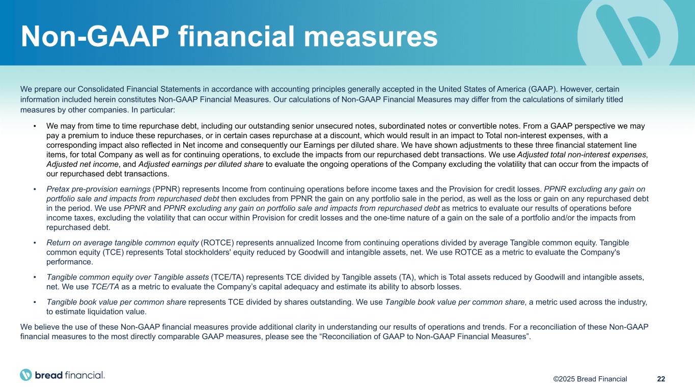 22©2025 Bread Financial We prepare our Consolidated Financial Statements in accordance with accounting principles generally accepted in the United States of America (GAAP). However, certain information included herein constitutes Non-GAAP Financial Measures. Our calculations of Non-GAAP Financial Measures may differ from the calculations of similarly titled measures by other companies. In particular: • We may from time to time repurchase debt, including our outstanding senior unsecured notes, subordinated notes or convertible notes. From a GAAP perspective we may pay a premium to induce these repurchases, or in certain cases repurchase at a discount, which would result in an impact to Total non-interest expenses, with a corresponding impact also reflected in Net income and consequently our Earnings per diluted share. We have shown adjustments to these three financial statement line items, for total Company as well as for continuing operations, to exclude the impacts from our repurchased debt transactions. We use Adjusted total non-interest expenses, Adjusted net income, and Adjusted earnings per diluted share to evaluate the ongoing operations of the Company excluding the volatility that can occur from the impacts of our repurchased debt transactions. • Pretax pre-provision earnings (PPNR) represents Income from continuing operations before income taxes and the Provision for credit losses. PPNR excluding any gain on portfolio sale and impacts from repurchased debt then excludes from PPNR the gain on any portfolio sale in the period, as well as the loss or gain on any repurchased debt in the period. We use PPNR and PPNR excluding any gain on portfolio sale and impacts from repurchased debt as metrics to evaluate our results of operations before income taxes, excluding the volatility that can occur within Provision for credit losses and the one-time nature of a gain on the sale of a portfolio and/or the impacts from repurchased debt. • Return on average tangible common equity (ROTCE) represents annualized Income from continuing operations divided by average Tangible common equity. Tangible common equity (TCE) represents Total stockholders' equity reduced by Goodwill and intangible assets, net. We use ROTCE as a metric to evaluate the Company's performance. • Tangible common equity over Tangible assets (TCE/TA) represents TCE divided by Tangible assets (TA), which is Total assets reduced by Goodwill and intangible assets, net. We use TCE/TA as a metric to evaluate the Company’s capital adequacy and estimate its ability to absorb losses. • Tangible book value per common share represents TCE divided by shares outstanding. We use Tangible book value per common share, a metric used across the industry, to estimate liquidation value. We believe the use of these Non-GAAP financial measures provide additional clarity in understanding our results of operations and trends. For a reconciliation of these Non-GAAP financial measures to the most directly comparable GAAP measures, please see the “Reconciliation of GAAP to Non-GAAP Financial Measures”. Non-GAAP financial measures