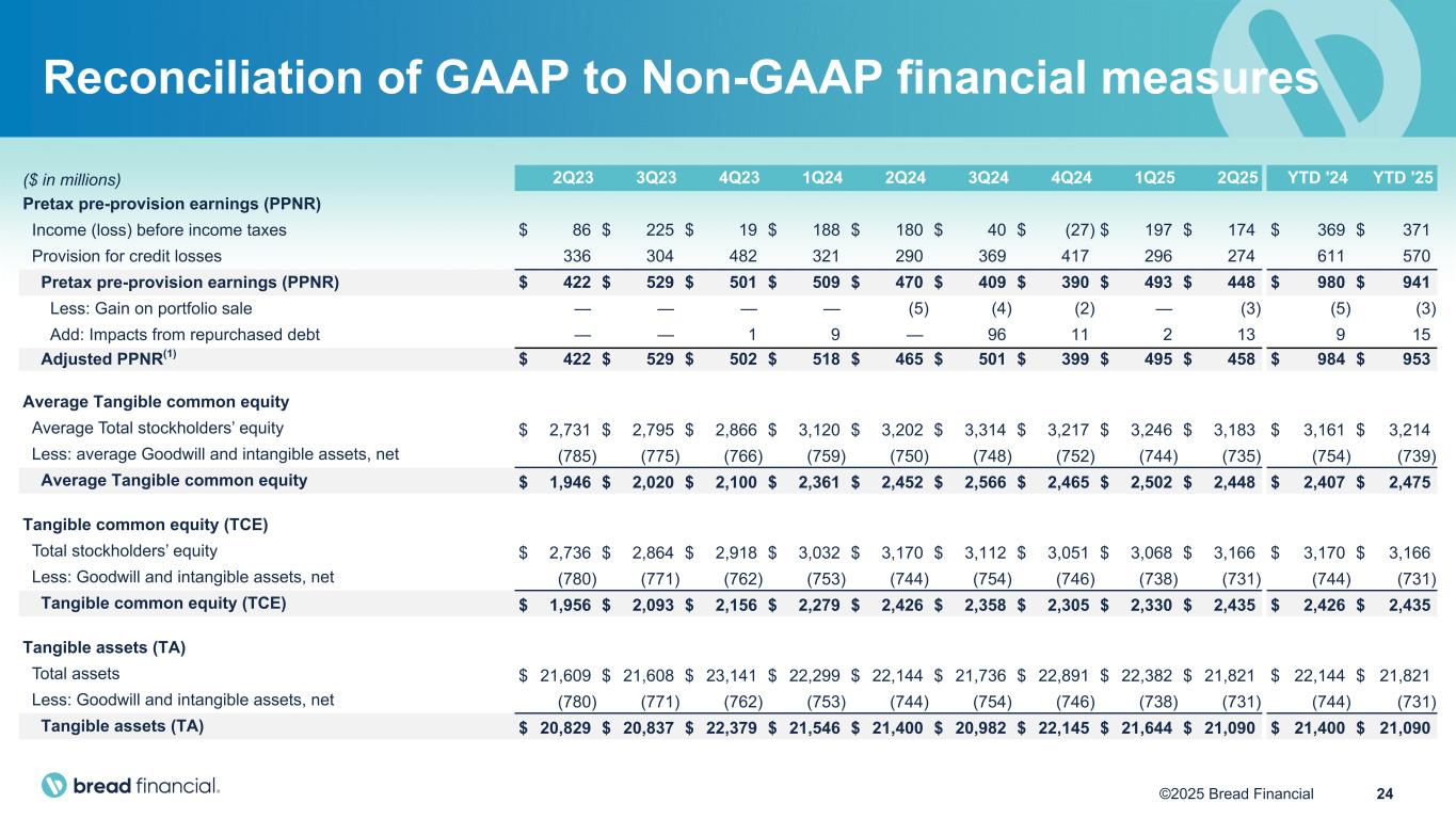 24©2025 Bread Financial ($ in millions) 2Q23 3Q23 4Q23 1Q24 2Q24 3Q24 4Q24 1Q25 2Q25 YTD '24 YTD '25 Pretax pre-provision earnings (PPNR) Income (loss) before income taxes $ 86 $ 225 $ 19 $ 188 $ 180 $ 40 $ (27) $ 197 $ 174 $ 369 $ 371 Provision for credit losses 336 304 482 321 290 369 417 296 274 611 570 Pretax pre-provision earnings (PPNR) $ 422 $ 529 $ 501 $ 509 $ 470 $ 409 $ 390 $ 493 $ 448 $ 980 $ 941 Less: Gain on portfolio sale — — — — (5) (4) (2) — (3) (5) (3) Add: Impacts from repurchased debt — — 1 9 — 96 11 2 13 9 15 Adjusted PPNR(1) $ 422 $ 529 $ 502 $ 518 $ 465 $ 501 $ 399 $ 495 $ 458 $ 984 $ 953 Average Tangible common equity Average Total stockholders’ equity $ 2,731 $ 2,795 $ 2,866 $ 3,120 $ 3,202 $ 3,314 $ 3,217 $ 3,246 $ 3,183 $ 3,161 $ 3,214 Less: average Goodwill and intangible assets, net (785) (775) (766) (759) (750) (748) (752) (744) (735) (754) (739) Average Tangible common equity $ 1,946 $ 2,020 $ 2,100 $ 2,361 $ 2,452 $ 2,566 $ 2,465 $ 2,502 $ 2,448 $ 2,407 $ 2,475 Tangible common equity (TCE) Total stockholders’ equity $ 2,736 $ 2,864 $ 2,918 $ 3,032 $ 3,170 $ 3,112 $ 3,051 $ 3,068 $ 3,166 $ 3,170 $ 3,166 Less: Goodwill and intangible assets, net (780) (771) (762) (753) (744) (754) (746) (738) (731) (744) (731) Tangible common equity (TCE) $ 1,956 $ 2,093 $ 2,156 $ 2,279 $ 2,426 $ 2,358 $ 2,305 $ 2,330 $ 2,435 $ 2,426 $ 2,435 Tangible assets (TA) Total assets $ 21,609 $ 21,608 $ 23,141 $ 22,299 $ 22,144 $ 21,736 $ 22,891 $ 22,382 $ 21,821 $ 22,144 $ 21,821 Less: Goodwill and intangible assets, net (780) (771) (762) (753) (744) (754) (746) (738) (731) (744) (731) Tangible assets (TA) $ 20,829 $ 20,837 $ 22,379 $ 21,546 $ 21,400 $ 20,982 $ 22,145 $ 21,644 $ 21,090 $ 21,400 $ 21,090 Reconciliation of GAAP to Non-GAAP financial measures