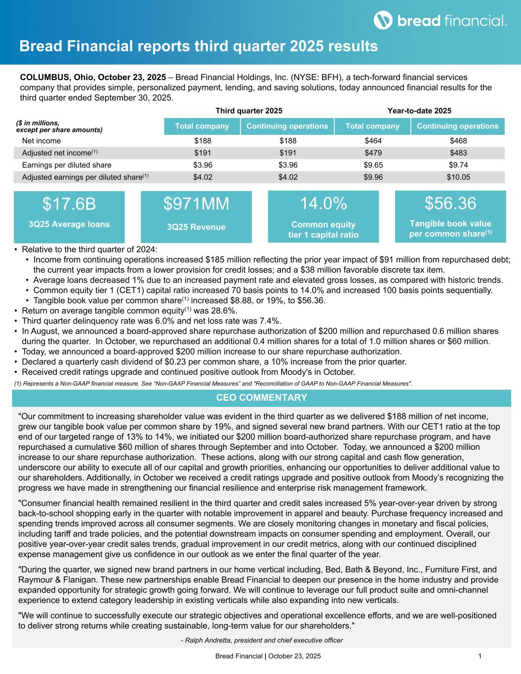 Bread Financial | October 23, 2025 1 Bread Financial reports third quarter 2025 results COLUMBUS, Ohio, October 23, 2025 – Bread Financial Holdings, Inc. (NYSE: BFH), a tech-forward financial services company that provides simple, personalized payment, lending, and saving solutions, today announced financial results for the third quarter ended September 30, 2025. (1) Represents a Non-GAAP financial measure. See “Non-GAAP Financial Measures” and "Reconciliation of GAAP to Non-GAAP Financial Measures". $17.6B 3Q25 Average loans $971MM 3Q25 Revenue 14.0% Common equity tier 1 capital ratio $56.36 Tangible book value per common share(1) Third quarter 2025 Year-to-date 2025 ($ in millions, except per share amounts) Total company Continuing operations Total company Continuing operations Net income $188 $188 $464 $468 Adjusted net income(1) $191 $191 $479 $483 Earnings per diluted share $3.96 $3.96 $9.65 $9.74 Adjusted earnings per diluted share(1) $4.02 $4.02 $9.96 $10.05 • Relative to the third quarter of 2024: • Income from continuing operations increased $185 million reflecting the prior year impact of $91 million from repurchased debt; the current year impacts from a lower provision for credit losses; and a $38 million favorable discrete tax item. • Average loans decreased 1% due to an increased payment rate and elevated gross losses, as compared with historic trends. • Common equity tier 1 (CET1) capital ratio increased 70 basis points to 14.0% and increased 100 basis points sequentially. • Tangible book value per common share(1) increased $8.88, or 19%, to $56.36. • Return on average tangible common equity(1) was 28.6%. • Third quarter delinquency rate was 6.0% and net loss rate was 7.4%. • In August, we announced a board-approved share repurchase authorization of $200 million and repurchased 0.6 million shares during the quarter. In October, we repurchased an additional 0.4 million shares for a total of 1.0 million shares or $60 million. • Today, we announced a board-approved $200 million increase to our share repurchase authorization. • Declared a quarterly cash dividend of $0.23 per common share, a 10% increase from the prior quarter. • Received credit ratings upgrade and continued positive outlook from Moody's in October. CEO COMMENTARY "Our commitment to increasing shareholder value was evident in the third quarter as we delivered $188 million of net income, grew our tangible book value per common share by 19%, and signed several new brand partners. With our CET1 ratio at the top end of our targeted range of 13% to 14%, we initiated our $200 million board-authorized share repurchase program, and have repurchased a cumulative $60 million of shares through September and into October. Today, we announced a $200 million increase to our share repurchase authorization. These actions, along with our strong capital and cash flow generation, underscore our ability to execute all of our capital and growth priorities, enhancing our opportunities to deliver additional value to our shareholders. Additionally, in October we received a credit ratings upgrade and positive outlook from Moody’s recognizing the progress we have made in strengthening our financial resilience and enterprise risk management framework. "Consumer financial health remained resilient in the third quarter and credit sales increased 5% year-over-year driven by strong back-to-school shopping early in the quarter with notable improvement in apparel and beauty. Purchase frequency increased and spending trends improved across all consumer segments. We are closely monitoring changes in monetary and fiscal policies, including tariff and trade policies, and the potential downstream impacts on consumer spending and employment. Overall, our positive year-over-year credit sales trends, gradual improvement in our credit metrics, along with our continued disciplined expense management give us confidence in our outlook as we enter the final quarter of the year. "During the quarter, we signed new brand partners in our home vertical including, Bed, Bath & Beyond, Inc., Furniture First, and Raymour & Flanigan. These new partnerships enable Bread Financial to deepen our presence in the home industry and provide expanded opportunity for strategic growth going forward. We will continue to leverage our full product suite and omni-channel experience to extend category leadership in existing verticals while also expanding into new verticals. "We will continue to successfully execute our strategic objectives and operational excellence efforts, and we are well-positioned to deliver strong returns while creating sustainable, long-term value for our shareholders." - Ralph Andretta, president and chief executive officer