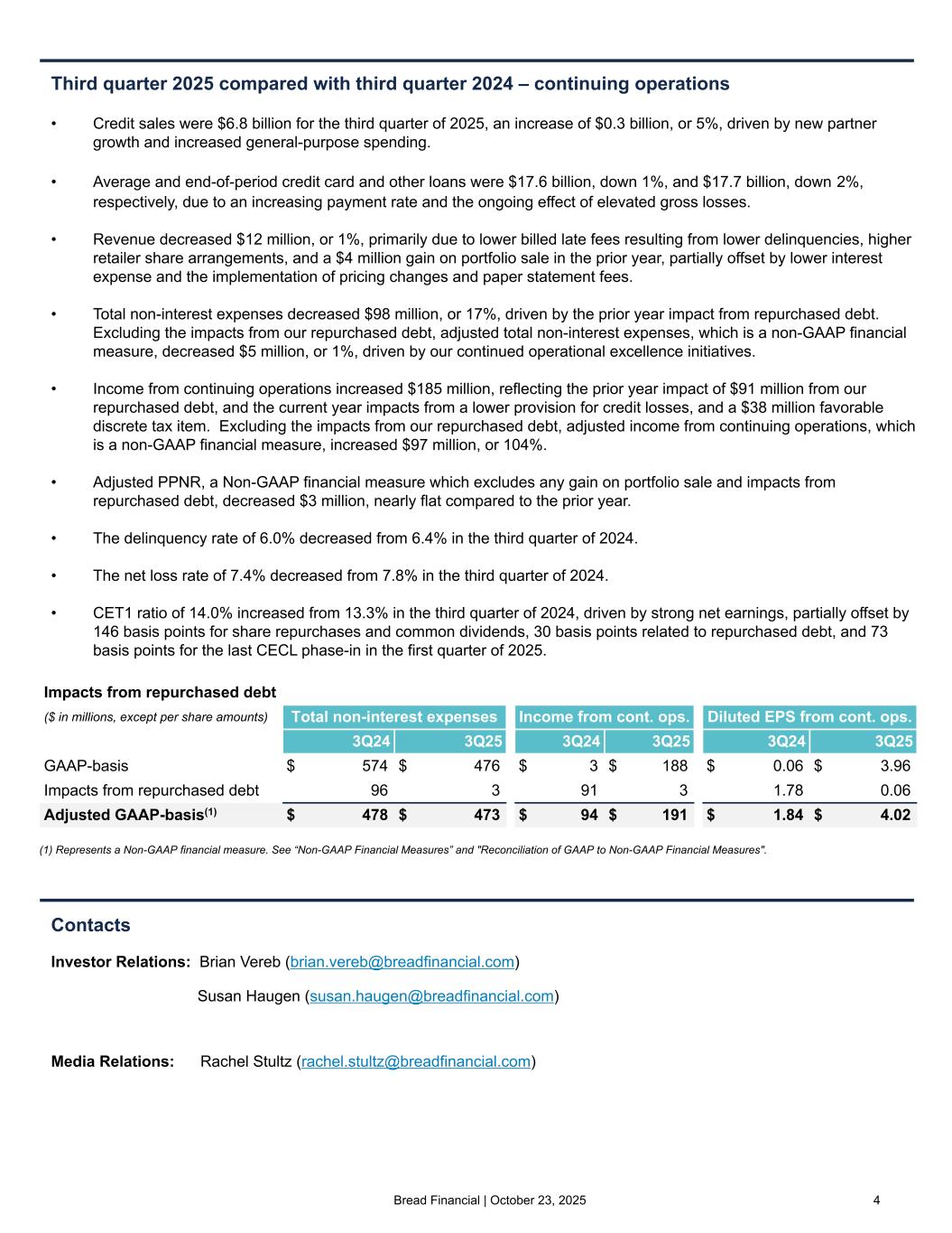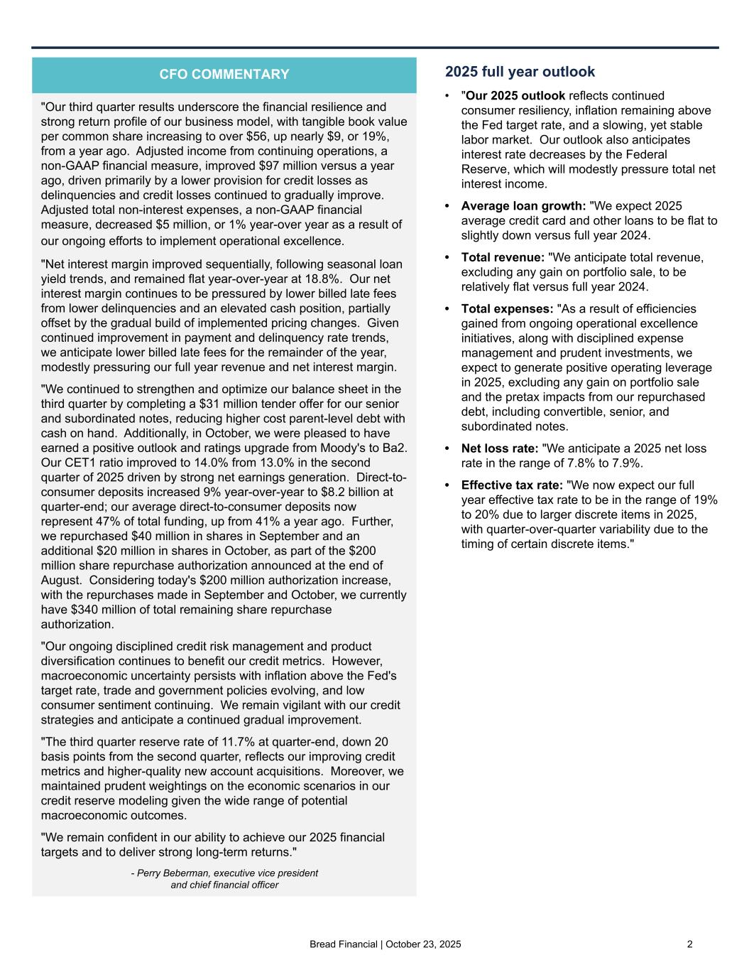 Bread Financial | October 23, 2025 2 "Our third quarter results underscore the financial resilience and strong return profile of our business model, with tangible book value per common share increasing to over $56, up nearly $9, or 19%, from a year ago. Adjusted income from continuing operations, a non-GAAP financial measure, improved $97 million versus a year ago, driven primarily by a lower provision for credit losses as delinquencies and credit losses continued to gradually improve. Adjusted total non-interest expenses, a non-GAAP financial measure, decreased $5 million, or 1% year-over year as a result of our ongoing efforts to implement operational excellence. "Net interest margin improved sequentially, following seasonal loan yield trends, and remained flat year-over-year at 18.8%. Our net interest margin continues to be pressured by lower billed late fees from lower delinquencies and an elevated cash position, partially offset by the gradual build of implemented pricing changes. Given continued improvement in payment and delinquency rate trends, we anticipate lower billed late fees for the remainder of the year, modestly pressuring our full year revenue and net interest margin. "We continued to strengthen and optimize our balance sheet in the third quarter by completing a $31 million tender offer for our senior and subordinated notes, reducing higher cost parent-level debt with cash on hand. Additionally, in October, we were pleased to have earned a positive outlook and ratings upgrade from Moody's to Ba2. Our CET1 ratio improved to 14.0% from 13.0% in the second quarter of 2025 driven by strong net earnings generation. Direct-to- consumer deposits increased 9% year-over-year to $8.2 billion at quarter-end; our average direct-to-consumer deposits now represent 47% of total funding, up from 41% a year ago. Further, we repurchased $40 million in shares in September and an additional $20 million in shares in October, as part of the $200 million share repurchase authorization announced at the end of August. Considering today's $200 million authorization increase, with the repurchases made in September and October, we currently have $340 million of total remaining share repurchase authorization. "Our ongoing disciplined credit risk management and product diversification continues to benefit our credit metrics. However, macroeconomic uncertainty persists with inflation above the Fed's target rate, trade and government policies evolving, and low consumer sentiment continuing. We remain vigilant with our credit strategies and anticipate a continued gradual improvement. "The third quarter reserve rate of 11.7% at quarter-end, down 20 basis points from the second quarter, reflects our improving credit metrics and higher-quality new account acquisitions. Moreover, we maintained prudent weightings on the economic scenarios in our credit reserve modeling given the wide range of potential macroeconomic outcomes. "We remain confident in our ability to achieve our 2025 financial targets and to deliver strong long-term returns." - Perry Beberman, executive vice president and chief financial officer 2025 full year outlook • "Our 2025 outlook reflects continued consumer resiliency, inflation remaining above the Fed target rate, and a slowing, yet stable labor market. Our outlook also anticipates interest rate decreases by the Federal Reserve, which will modestly pressure total net interest income. • Average loan growth: "We expect 2025 average credit card and other loans to be flat to slightly down versus full year 2024. • Total revenue: "We anticipate total revenue, excluding any gain on portfolio sale, to be relatively flat versus full year 2024. • Total expenses: "As a result of efficiencies gained from ongoing operational excellence initiatives, along with disciplined expense management and prudent investments, we expect to generate positive operating leverage in 2025, excluding any gain on portfolio sale and the pretax impacts from our repurchased debt, including convertible, senior, and subordinated notes. • Net loss rate: "We anticipate a 2025 net loss rate in the range of 7.8% to 7.9%. • Effective tax rate: "We now expect our full year effective tax rate to be in the range of 19% to 20% due to larger discrete items in 2025, with quarter-over-quarter variability due to the timing of certain discrete items." CFO COMMENTARY