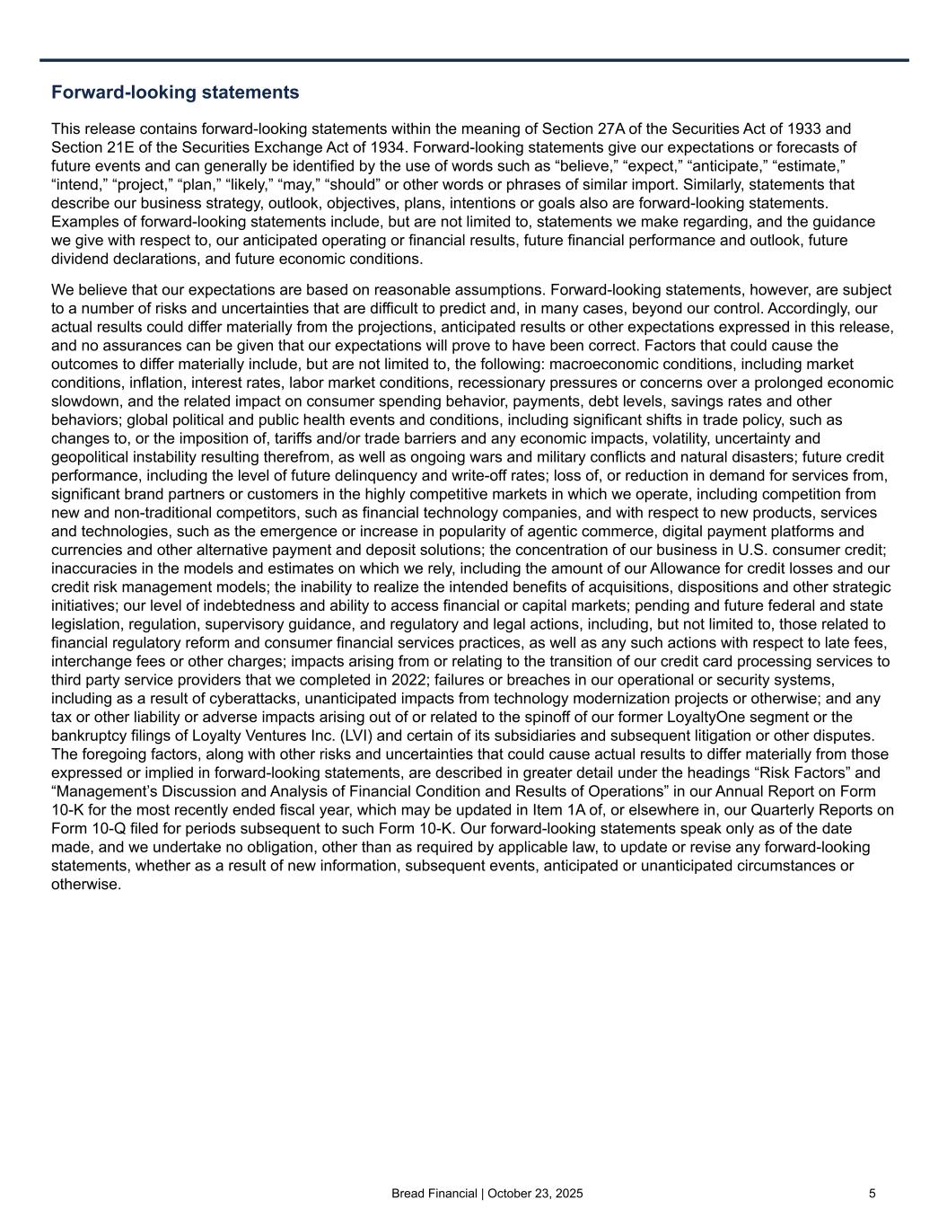 Bread Financial | October 23, 2025 4 Third quarter 2025 compared with third quarter 2024 – continuing operations • Credit sales were $6.8 billion for the third quarter of 2025, an increase of $0.3 billion, or 5%, driven by new partner growth and increased general-purpose spending. • Average and end-of-period credit card and other loans were $17.6 billion, down 1%, and $17.7 billion, down 2%, respectively, due to an increasing payment rate and the ongoing effect of elevated gross losses. • Revenue decreased $12 million, or 1%, primarily due to lower billed late fees resulting from lower delinquencies, higher retailer share arrangements, and a $4 million gain on portfolio sale in the prior year, partially offset by lower interest expense and the implementation of pricing changes and paper statement fees. • Total non-interest expenses decreased $98 million, or 17%, driven by the prior year impact from repurchased debt. Excluding the impacts from our repurchased debt, adjusted total non-interest expenses, which is a non-GAAP financial measure, decreased $5 million, or 1%, driven by our continued operational excellence initiatives. • Income from continuing operations increased $185 million, reflecting the prior year impact of $91 million from our repurchased debt, and the current year impacts from a lower provision for credit losses, and a $38 million favorable discrete tax item. Excluding the impacts from our repurchased debt, adjusted income from continuing operations, which is a non-GAAP financial measure, increased $97 million, or 104%. • Adjusted PPNR, a Non-GAAP financial measure which excludes any gain on portfolio sale and impacts from repurchased debt, decreased $3 million, nearly flat compared to the prior year. • The delinquency rate of 6.0% decreased from 6.4% in the third quarter of 2024. • The net loss rate of 7.4% decreased from 7.8% in the third quarter of 2024. • CET1 ratio of 14.0% increased from 13.3% in the third quarter of 2024, driven by strong net earnings, partially offset by 146 basis points for share repurchases and common dividends, 30 basis points related to repurchased debt, and 73 basis points for the last CECL phase-in in the first quarter of 2025. Contacts Investor Relations: Brian Vereb (brian.vereb@breadfinancial.com) Susan Haugen (susan.haugen@breadfinancial.com) Media Relations: Rachel Stultz (rachel.stultz@breadfinancial.com) (1) Represents a Non-GAAP financial measure. See “Non-GAAP Financial Measures” and "Reconciliation of GAAP to Non-GAAP Financial Measures". Impacts from repurchased debt ($ in millions, except per share amounts) Total non-interest expenses Income from cont. ops. Diluted EPS from cont. ops. 3Q24 3Q25 3Q24 3Q25 3Q24 3Q25 GAAP-basis $ 574 $ 476 $ 3 $ 188 $ 0.06 $ 3.96 Impacts from repurchased debt 96 3 91 3 1.78 0.06 Adjusted GAAP-basis(1) $ 478 $ 473 $ 94 $ 191 $ 1.84 $ 4.02
