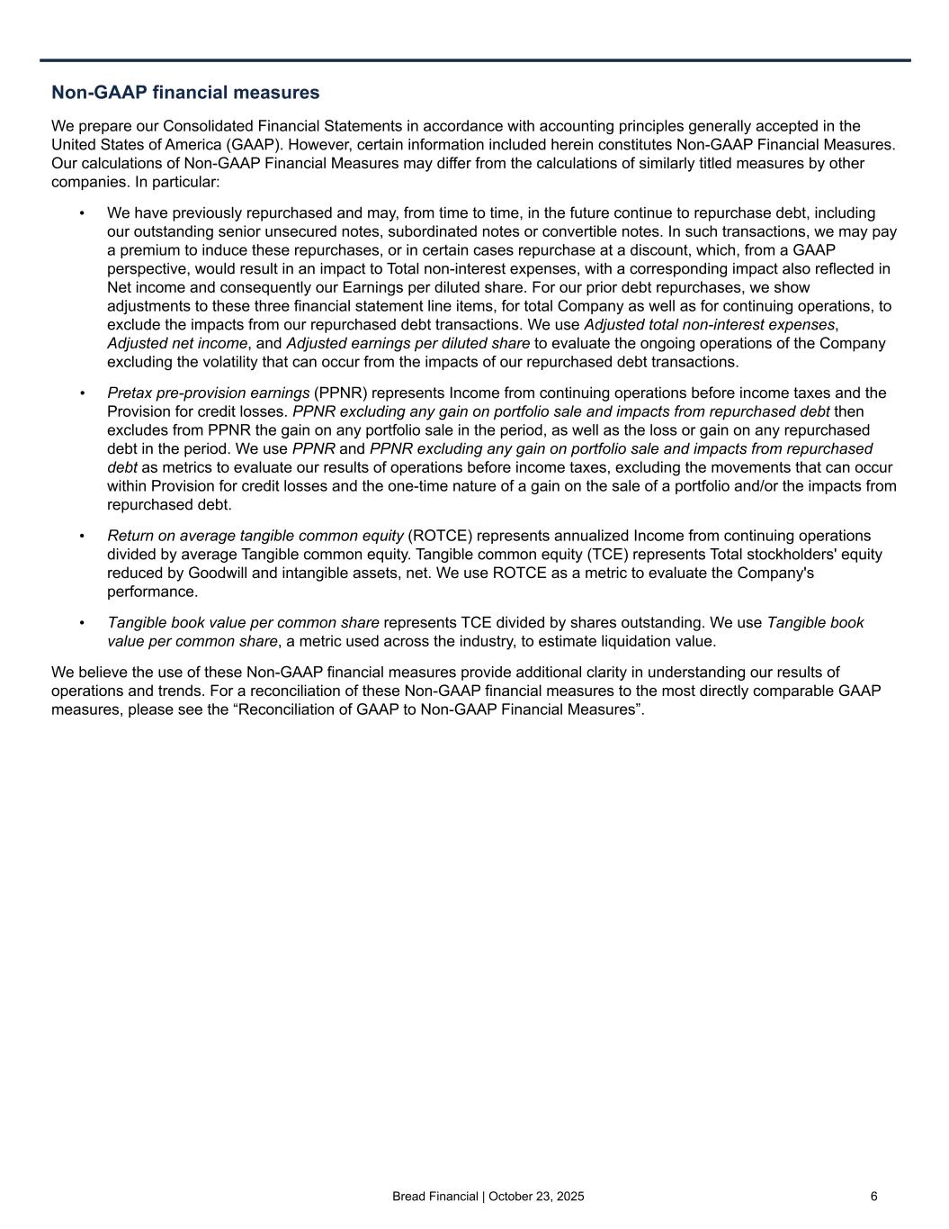 Bread Financial | October 23, 2025 6 Non-GAAP financial measures We prepare our Consolidated Financial Statements in accordance with accounting principles generally accepted in the United States of America (GAAP). However, certain information included herein constitutes Non-GAAP Financial Measures. Our calculations of Non-GAAP Financial Measures may differ from the calculations of similarly titled measures by other companies. In particular: • We have previously repurchased and may, from time to time, in the future continue to repurchase debt, including our outstanding senior unsecured notes, subordinated notes or convertible notes. In such transactions, we may pay a premium to induce these repurchases, or in certain cases repurchase at a discount, which, from a GAAP perspective, would result in an impact to Total non-interest expenses, with a corresponding impact also reflected in Net income and consequently our Earnings per diluted share. For our prior debt repurchases, we show adjustments to these three financial statement line items, for total Company as well as for continuing operations, to exclude the impacts from our repurchased debt transactions. We use Adjusted total non-interest expenses, Adjusted net income, and Adjusted earnings per diluted share to evaluate the ongoing operations of the Company excluding the volatility that can occur from the impacts of our repurchased debt transactions. • Pretax pre-provision earnings (PPNR) represents Income from continuing operations before income taxes and the Provision for credit losses. PPNR excluding any gain on portfolio sale and impacts from repurchased debt then excludes from PPNR the gain on any portfolio sale in the period, as well as the loss or gain on any repurchased debt in the period. We use PPNR and PPNR excluding any gain on portfolio sale and impacts from repurchased debt as metrics to evaluate our results of operations before income taxes, excluding the movements that can occur within Provision for credit losses and the one-time nature of a gain on the sale of a portfolio and/or the impacts from repurchased debt. • Return on average tangible common equity (ROTCE) represents annualized Income from continuing operations divided by average Tangible common equity. Tangible common equity (TCE) represents Total stockholders' equity reduced by Goodwill and intangible assets, net. We use ROTCE as a metric to evaluate the Company's performance. • Tangible book value per common share represents TCE divided by shares outstanding. We use Tangible book value per common share, a metric used across the industry, to estimate liquidation value. We believe the use of these Non-GAAP financial measures provide additional clarity in understanding our results of operations and trends. For a reconciliation of these Non-GAAP financial measures to the most directly comparable GAAP measures, please see the “Reconciliation of GAAP to Non-GAAP Financial Measures”.