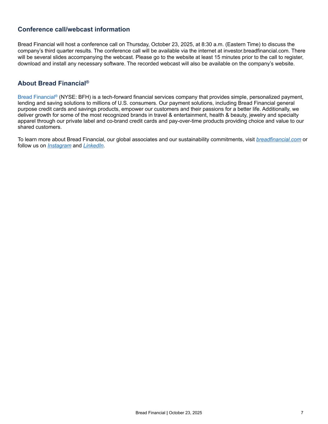 Bread Financial | October 23, 2025 7 Conference call/webcast information Bread Financial will host a conference call on Thursday, October 23, 2025, at 8:30 a.m. (Eastern Time) to discuss the company’s third quarter results. The conference call will be available via the internet at investor.breadfinancial.com. There will be several slides accompanying the webcast. Please go to the website at least 15 minutes prior to the call to register, download and install any necessary software. The recorded webcast will also be available on the company’s website. About Bread Financial® Bread Financial® (NYSE: BFH) is a tech-forward financial services company that provides simple, personalized payment, lending and saving solutions to millions of U.S. consumers. Our payment solutions, including Bread Financial general purpose credit cards and savings products, empower our customers and their passions for a better life. Additionally, we deliver growth for some of the most recognized brands in travel & entertainment, health & beauty, jewelry and specialty apparel through our private label and co-brand credit cards and pay-over-time products providing choice and value to our shared customers.      To learn more about Bread Financial, our global associates and our sustainability commitments, visit breadfinancial.com or follow us on Instagram and LinkedIn.