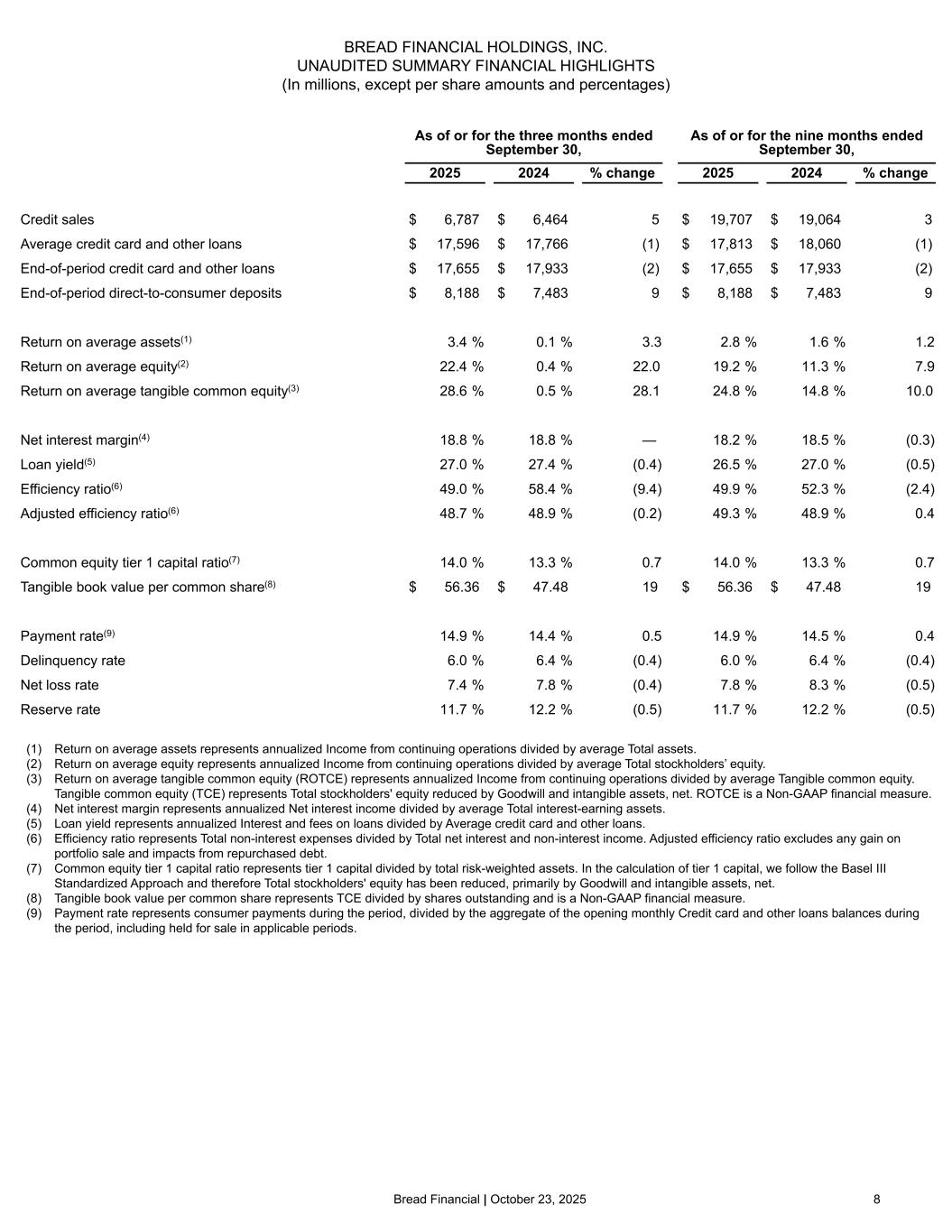 Bread Financial | October 23, 2025 8 BREAD FINANCIAL HOLDINGS, INC. UNAUDITED SUMMARY FINANCIAL HIGHLIGHTS (In millions, except per share amounts and percentages) As of or for the three months ended September 30, As of or for the nine months ended September 30, 2025 2024 % change 2025 2024 % change Credit sales $ 6,787 $ 6,464 5 $ 19,707 $ 19,064 3 Average credit card and other loans $ 17,596 $ 17,766 (1) $ 17,813 $ 18,060 (1) End-of-period credit card and other loans $ 17,655 $ 17,933 (2) $ 17,655 $ 17,933 (2) End-of-period direct-to-consumer deposits $ 8,188 $ 7,483 9 $ 8,188 $ 7,483 9 Return on average assets(1) 3.4 % 0.1 % 3.3 2.8 % 1.6 % 1.2 Return on average equity(2) 22.4 % 0.4 % 22.0 19.2 % 11.3 % 7.9 Return on average tangible common equity(3) 28.6 % 0.5 % 28.1 24.8 % 14.8 % 10.0 Net interest margin(4) 18.8 % 18.8 % — 18.2 % 18.5 % (0.3) Loan yield(5) 27.0 % 27.4 % (0.4) 26.5 % 27.0 % (0.5) Efficiency ratio(6) 49.0 % 58.4 % (9.4) 49.9 % 52.3 % (2.4) Adjusted efficiency ratio(6) 48.7 % 48.9 % (0.2) 49.3 % 48.9 % 0.4 Common equity tier 1 capital ratio(7) 14.0 % 13.3 % 0.7 14.0 % 13.3 % 0.7 Tangible book value per common share(8) $ 56.36 $ 47.48 19 $ 56.36 $ 47.48 19 Payment rate(9) 14.9 % 14.4 % 0.5 14.9 % 14.5 % 0.4 Delinquency rate 6.0 % 6.4 % (0.4) 6.0 % 6.4 % (0.4) Net loss rate 7.4 % 7.8 % (0.4) 7.8 % 8.3 % (0.5) Reserve rate 11.7 % 12.2 % (0.5) 11.7 % 12.2 % (0.5) (1) Return on average assets represents annualized Income from continuing operations divided by average Total assets. (2) Return on average equity represents annualized Income from continuing operations divided by average Total stockholders’ equity. (3) Return on average tangible common equity (ROTCE) represents annualized Income from continuing operations divided by average Tangible common equity. Tangible common equity (TCE) represents Total stockholders' equity reduced by Goodwill and intangible assets, net. ROTCE is a Non-GAAP financial measure. (4) Net interest margin represents annualized Net interest income divided by average Total interest-earning assets. (5) Loan yield represents annualized Interest and fees on loans divided by Average credit card and other loans. (6) Efficiency ratio represents Total non-interest expenses divided by Total net interest and non-interest income. Adjusted efficiency ratio excludes any gain on portfolio sale and impacts from repurchased debt. (7) Common equity tier 1 capital ratio represents tier 1 capital divided by total risk-weighted assets. In the calculation of tier 1 capital, we follow the Basel III Standardized Approach and therefore Total stockholders' equity has been reduced, primarily by Goodwill and intangible assets, net. (8) Tangible book value per common share represents TCE divided by shares outstanding and is a Non-GAAP financial measure. (9) Payment rate represents consumer payments during the period, divided by the aggregate of the opening monthly Credit card and other loans balances during the period, including held for sale in applicable periods.
