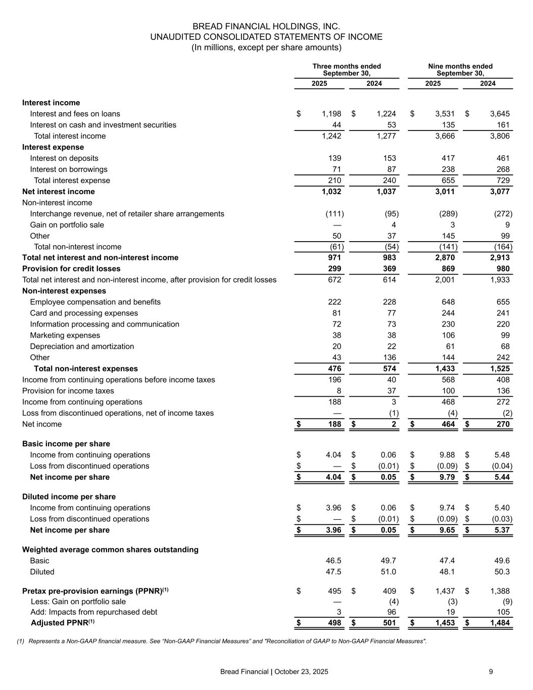 Bread Financial | October 23, 2025 9 Three months ended September 30, Nine months ended September 30, 2025 2024 2025 2024 Interest income Interest and fees on loans $ 1,198 $ 1,224 $ 3,531 $ 3,645 Interest on cash and investment securities 44 53 135 161 Total interest income 1,242 1,277 3,666 3,806 Interest expense Interest on deposits 139 153 417 461 Interest on borrowings 71 87 238 268 Total interest expense 210 240 655 729 Net interest income 1,032 1,037 3,011 3,077 Non-interest income Interchange revenue, net of retailer share arrangements (111) (95) (289) (272) Gain on portfolio sale — 4 3 9 Other 50 37 145 99 Total non-interest income (61) (54) (141) (164) Total net interest and non-interest income 971 983 2,870 2,913 Provision for credit losses 299 369 869 980 Total net interest and non-interest income, after provision for credit losses 672 614 2,001 1,933 Non-interest expenses Employee compensation and benefits 222 228 648 655 Card and processing expenses 81 77 244 241 Information processing and communication 72 73 230 220 Marketing expenses 38 38 106 99 Depreciation and amortization 20 22 61 68 Other 43 136 144 242 Total non-interest expenses 476 574 1,433 1,525 Income from continuing operations before income taxes 196 40 568 408 Provision for income taxes 8 37 100 136 Income from continuing operations 188 3 468 272 Loss from discontinued operations, net of income taxes — (1) (4) (2) Net income $ 188 $ 2 $ 464 $ 270 Basic income per share Income from continuing operations $ 4.04 $ 0.06 $ 9.88 $ 5.48 Loss from discontinued operations $ — $ (0.01) $ (0.09) $ (0.04) Net income per share $ 4.04 $ 0.05 $ 9.79 $ 5.44 Diluted income per share Income from continuing operations $ 3.96 $ 0.06 $ 9.74 $ 5.40 Loss from discontinued operations $ — $ (0.01) $ (0.09) $ (0.03) Net income per share $ 3.96 $ 0.05 $ 9.65 $ 5.37 Weighted average common shares outstanding Basic 46.5 49.7 47.4 49.6 Diluted 47.5 51.0 48.1 50.3 Pretax pre-provision earnings (PPNR)(1) $ 495 $ 409 $ 1,437 $ 1,388 Less: Gain on portfolio sale — (4) (3) (9) Add: Impacts from repurchased debt 3 96 19 105 Adjusted PPNR(1) $ 498 $ 501 $ 1,453 $ 1,484 BREAD FINANCIAL HOLDINGS, INC. UNAUDITED CONSOLIDATED STATEMENTS OF INCOME (In millions, except per share amounts) (1) Represents a Non-GAAP financial measure. See “Non-GAAP Financial Measures” and "Reconciliation of GAAP to Non-GAAP Financial Measures".