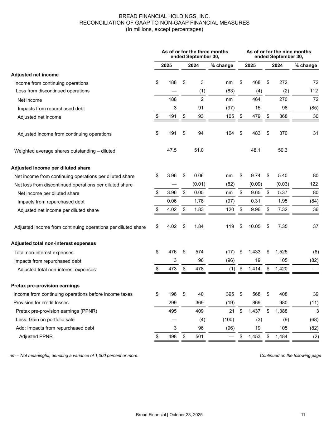 Bread Financial | October 23, 2025 11 BREAD FINANCIAL HOLDINGS, INC. RECONCILIATION OF GAAP TO NON-GAAP FINANCIAL MEASURES (In millions, except percentages) As of or for the three months ended September 30, As of or for the nine months ended September 30, 2025 2024 % change 2025 2024 % change Adjusted net income Income from continuing operations $ 188 $ 3 nm $ 468 $ 272 72 Loss from discontinued operations — (1) (83) (4) (2) 112 Net income 188 2 nm 464 270 72 Impacts from repurchased debt 3 91 (97) 15 98 (85) Adjusted net income $ 191 $ 93 105 $ 479 $ 368 30 Adjusted income from continuing operations $ 191 $ 94 104 $ 483 $ 370 31 Weighted average shares outstanding – diluted 47.5 51.0 48.1 50.3 Adjusted income per diluted share Net income from continuing operations per diluted share $ 3.96 $ 0.06 nm $ 9.74 $ 5.40 80 Net loss from discontinued operations per diluted share — (0.01) (82) (0.09) (0.03) 122 Net income per diluted share $ 3.96 $ 0.05 nm $ 9.65 $ 5.37 80 Impacts from repurchased debt 0.06 1.78 (97) 0.31 1.95 (84) Adjusted net income per diluted share $ 4.02 $ 1.83 120 $ 9.96 $ 7.32 36 Adjusted income from continuing operations per diluted share $ 4.02 $ 1.84 119 $ 10.05 $ 7.35 37 Adjusted total non-interest expenses Total non-interest expenses $ 476 $ 574 (17) $ 1,433 $ 1,525 (6) Impacts from repurchased debt 3 96 (96) 19 105 (82) Adjusted total non-interest expenses $ 473 $ 478 (1) $ 1,414 $ 1,420 — Pretax pre-provision earnings Income from continuing operations before income taxes $ 196 $ 40 395 $ 568 $ 408 39 Provision for credit losses 299 369 (19) 869 980 (11) Pretax pre-provision earnings (PPNR) 495 409 21 $ 1,437 $ 1,388 3 Less: Gain on portfolio sale — (4) (100) (3) (9) (68) Add: Impacts from repurchased debt 3 96 (96) 19 105 (82) Adjusted PPNR $ 498 $ 501 — $ 1,453 $ 1,484 (2) nm – Not meaningful, denoting a variance of 1,000 percent or more. Continued on the following page