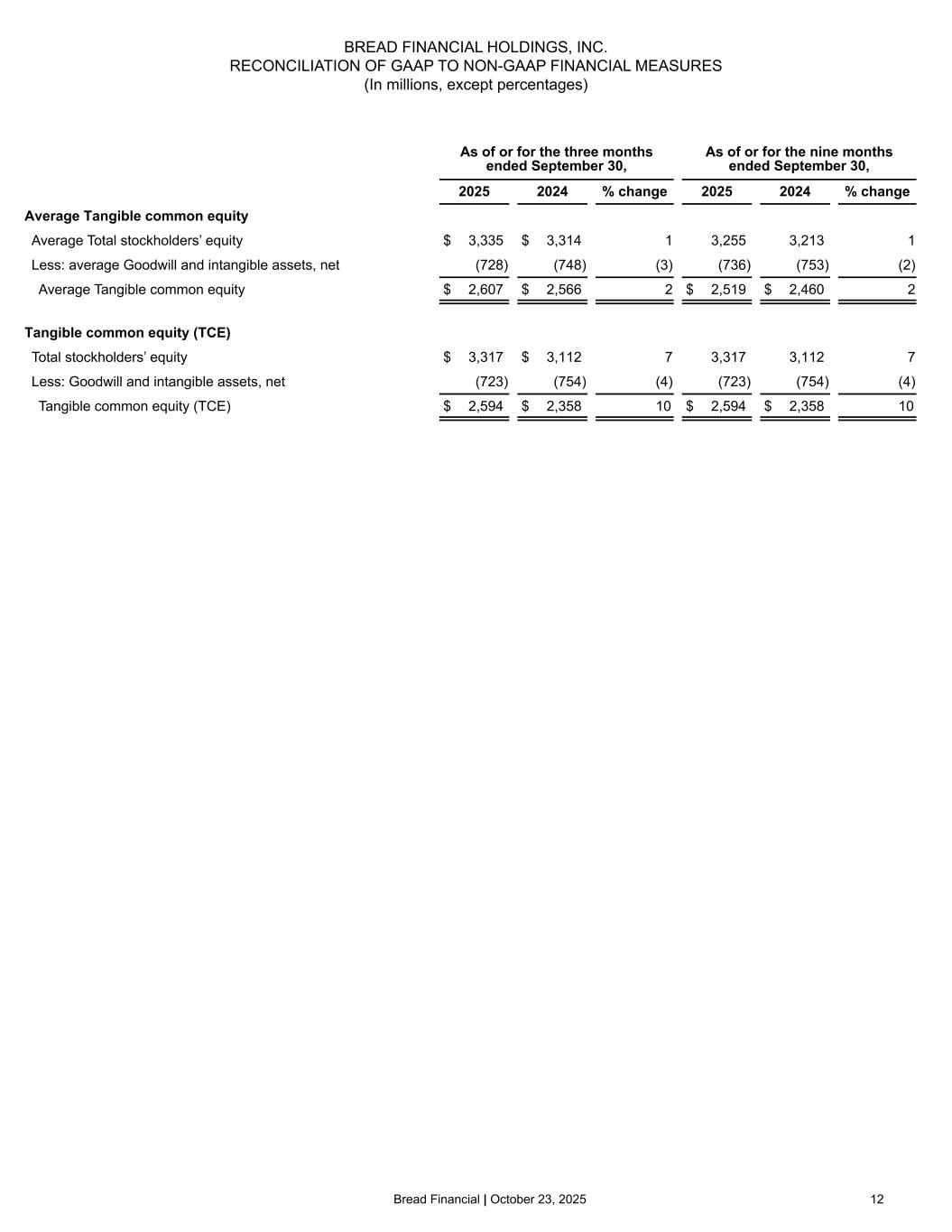 Bread Financial | October 23, 2025 12 BREAD FINANCIAL HOLDINGS, INC. RECONCILIATION OF GAAP TO NON-GAAP FINANCIAL MEASURES (In millions, except percentages) As of or for the three months ended September 30, As of or for the nine months ended September 30, 2025 2024 % change 2025 2024 % change Average Tangible common equity Average Total stockholders’ equity $ 3,335 $ 3,314 1 3,255 3,213 1 Less: average Goodwill and intangible assets, net (728) (748) (3) (736) (753) (2) Average Tangible common equity $ 2,607 $ 2,566 2 $ 2,519 $ 2,460 2 Tangible common equity (TCE) Total stockholders’ equity $ 3,317 $ 3,112 7 3,317 3,112 7 Less: Goodwill and intangible assets, net (723) (754) (4) (723) (754) (4) Tangible common equity (TCE) $ 2,594 $ 2,358 10 $ 2,594 $ 2,358 10