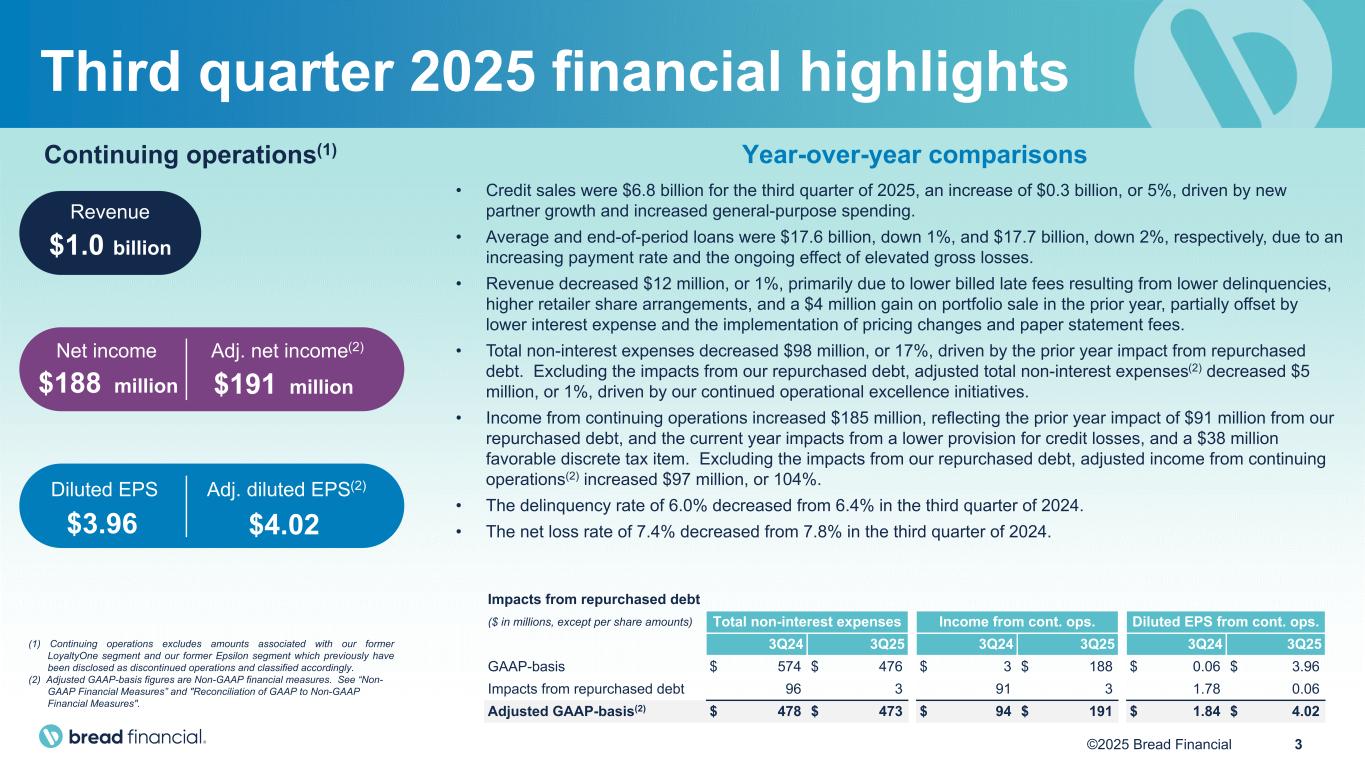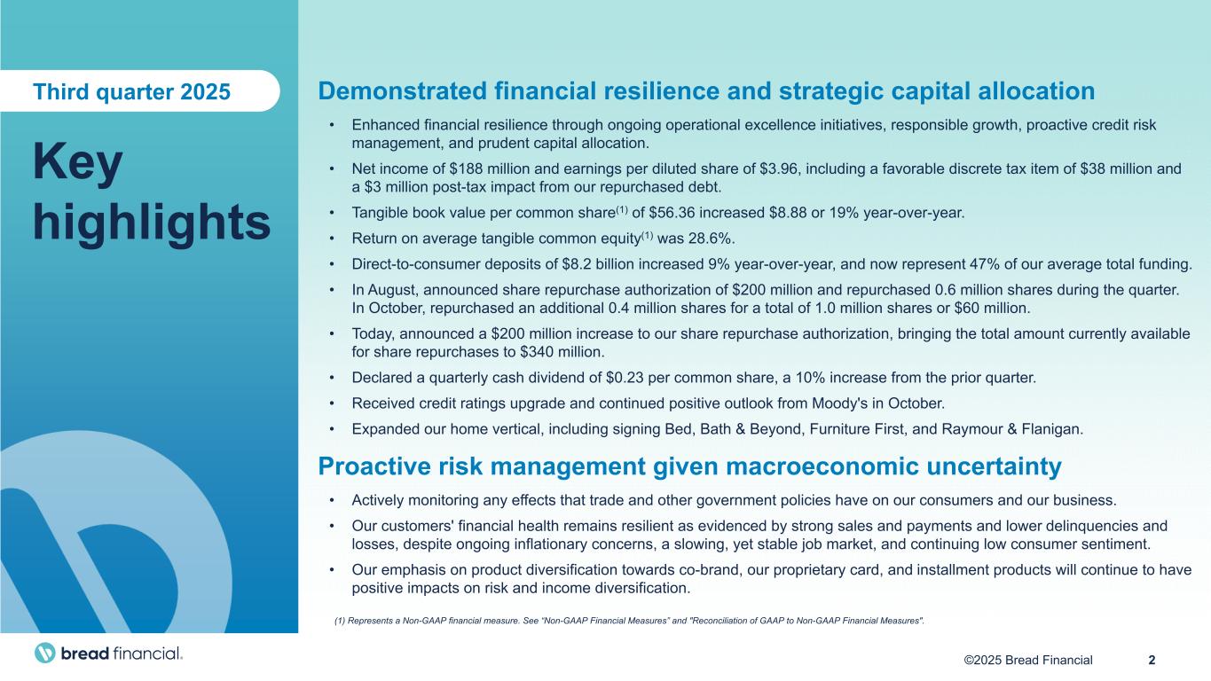2©2025 Bread Financial Key highlights Third quarter 2025 Demonstrated financial resilience and strategic capital allocation • Enhanced financial resilience through ongoing operational excellence initiatives, responsible growth, proactive credit risk management, and prudent capital allocation. • Net income of $188 million and earnings per diluted share of $3.96, including a favorable discrete tax item of $38 million and a $3 million post-tax impact from our repurchased debt. • Tangible book value per common share(1) of $56.36 increased $8.88 or 19% year-over-year. • Return on average tangible common equity(1) was 28.6%. • Direct-to-consumer deposits of $8.2 billion increased 9% year-over-year, and now represent 47% of our average total funding. • In August, announced share repurchase authorization of $200 million and repurchased 0.6 million shares during the quarter. In October, repurchased an additional 0.4 million shares for a total of 1.0 million shares or $60 million. • Today, announced a $200 million increase to our share repurchase authorization, bringing the total amount currently available for share repurchases to $340 million. • Declared a quarterly cash dividend of $0.23 per common share, a 10% increase from the prior quarter. • Received credit ratings upgrade and continued positive outlook from Moody's in October. • Expanded our home vertical, including signing Bed, Bath & Beyond, Furniture First, and Raymour & Flanigan. Proactive risk management given macroeconomic uncertainty • Actively monitoring any effects that trade and other government policies have on our consumers and our business. • Our customers' financial health remains resilient as evidenced by strong sales and payments and lower delinquencies and losses, despite ongoing inflationary concerns, a slowing, yet stable job market, and continuing low consumer sentiment. • Our emphasis on product diversification towards co-brand, our proprietary card, and installment products will continue to have positive impacts on risk and income diversification. (1) Represents a Non-GAAP financial measure. See “Non-GAAP Financial Measures” and "Reconciliation of GAAP to Non-GAAP Financial Measures".