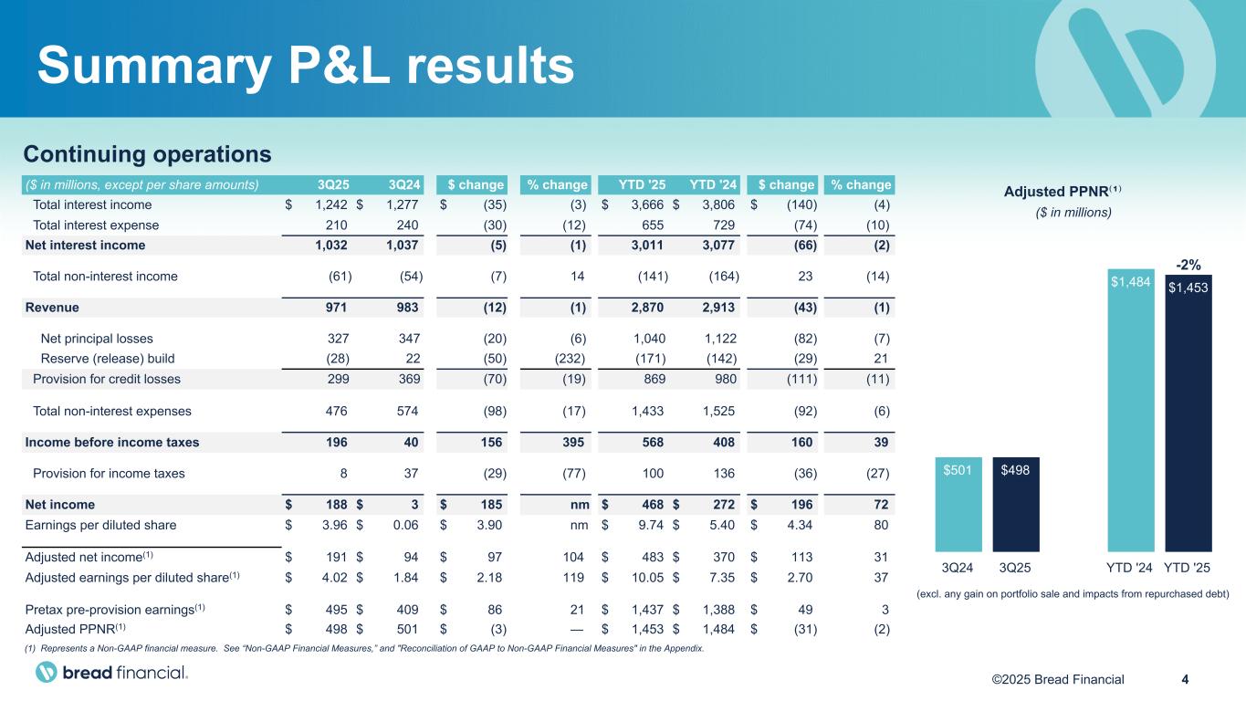 3©2025 Bread Financial $1.0 billion (1) Continuing operations excludes amounts associated with our former LoyaltyOne segment and our former Epsilon segment which previously have been disclosed as discontinued operations and classified accordingly. (2) Adjusted GAAP-basis figures are Non-GAAP financial measures. See “Non- GAAP Financial Measures” and "Reconciliation of GAAP to Non-GAAP Financial Measures". Continuing operations(1) Revenue Year-over-year comparisons • Credit sales were $6.8 billion for the third quarter of 2025, an increase of $0.3 billion, or 5%, driven by new partner growth and increased general-purpose spending. • Average and end-of-period loans were $17.6 billion, down 1%, and $17.7 billion, down 2%, respectively, due to an increasing payment rate and the ongoing effect of elevated gross losses. • Revenue decreased $12 million, or 1%, primarily due to lower billed late fees resulting from lower delinquencies, higher retailer share arrangements, and a $4 million gain on portfolio sale in the prior year, partially offset by lower interest expense and the implementation of pricing changes and paper statement fees. • Total non-interest expenses decreased $98 million, or 17%, driven by the prior year impact from repurchased debt. Excluding the impacts from our repurchased debt, adjusted total non-interest expenses(2) decreased $5 million, or 1%, driven by our continued operational excellence initiatives. • Income from continuing operations increased $185 million, reflecting the prior year impact of $91 million from our repurchased debt, and the current year impacts from a lower provision for credit losses, and a $38 million favorable discrete tax item. Excluding the impacts from our repurchased debt, adjusted income from continuing operations(2) increased $97 million, or 104%. • The delinquency rate of 6.0% decreased from 6.4% in the third quarter of 2024. • The net loss rate of 7.4% decreased from 7.8% in the third quarter of 2024. Diluted EPS Adj. diluted EPS(2) Net income Adj. net income(2) $188 million $191 million $4.02$3.96 Third quarter 2025 financial highlights Impacts from repurchased debt ($ in millions, except per share amounts) Total non-interest expenses Income from cont. ops. Diluted EPS from cont. ops. 3Q24 3Q25 3Q24 3Q25 3Q24 3Q25 GAAP-basis $ 574 $ 476 $ 3 $ 188 $ 0.06 $ 3.96 Impacts from repurchased debt 96 3 91 3 1.78 0.06 Adjusted GAAP-basis(2) $ 478 $ 473 $ 94 $ 191 $ 1.84 $ 4.02