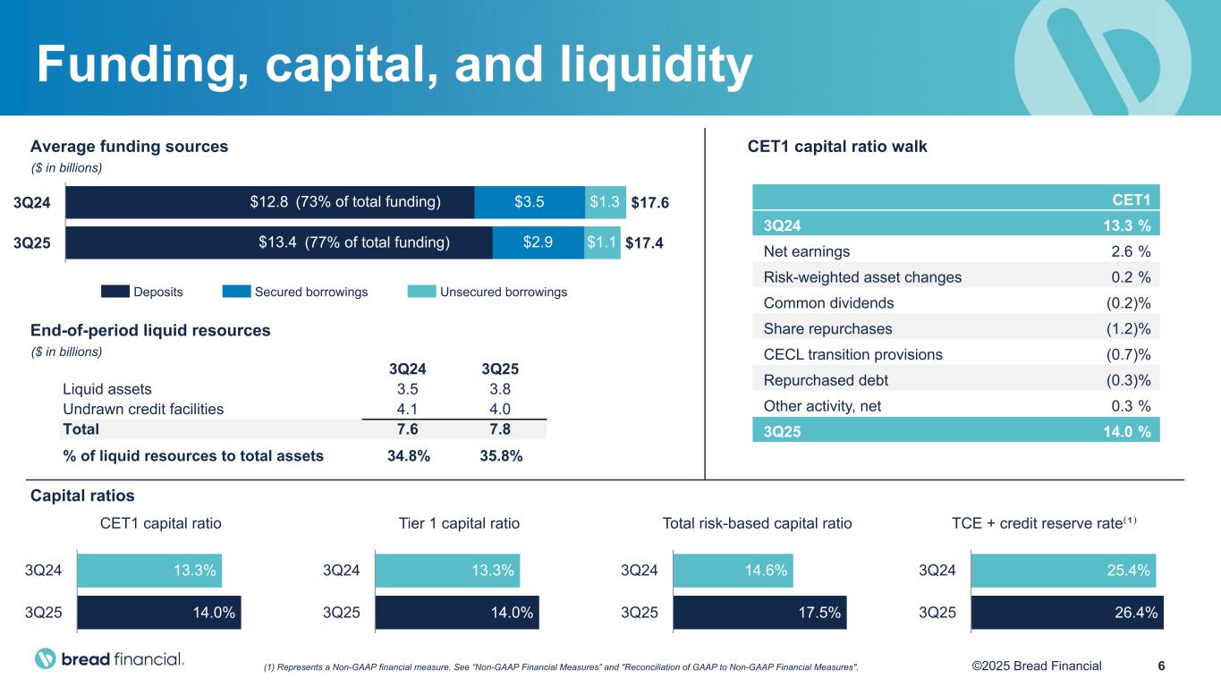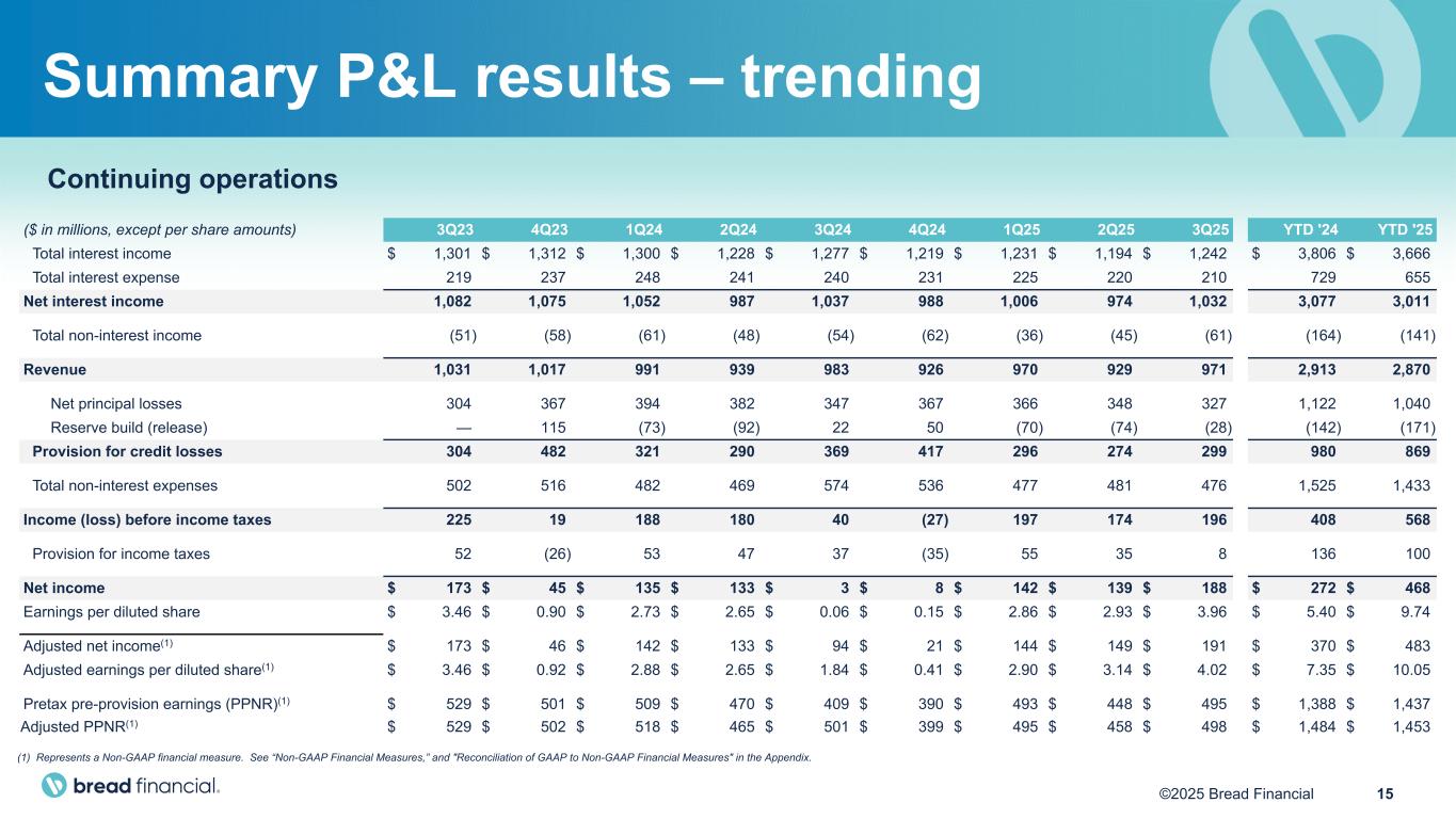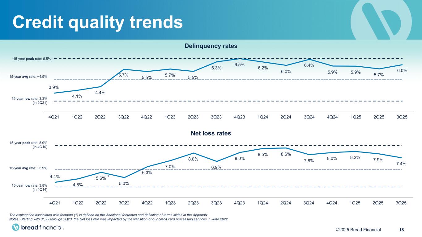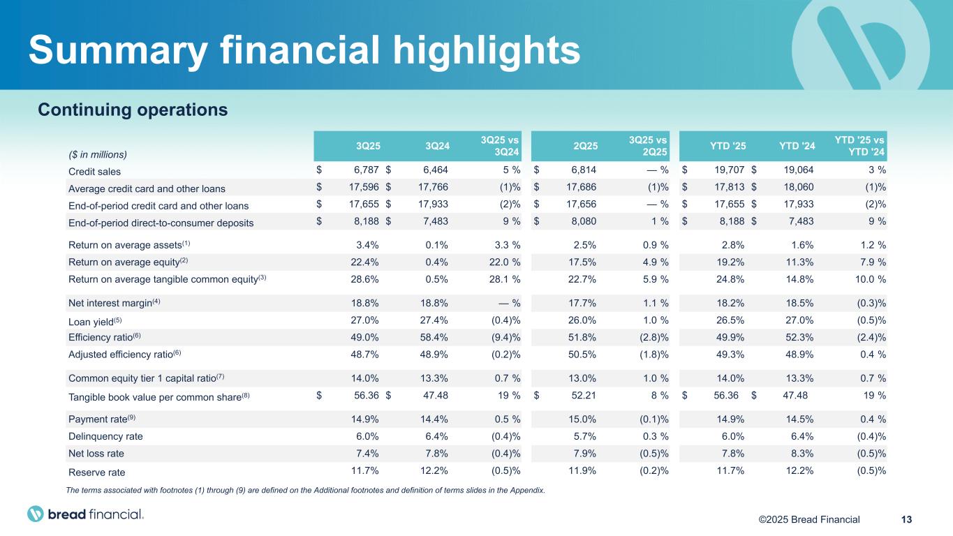 14©2025 Bread Financial Continuing operations ($ in millions) 3Q23 4Q23 1Q24 2Q24 3Q24 4Q24 1Q25 2Q25 3Q25 YTD '24 YTD '25 Credit sales $ 6,668 $ 7,802 $ 6,030 $ 6,570 $ 6,464 $ 7,898 $ 6,106 $ 6,814 $ 6,787 $ 19,064 $ 19,707 Year-over-year change (13) % (23) % (18) % (7) % (3) % 1 % 1 % 4 % 5 % (10) % 3 % Average credit card and other loans $ 17,540 $ 18,267 $ 18,546 $ 17,872 $ 17,766 $ 18,156 $ 18,164 $ 17,686 $ 17,596 $ 18,060 $ 17,813 Year-over-year change — % (8) % (4) % 1 % 1 % (1) % (2) % (1) % (1) % (1) % (1) % End-of-period credit card and other loans $ 17,922 $ 19,333 $ 18,185 $ 17,743 $ 17,933 $ 18,896 $ 17,815 $ 17,656 $ 17,655 $ 17,933 $ 17,655 Year-over-year change (1) % (10) % 1 % (1) % — % (2) % (2) % — % (2) % — % (2) % End-of-period direct-to-consumer deposits $ 6,098 $ 6,454 $ 6,984 $ 7,193 $ 7,483 $ 7,687 $ 7,922 $ 8,080 $ 8,188 $ 7,483 $ 8,188 Year-over-year change 18 % 18 % 24 % 20 % 23 % 19 % 13 % 12 % 9 % 23 % 9 % Return on average assets(1) 3.2 % 0.8 % 2.4 % 2.4 % 0.1 % 0.1 % 2.5 % 2.5 % 3.4 % 1.6 % 2.8 % Return on average equity(2) 24.8 % 6.2 % 17.5 % 16.7 % 0.4 % 0.9 % 17.7 % 17.5 % 22.4 % 11.3 % 19.2 % Return on average tangible common equity(3) 34.3 % 8.5 % 23.1 % 21.8 % 0.5 % 1.2 % 23.0 % 22.7 % 28.6 % 14.8 % 24.8 % Net interest margin(4) 20.6 % 19.6 % 18.7 % 18.0 % 18.8 % 17.8 % 18.1 % 17.7 % 18.8 % 18.5 % 18.2 % Loan yield(5) 28.6 % 27.7 % 27.0 % 26.4 % 27.4 % 25.7 % 26.5 % 26.0 % 27.0 % 27.0 % 26.5 % Efficiency ratio(6) 48.7 % 50.8 % 48.6 % 49.9 % 58.4 % 57.8 % 49.1 % 51.8 % 49.0 % 52.3 % 49.9 % Adjusted efficiency ratio(6) 48.7 % 50.7 % 47.6 % 50.2 % 48.9 % 56.7 % 48.9 % 50.5 % 48.7 % 48.9 % 49.3 % Common equity tier 1 capital ratio(7) 12.9 % 12.2 % 12.6 % 13.8 % 13.3 % 12.4 % 12.0 % 13.0 % 14.0 % 13.3 % 14.0 % Tangible book value per common share(8) $ 42.45 $ 43.70 $ 45.96 $ 48.89 $ 47.48 $ 46.97 $ 48.92 $ 52.21 $ 56.36 $ 47.48 $ 56.36 Payment rate(9) 14.5 % 14.2 % 14.4 % 14.6 % 14.4 % 14.7 % 14.8 % 15.0 % 14.9 % 14.5 % 14.9 % Delinquency rate 6.3 % 6.5 % 6.2 % 6.0 % 6.4 % 5.9 % 5.9 % 5.7 % 6.0 % 6.4 % 6.0 % Net loss rate 6.9 % 8.0 % 8.5 % 8.6 % 7.8 % 8.0 % 8.2 % 7.9 % 7.4 % 8.3 % 7.8 % Reserve rate 12.3 % 12.0 % 12.4 % 12.2 % 12.2 % 11.9 % 12.2 % 11.9 % 11.7 % 12.2 % 11.7 % The terms associated with footnotes (1) through (9) are defined on the Additional footnotes and definition of terms slides in the Appendix. Summary financial highlights – trending