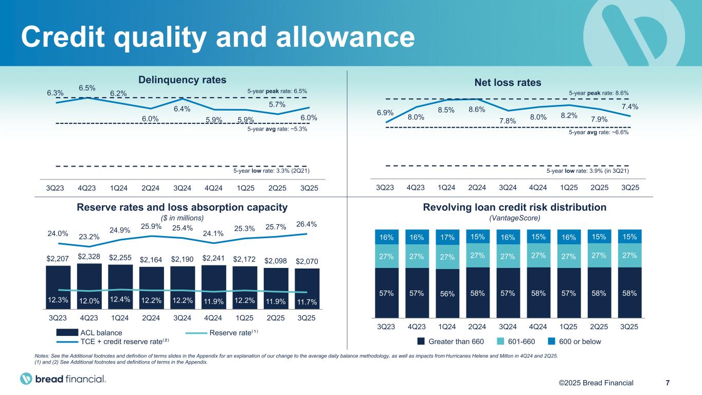 6©2025 Bread Financial Funding, capital, and liquidity $17.6 $17.4 $12.8 $13.4 $3.5 $2.9 $1.3 $1.1 Deposits Secured borrowings Unsecured borrowings 3Q24 3Q25 CET1 3Q24 13.3 % Net earnings 2.6 % Risk-weighted asset changes 0.2 % Common dividends (0.2) % Share repurchases (1.2) % CECL transition provisions (0.7) % Repurchased debt (0.3) % Other activity, net 0.3 % 3Q25 14.0 % CET1 capital ratio 13.3% 14.0% 3Q24 3Q25 Tier 1 capital ratio 13.3% 14.0% 3Q24 3Q25 TCE + credit reserve rate⁽¹⁾ 25.4% 26.4% 3Q24 3Q25 Total risk-based capital ratio 14.6% 17.5% 3Q24 3Q25 CET1 capital ratio walk Capital ratios Average funding sources 3Q24 3Q25 Liquid assets 3.5 3.8 Undrawn credit facilities 4.1 4.0 Total 7.6 7.8 % of liquid resources to total assets 34.8% 35.8% (1) Represents a Non-GAAP financial measure. See “Non-GAAP Financial Measures” and "Reconciliation of GAAP to Non-GAAP Financial Measures". ($ in billions) (77% of total funding) (73% of total funding) End-of-period liquid resources ($ in billions)