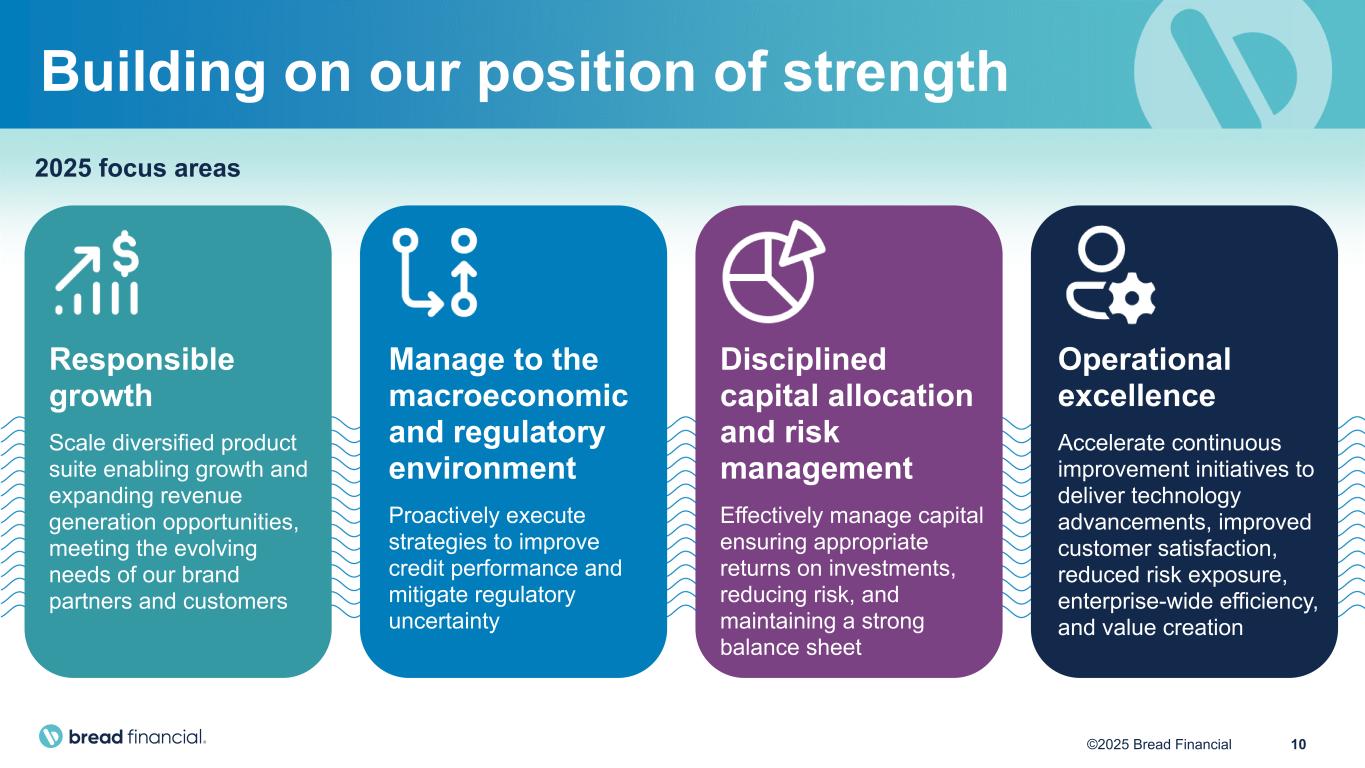 10©2025 Bread Financial Building on our position of strength Manage to the macroeconomic and regulatory environment Proactively execute strategies to improve credit performance and mitigate regulatory uncertainty Operational excellence Accelerate continuous improvement initiatives to deliver technology advancements, improved customer satisfaction, reduced risk exposure, enterprise-wide efficiency, and value creation Disciplined capital allocation and risk management Effectively manage capital ensuring appropriate returns on investments, reducing risk, and maintaining a strong balance sheet Responsible growth Scale diversified product suite enabling growth and expanding revenue generation opportunities, meeting the evolving needs of our brand partners and customers 2025 focus areas