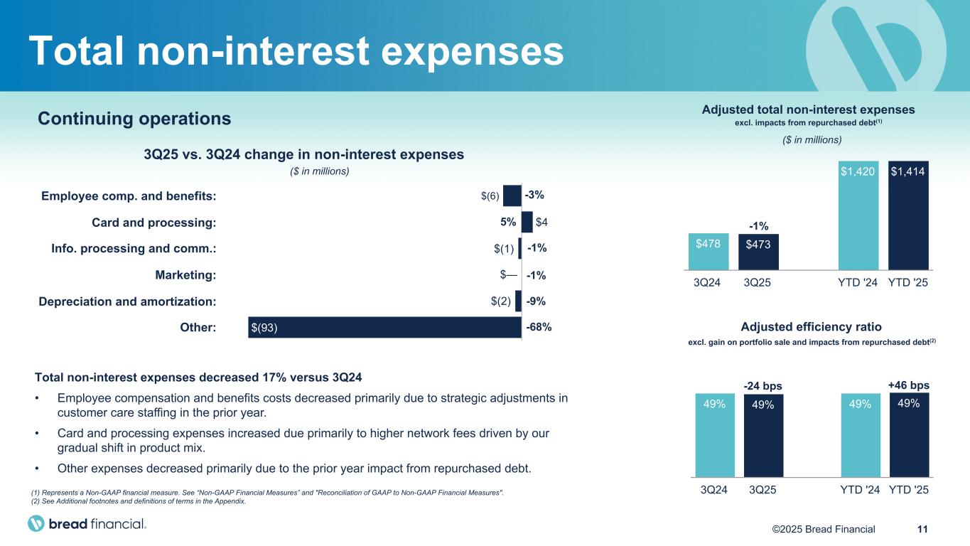 23©2025 Bread Financial Reconciliation of GAAP to Non-GAAP financial measures ($ in millions, except per share amounts) 3Q23 4Q23 1Q24 2Q24 3Q24 4Q24 1Q25 2Q25 3Q25 YTD '24 YTD '25 Adjusted total non-interest expenses Total non-interest expenses $ 502 $ 516 $ 482 $ 469 $ 574 $ 536 $ 477 $ 481 $ 476 $ 1,525 $ 1,433 Impacts from repurchased debt — 1 9 — 96 11 2 13 3 105 19 Adjusted total non-interest expenses $ 502 $ 515 $ 473 $ 469 $ 478 $ 525 $ 475 $ 468 $ 473 $ 1,420 $ 1,414 Income from continuing operations, net of taxes $ 173 $ 45 $ 135 $ 133 $ 3 $ 8 $ 142 $ 139 $ 188 $ 272 $ 468 Loss from discontinued operations, net of taxes (2) (2) (1) — (1) (1) (4) — — (2) (4) Net income $ 171 $ 43 $ 134 $ 133 $ 2 $ 7 $ 138 $ 139 $ 188 $ 270 $ 464 Impacts from repurchased debt — 1 7 — 91 13 2 10 3 98 15 Adjusted net income $ 171 $ 44 $ 141 $ 133 $ 93 $ 20 $ 140 $ 149 $ 191 $ 368 $ 479 Adjusted income from continuing operations, net of taxes $ 173 $ 46 $ 142 $ 133 $ 94 $ 21 $ 144 $ 149 $ 191 $ 370 $ 483 Weighted average shares outstanding – diluted 50.1 49.6 49.7 50.2 51.0 50.9 49.6 47.2 47.5 50.3 48.1 Income from continuing operations per diluted share $ 3.46 $ 0.90 $ 2.73 $ 2.65 $ 0.06 $ 0.15 $ 2.86 $ 2.93 $ 3.96 $ 5.40 $ 9.74 (Loss) income from discontinued operations per diluted share (0.04) (0.03) (0.03) 0.01 (0.01) (0.01) (0.08) 0.01 — (0.03) (0.09) Net income per diluted share $ 3.42 $ 0.87 $ 2.70 $ 2.66 $ 0.05 $ 0.14 $ 2.78 $ 2.94 $ 3.96 $ 5.37 $ 9.65 Impacts from repurchased debt — 0.02 0.15 — 1.78 0.26 0.04 0.21 0.06 1.95 0.31 Adjusted net income per diluted share $ 3.42 $ 0.89 $ 2.85 $ 2.66 $ 1.83 $ 0.40 $ 2.82 $ 3.15 $ 4.02 $ 7.32 $ 9.96 Adjusted income from continuing operations per diluted share $ 3.46 $ 0.92 $ 2.88 $ 2.65 $ 1.84 $ 0.41 $ 2.90 $ 3.14 $ 4.02 $ 7.35 $ 10.05 Continued on the following page