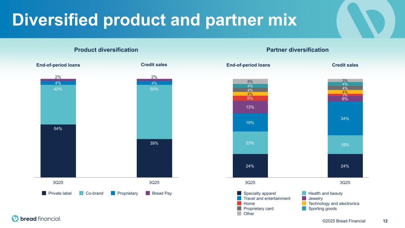 11©2025 Bread Financial Continuing operations Total non-interest expenses decreased 17% versus 3Q24 • Employee compensation and benefits costs decreased primarily due to strategic adjustments in customer care staffing in the prior year. • Card and processing expenses increased due primarily to higher network fees driven by our gradual shift in product mix. • Other expenses decreased primarily due to the prior year impact from repurchased debt. Adjusted efficiency ratio 49% 49% 49% 49% 3Q24 3Q25 YTD '24 YTD '25 Adjusted total non-interest expenses $478 $473 $1,420 $1,414 3Q24 3Q25 YTD '24 YTD '25 Total non-interest expenses $(6) $4 $(1) $— $(2) $(93) Employee comp. and benefits: Card and processing: Info. processing and comm.: Marketing: Depreciation and amortization: Other: -3% 5% -1% -1% -9% -68% 3Q25 vs. 3Q24 change in non-interest expenses (1) Represents a Non-GAAP financial measure. See “Non-GAAP Financial Measures” and "Reconciliation of GAAP to Non-GAAP Financial Measures". (2) See Additional footnotes and definitions of terms in the Appendix. ($ in millions) -24 bps ($ in millions) +46 bps excl. impacts from repurchased debt(1) excl. gain on portfolio sale and impacts from repurchased debt(2) -1%