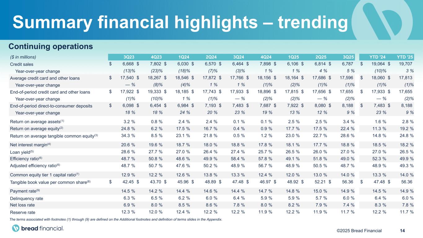 13©2025 Bread Financial Continuing operations ($ in millions) 3Q25 3Q24 3Q25 vs 3Q24 2Q25 3Q25 vs 2Q25 YTD '25 YTD '24 YTD '25 vs YTD '24 Credit sales $ 6,787 $ 6,464 5 % $ 6,814 — % $ 19,707 $ 19,064 3 % Average credit card and other loans $ 17,596 $ 17,766 (1) % $ 17,686 (1) % $ 17,813 $ 18,060 (1) % End-of-period credit card and other loans $ 17,655 $ 17,933 (2) % $ 17,656 — % $ 17,655 $ 17,933 (2) % End-of-period direct-to-consumer deposits $ 8,188 $ 7,483 9 % $ 8,080 1 % $ 8,188 $ 7,483 9 % Return on average assets(1) 3.4% 0.1% 3.3 % 2.5% 0.9 % 2.8% 1.6% 1.2 % Return on average equity(2) 22.4% 0.4% 22.0 % 17.5% 4.9 % 19.2% 11.3% 7.9 % Return on average tangible common equity(3) 28.6% 0.5% 28.1 % 22.7% 5.9 % 24.8% 14.8% 10.0 % Net interest margin(4) 18.8% 18.8% — % 17.7% 1.1 % 18.2% 18.5% (0.3) % Loan yield(5) 27.0% 27.4% (0.4) % 26.0% 1.0 % 26.5% 27.0% (0.5) % Efficiency ratio(6) 49.0% 58.4% (9.4) % 51.8% (2.8) % 49.9% 52.3% (2.4) % Adjusted efficiency ratio(6) 48.7% 48.9% (0.2) % 50.5% (1.8) % 49.3% 48.9% 0.4 % Common equity tier 1 capital ratio(7) 14.0% 13.3% 0.7 % 13.0% 1.0 % 14.0% 13.3% 0.7 % Tangible book value per common share(8) $ 56.36 $ 47.48 19 % $ 52.21 8 % $ 56.36 $ 47.48 19 % Payment rate(9) 14.9% 14.4% 0.5 % 15.0% (0.1) % 14.9% 14.5% 0.4 % Delinquency rate 6.0% 6.4% (0.4) % 5.7% 0.3 % 6.0% 6.4% (0.4) % Net loss rate 7.4% 7.8% (0.4) % 7.9% (0.5) % 7.8% 8.3% (0.5) % Reserve rate 11.7% 12.2% (0.5) % 11.9% (0.2) % 11.7% 12.2% (0.5) % The terms associated with footnotes (1) through (9) are defined on the Additional footnotes and definition of terms slides in the Appendix. Summary financial highlights