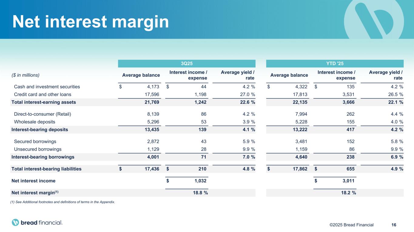 16©2025 Bread Financial 3Q25 YTD '25 ($ in millions) Average balance Interest income / expense Average yield / rate Average balance Interest income / expense Average yield / rate Cash and investment securities $ 4,173 $ 44 4.2 % $ 4,322 $ 135 4.2 % Credit card and other loans 17,596 1,198 27.0 % 17,813 3,531 26.5 % Total interest-earning assets 21,769 1,242 22.6 % 22,135 3,666 22.1 % Direct-to-consumer (Retail) 8,139 86 4.2 % 7,994 262 4.4 % Wholesale deposits 5,296 53 3.9 % 5,228 155 4.0 % Interest-bearing deposits 13,435 139 4.1 % 13,222 417 4.2 % Secured borrowings 2,872 43 5.9 % 3,481 152 5.8 % Unsecured borrowings 1,129 28 9.9 % 1,159 86 9.9 % Interest-bearing borrowings 4,001 71 7.0 % 4,640 238 6.9 % Total interest-bearing liabilities $ 17,436 $ 210 4.8 % $ 17,862 $ 655 4.9 % Net interest income $ 1,032 $ 3,011 Net interest margin(1) 18.8 % 18.2 % (1) See Additional footnotes and definitions of terms in the Appendix. Net interest margin