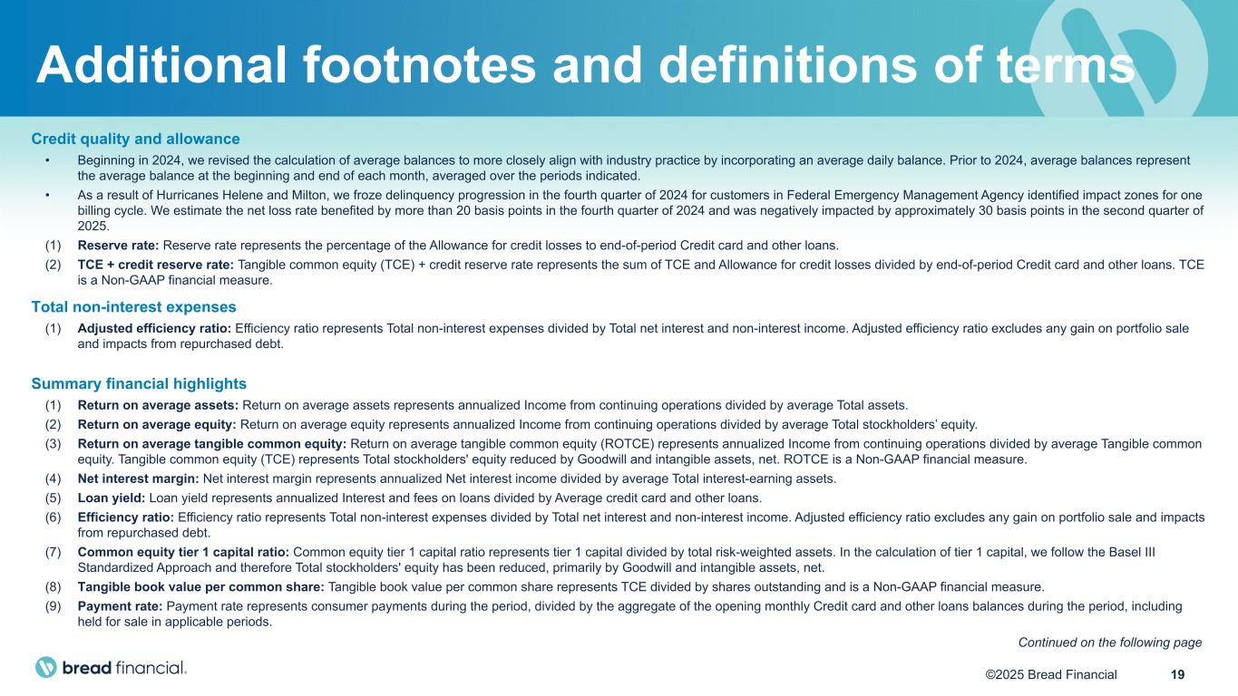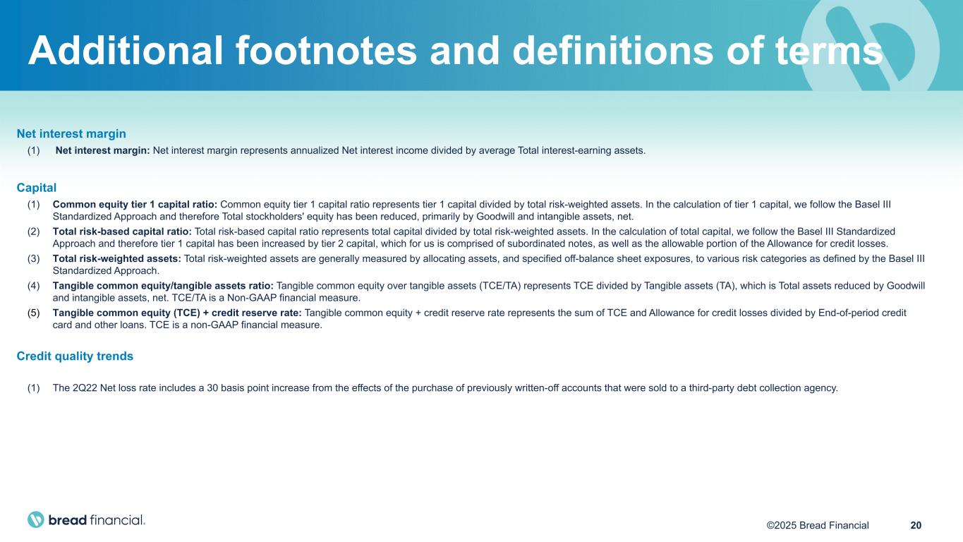 19©2025 Bread Financial Additional footnotes and definitions of terms Credit quality and allowance • Beginning in 2024, we revised the calculation of average balances to more closely align with industry practice by incorporating an average daily balance. Prior to 2024, average balances represent the average balance at the beginning and end of each month, averaged over the periods indicated. • As a result of Hurricanes Helene and Milton, we froze delinquency progression in the fourth quarter of 2024 for customers in Federal Emergency Management Agency identified impact zones for one billing cycle. We estimate the net loss rate benefited by more than 20 basis points in the fourth quarter of 2024 and was negatively impacted by approximately 30 basis points in the second quarter of 2025. (1) Reserve rate: Reserve rate represents the percentage of the Allowance for credit losses to end-of-period Credit card and other loans. (2) TCE + credit reserve rate: Tangible common equity (TCE) + credit reserve rate represents the sum of TCE and Allowance for credit losses divided by end-of-period Credit card and other loans. TCE is a Non-GAAP financial measure. Total non-interest expenses (1) Adjusted efficiency ratio: Efficiency ratio represents Total non-interest expenses divided by Total net interest and non-interest income. Adjusted efficiency ratio excludes any gain on portfolio sale and impacts from repurchased debt. Summary financial highlights (1) Return on average assets: Return on average assets represents annualized Income from continuing operations divided by average Total assets. (2) Return on average equity: Return on average equity represents annualized Income from continuing operations divided by average Total stockholders’ equity. (3) Return on average tangible common equity: Return on average tangible common equity (ROTCE) represents annualized Income from continuing operations divided by average Tangible common equity. Tangible common equity (TCE) represents Total stockholders' equity reduced by Goodwill and intangible assets, net. ROTCE is a Non-GAAP financial measure. (4) Net interest margin: Net interest margin represents annualized Net interest income divided by average Total interest-earning assets. (5) Loan yield: Loan yield represents annualized Interest and fees on loans divided by Average credit card and other loans. (6) Efficiency ratio: Efficiency ratio represents Total non-interest expenses divided by Total net interest and non-interest income. Adjusted efficiency ratio excludes any gain on portfolio sale and impacts from repurchased debt. (7) Common equity tier 1 capital ratio: Common equity tier 1 capital ratio represents tier 1 capital divided by total risk-weighted assets. In the calculation of tier 1 capital, we follow the Basel III Standardized Approach and therefore Total stockholders' equity has been reduced, primarily by Goodwill and intangible assets, net. (8) Tangible book value per common share: Tangible book value per common share represents TCE divided by shares outstanding and is a Non-GAAP financial measure. (9) Payment rate: Payment rate represents consumer payments during the period, divided by the aggregate of the opening monthly Credit card and other loans balances during the period, including held for sale in applicable periods. Continued on the following page